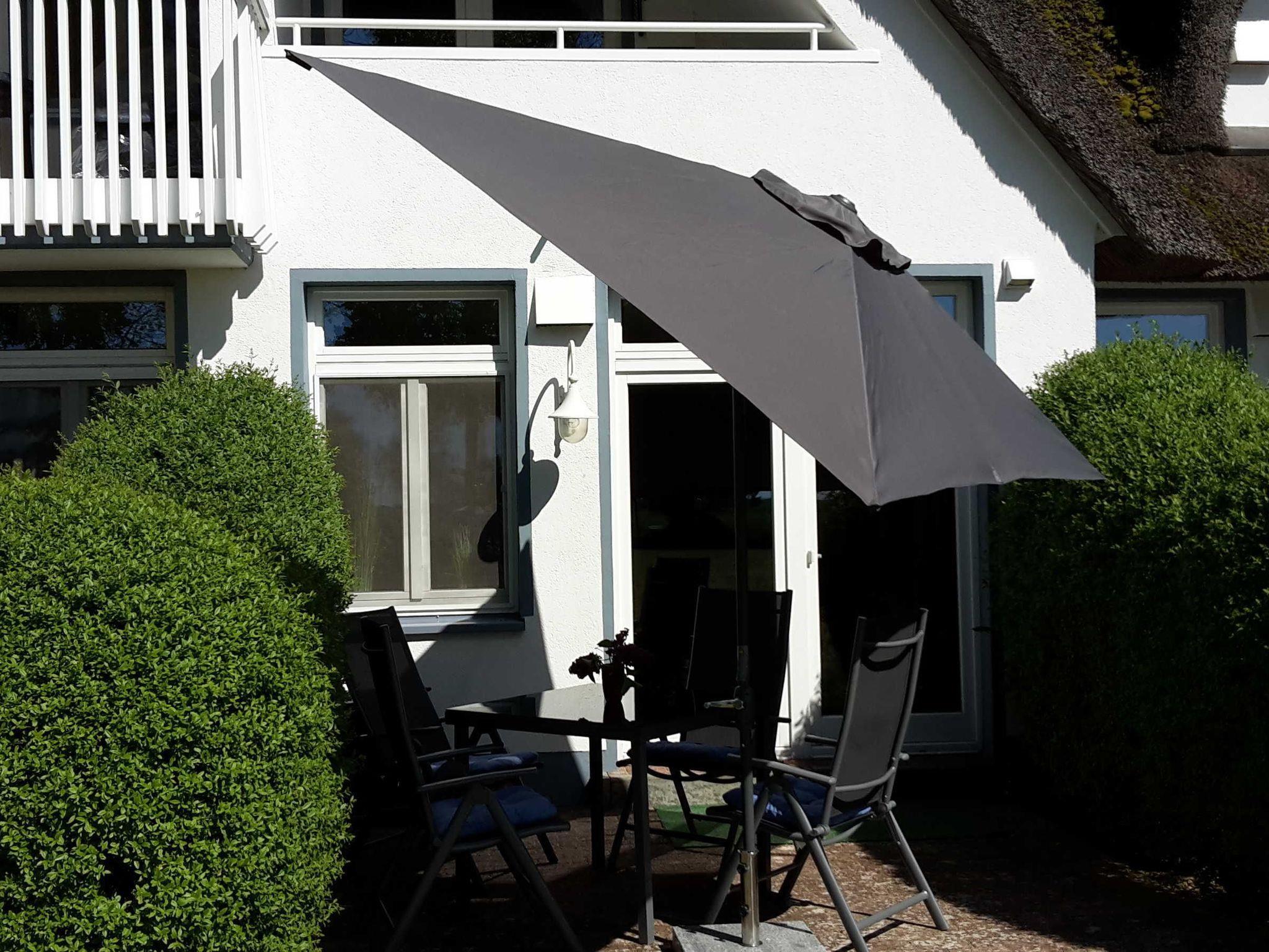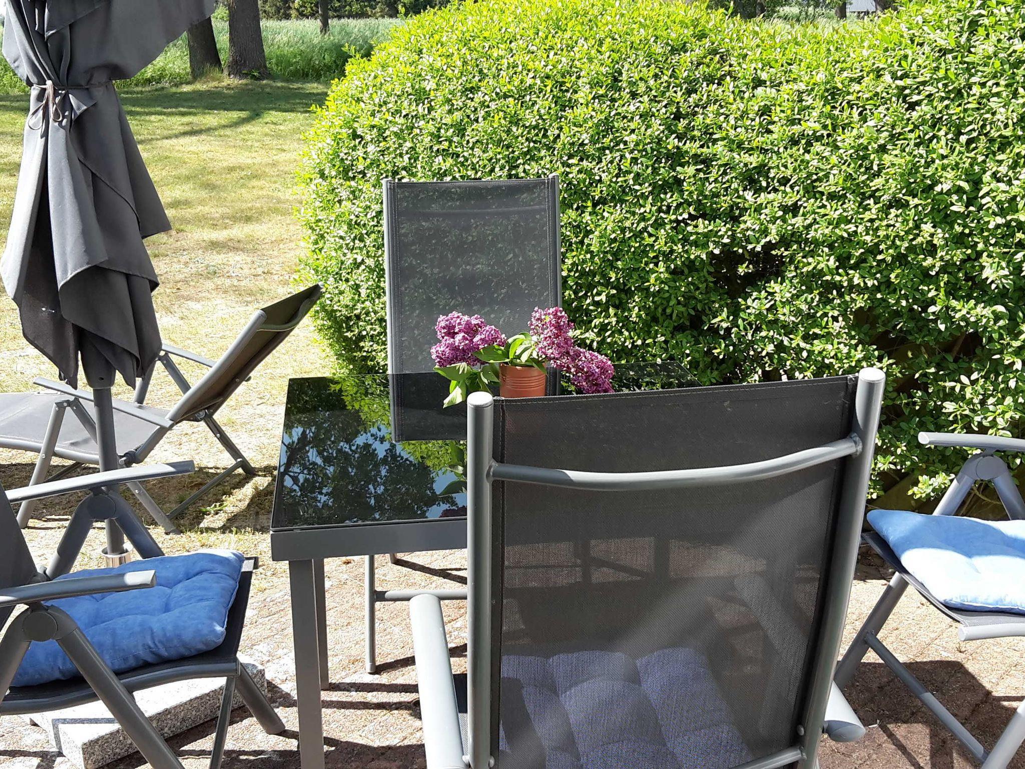 Zur Wohnung gehört eine Terrasse mit Sitzgruppe. Fahrräder können im Ort entliehen werden.