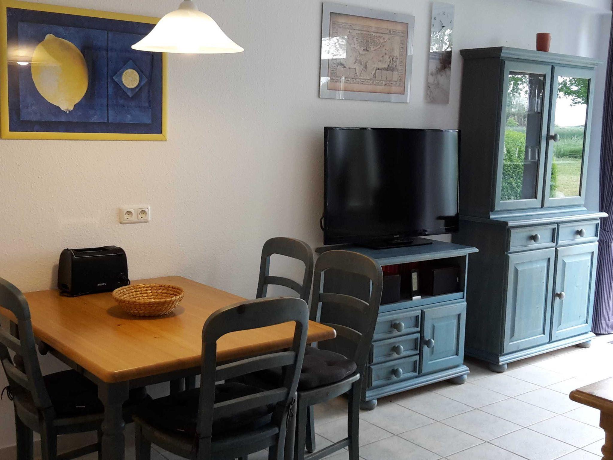 Die Zwei-Zimmer-Wohnung ist mit massiven Landhausmöbeln ausgestattet. Im Wohnzimmer kann man es sich auf der ausziehbaren Couch gemütlich machen. Dabei sorgen ein großer Flachbild-TV mit Sat-Anschluss und eine Stereoanlage für Unterhaltung. Im Zimmer integriert befindet sich eine Küchenzeile mit Esstisch und 4 Stühlen.