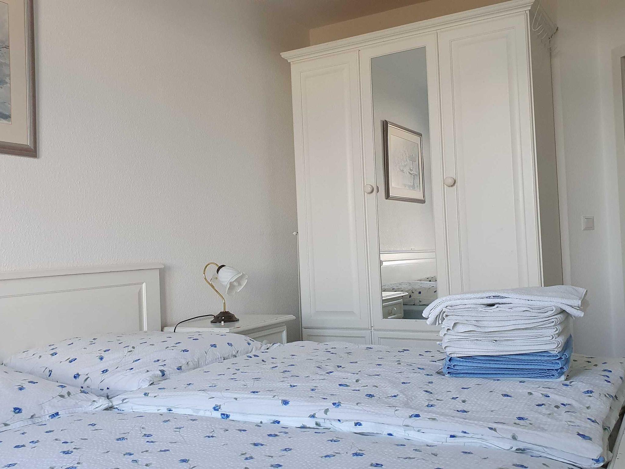 Das Schlafzimmer besitzt als Möblierung ein Doppelbett mit Nachttischen und Wäscheschrank.