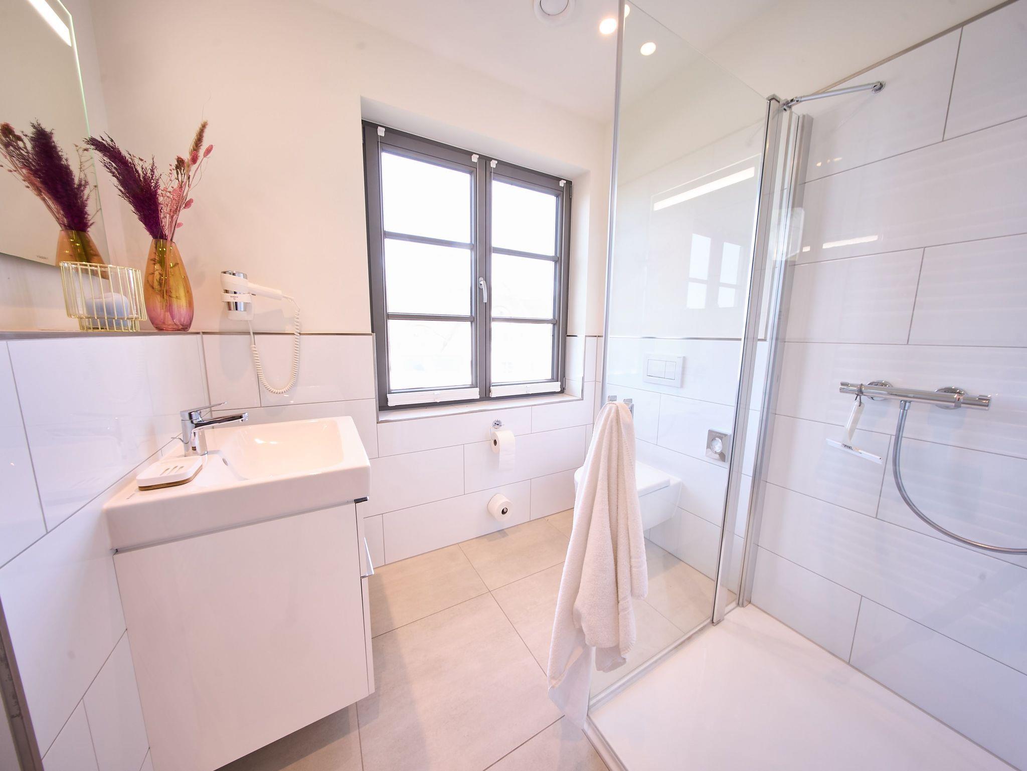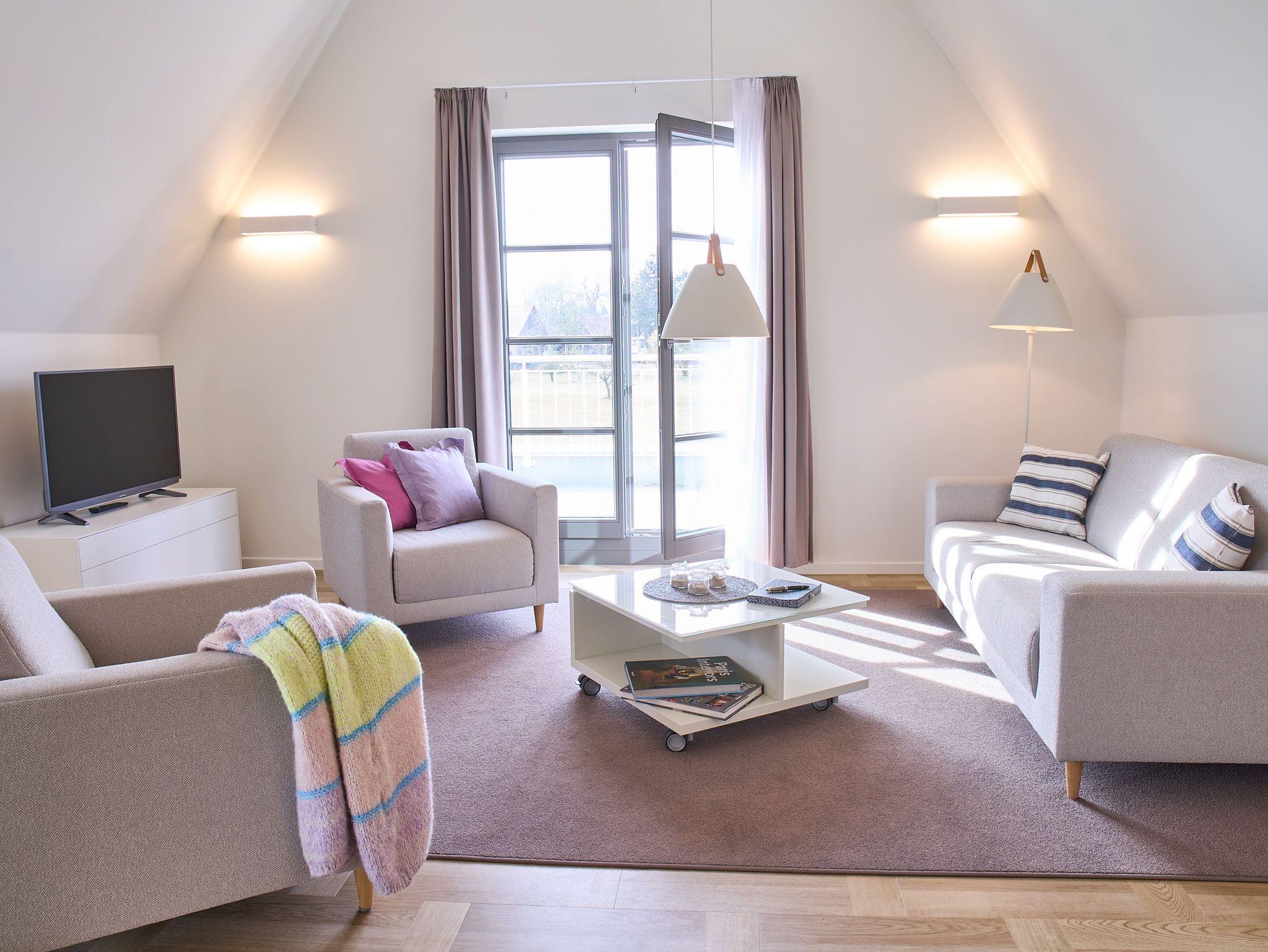 Ebenfalls verfügt die Wohnung über eine Waschmaschine. Der Wohnraum ist durch die ca. vier Meter hohe offene Decke geprägt und die fast 12 qm große Dachterrasse bietet einen weiten Blick über die Felder auf das Haff und das Wasser. Das große Tageslichtbad ist mit einer bodentiefen Dusche mit Glasabtrennung ausgestattet. Das Hauptschlafzimmer verfügt über ein Doppelbett und das zweite Schlafzimmer über zwei Einzelbetten. Bei allen Betten handelt es sich um Boxspringbetten. Im Wohnzimmer, sowie in einem Schlafzimmer befindet sich jeweils ein Flachbildschirm. Kinderreisebett sowie Hochstuhl können nach Verfügbarkeit bei der Verwalterin telefonisch gegen Gebühr bestellt werden.