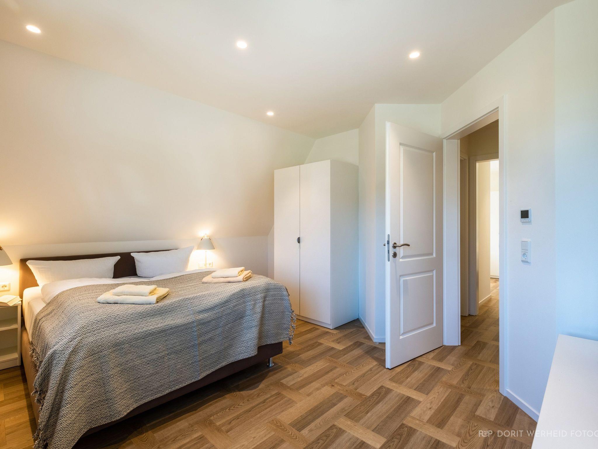 Im Obergeschoss finden Sie drei Schlafzimmer sowie zwei Bäder vor. Zwei der Schlafzimmer verfügen über ein großes Doppelbett, das dritte Zimmer über zwei Einzelbetten (alles Boxspring). Das Elternschlafzimmer ist zusätzlich mit einem Flachbild-TV ausgestattet und ein Badezimmer befindet sich en Suite.