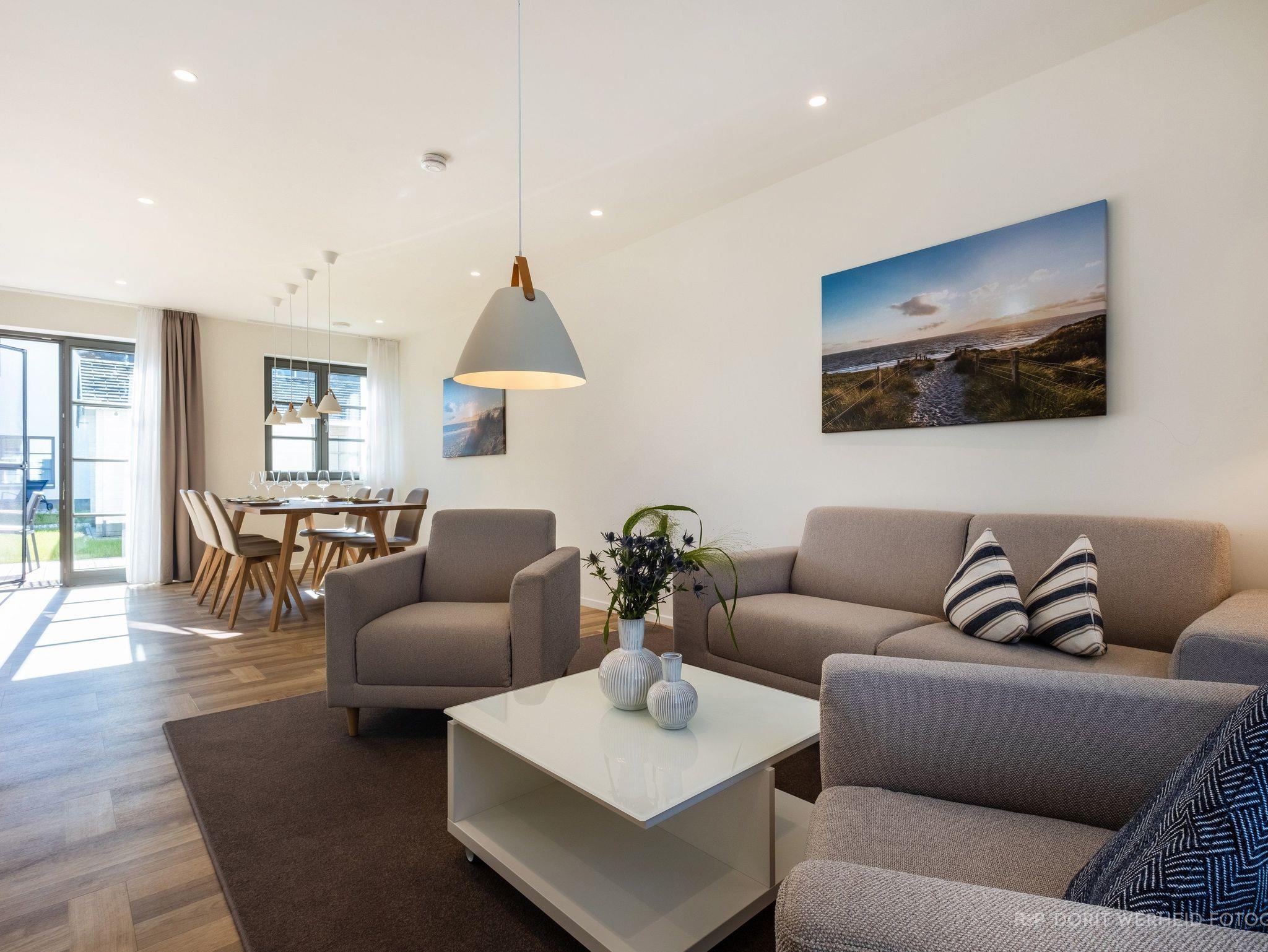 Die komplett eingerichtete Wohnküche verfügt über Spülmaschine, Mikrowelle, Induktionsherd und großem Kühlschrank mit separatem Gefrierfach sowie Kaffeemaschine, Wasserkocher und Toaster. Ein Esstisch für 6 Personen sowie eine gemütliche Wohnlandschaft mit Flachbild-TV und Musikanlage.