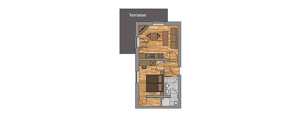 Es hat einen Wohn-Essbereich, eine komplett ausgestattete Küche ( inkl. Geschirrspüler ), ein Schlafzimmer mit Komfortbett und ein Badezimmer mit Dusche und WC