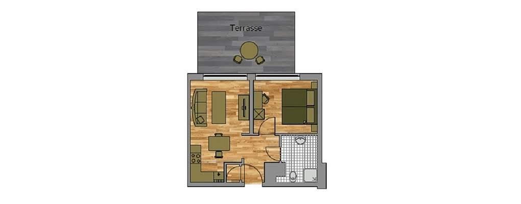 2 Zimmerappartement, für 2-4 Personen, 1 Schlafzimmer mit Doppelbett, 1 Schlafcouch im Wohnbereich, Bad mit Dusche, offene Küchenzeile, Südterrasse, Fernseher, WLAN, Parkplatz