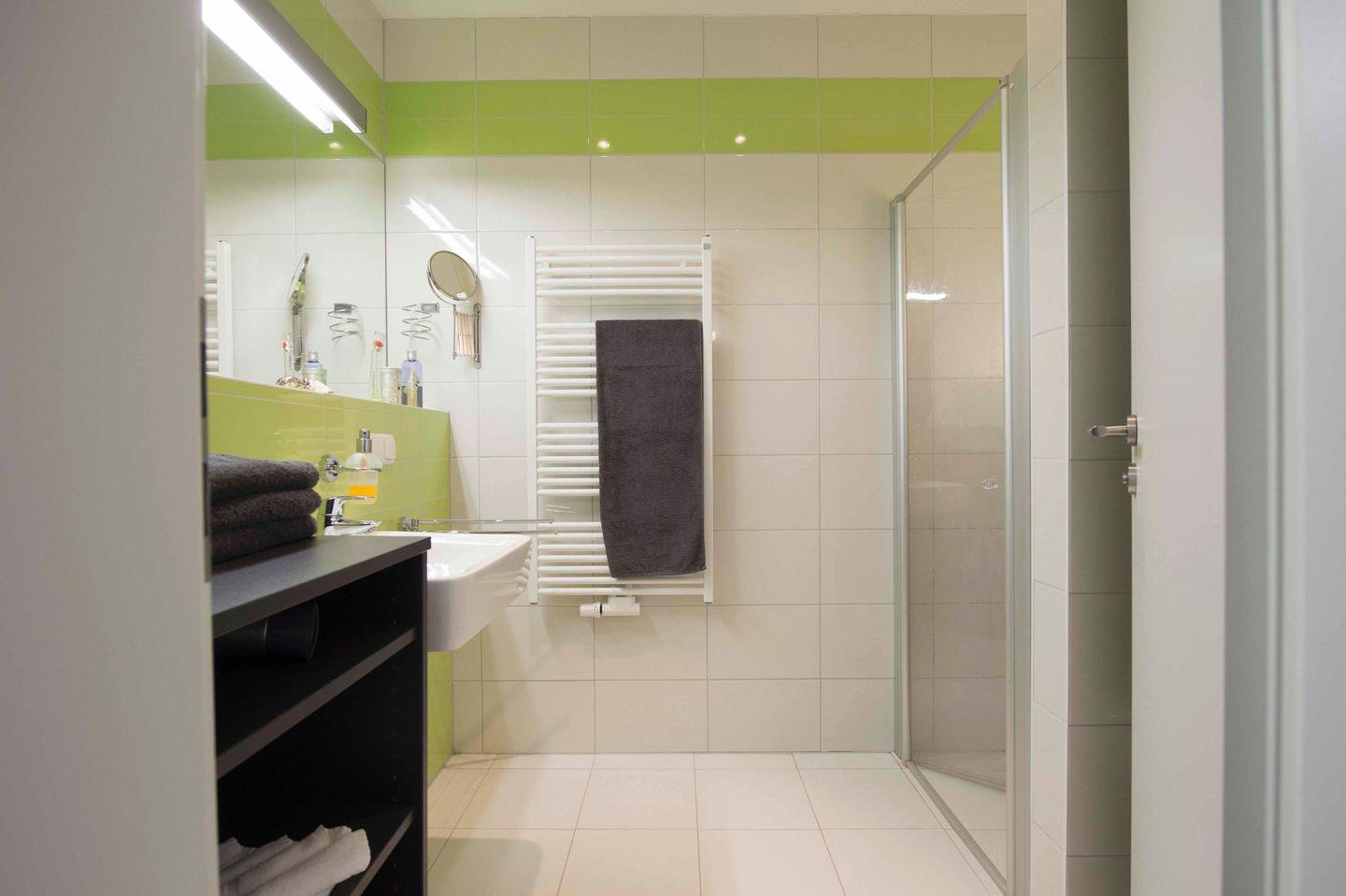 Im modernen Bad finden Sie einen Waschtisch und eine Dusche.