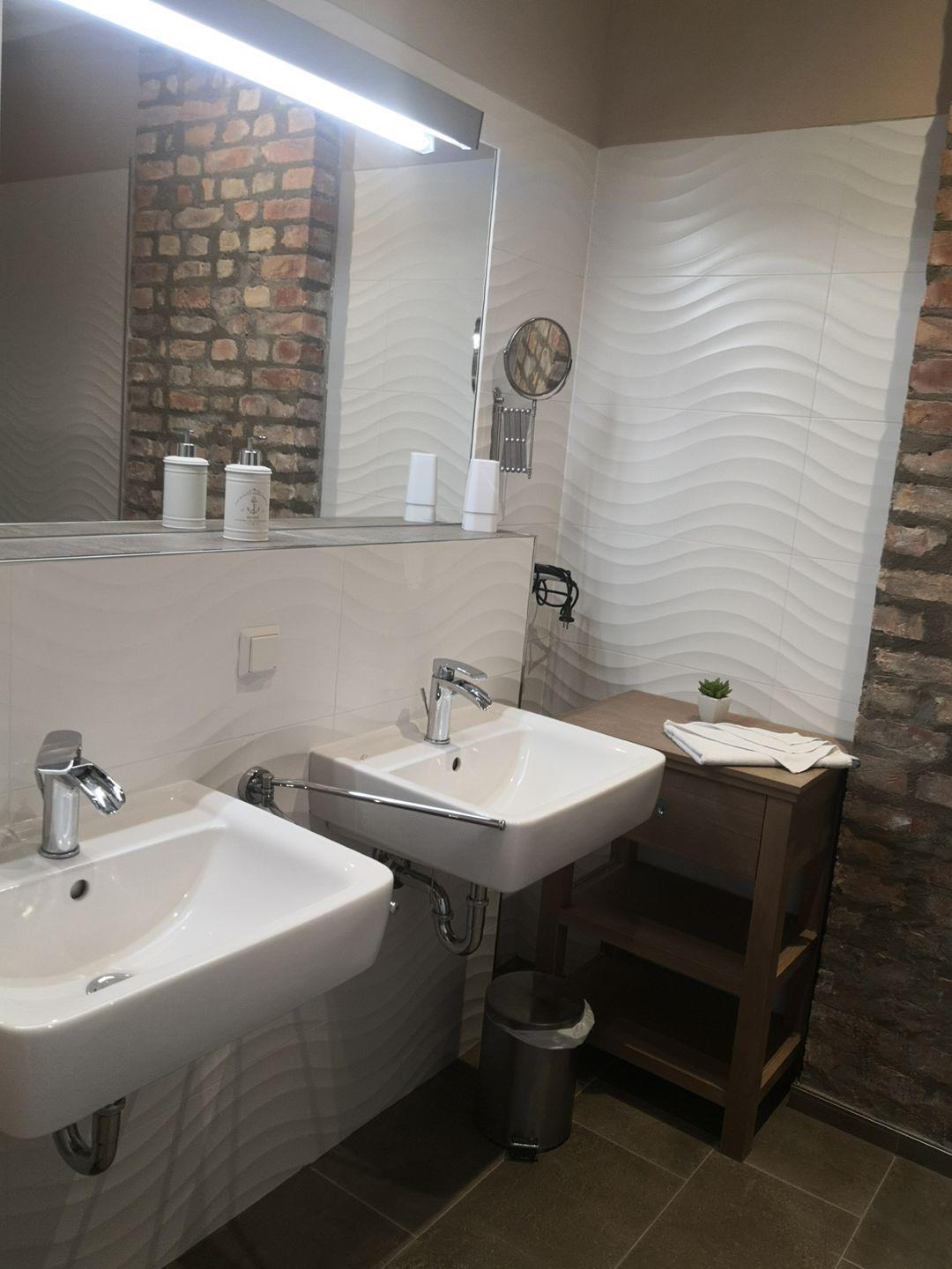 Das Duschbad mit WC, Doppelwaschtisch, Fön, und Kosmetikspiegel ist ausreichend groß.