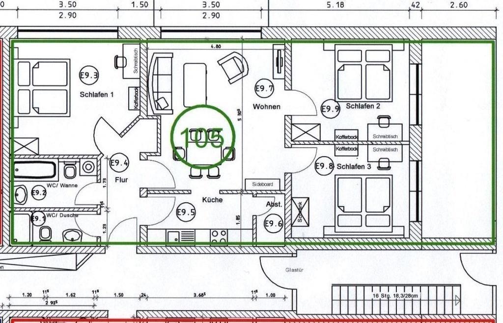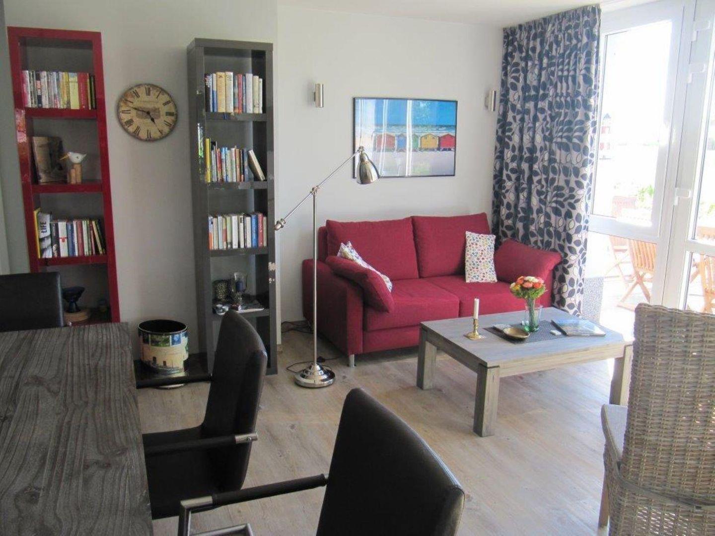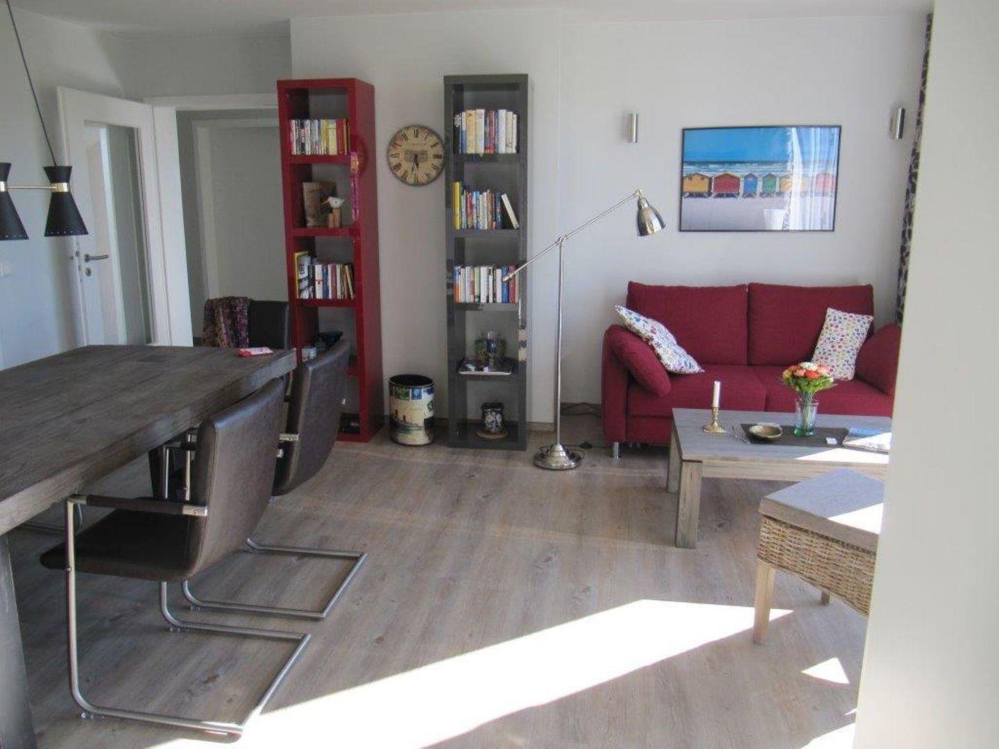 Im Wohn-/ Eßbereich finden Sie den für 8 Personen ausreichend großen Esstisch mit entsprechender Bestuhlung, Bücherregale, Sofa, Flat-TV, DVD/CD-Player, eine Sammlung CDs. DVDs, und Bücher.