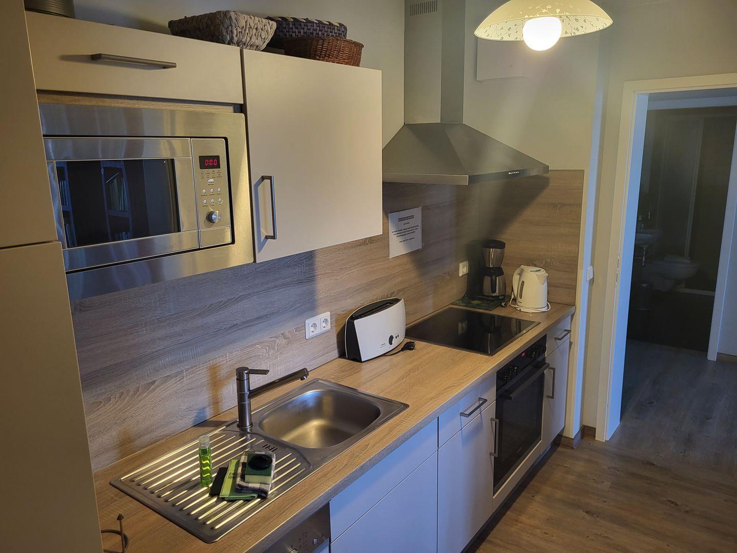 Die mit einer Schiebetür abgetrennte Küche ist voll ausgestattet.