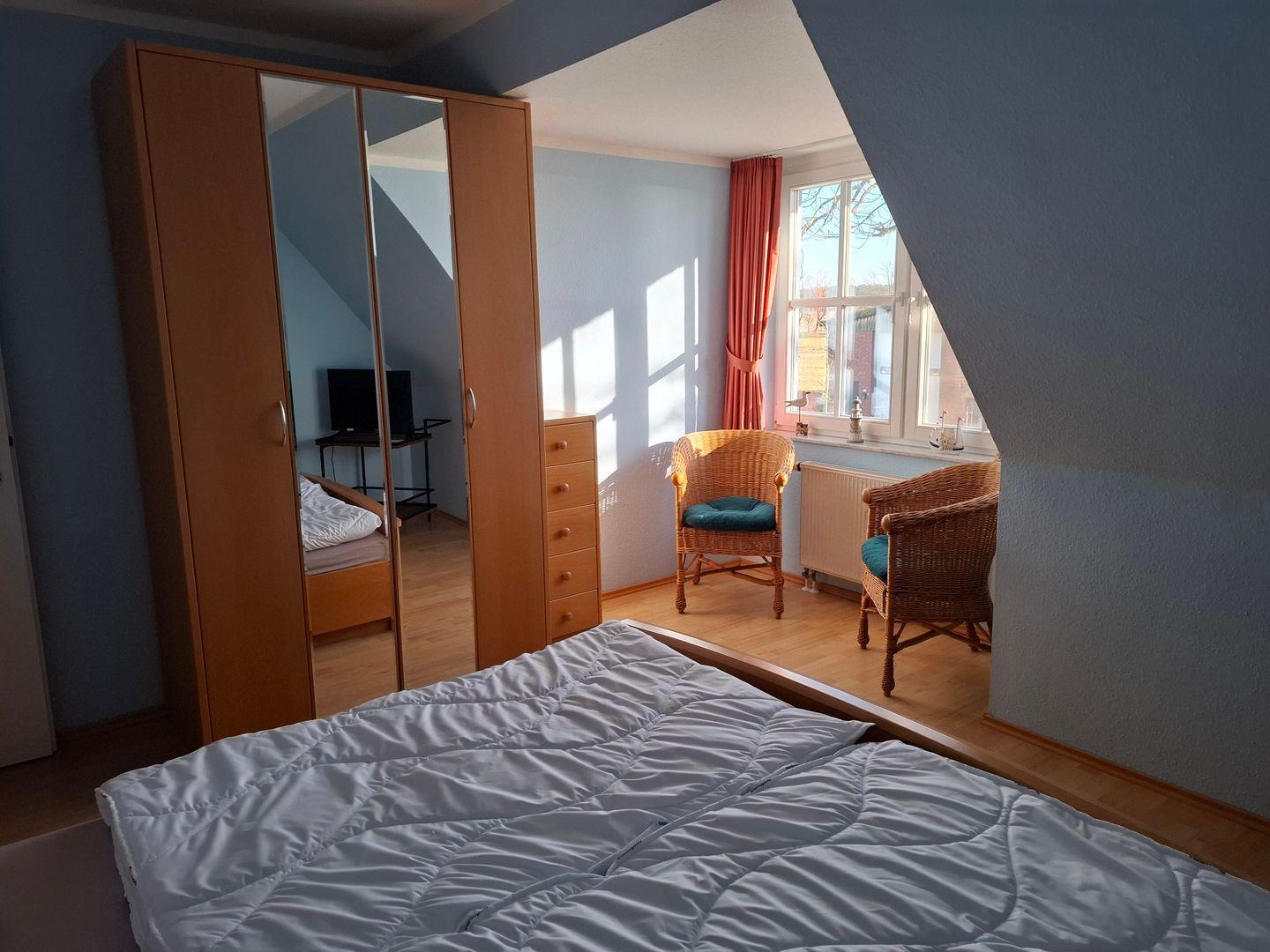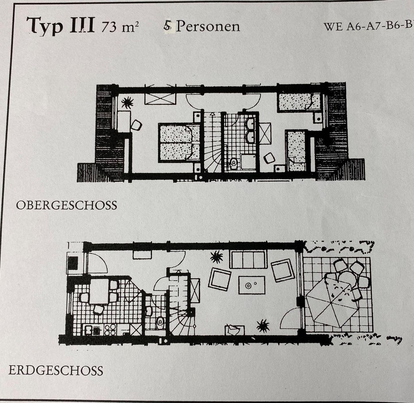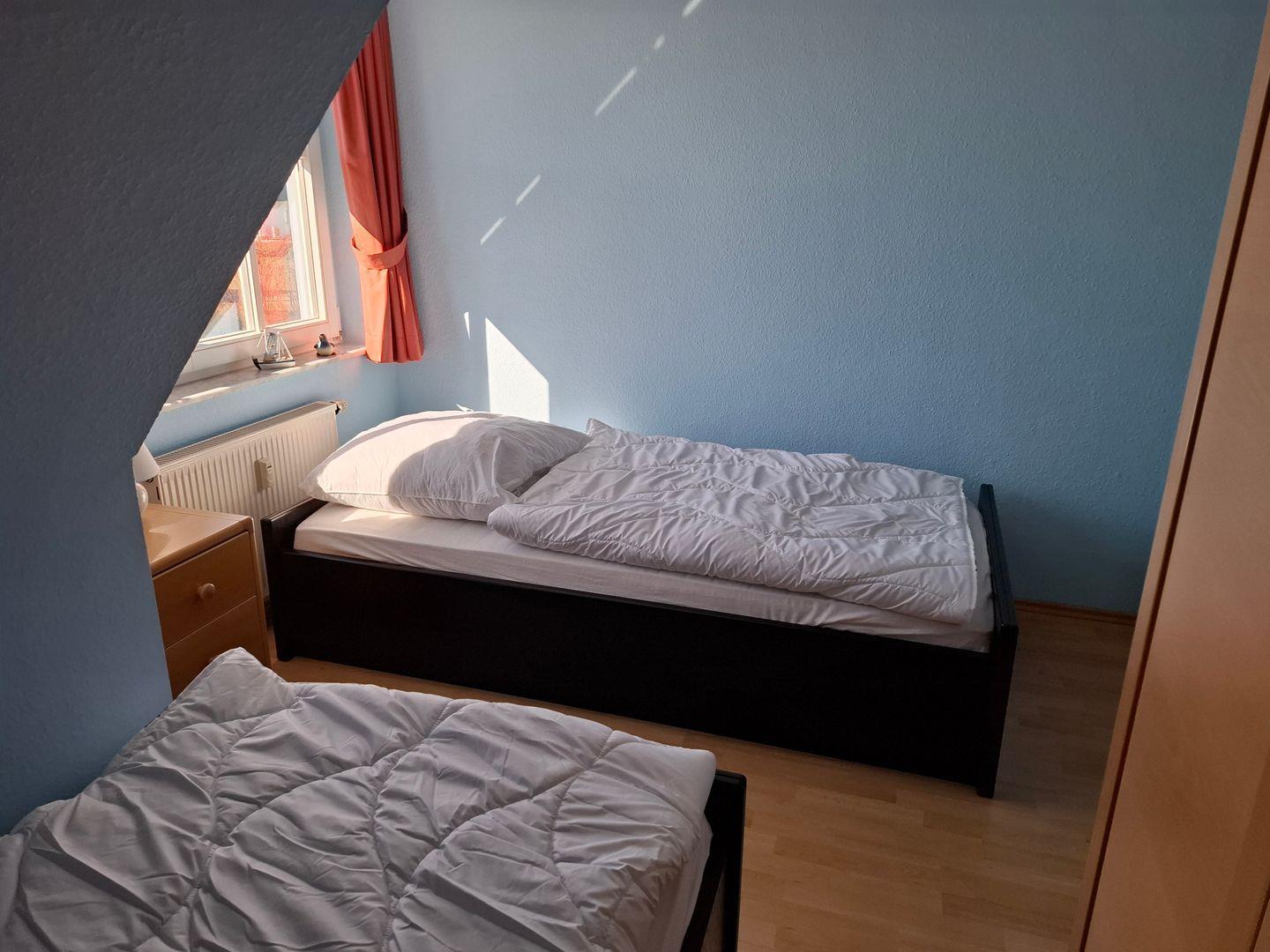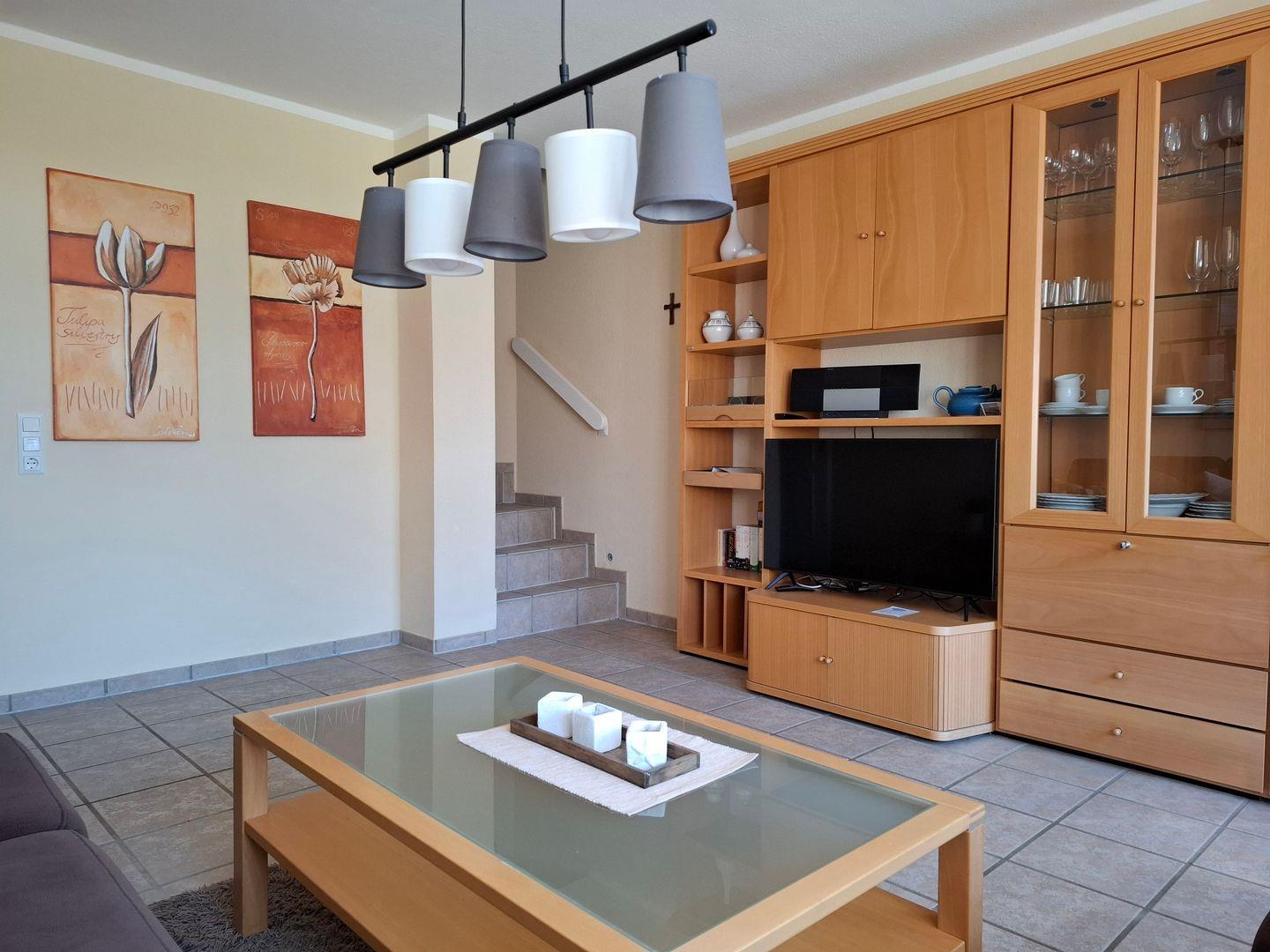 Die gemütliche und moderne 3-Raum-Ferienwohnung verteilt sich auf 2 Ebenen und ist im Landhausstil eingerichtet. Im Erdgeschoss finden Sie eine separate Küche mit Esstisch, ein Gäste-WC sowie den Wohnbereich, in dem auch bei schlechtem Wetter, Sat-TV, DVD-Player, Stereoanlage mit CD- und Kassetten-Deck, Telefon und W-LAN für Unterhaltung sorgen. Im Obergeschoss finden Sie die beiden Schlafzimmer (1 mit Doppelbett, 1 mit 2 Einzelbetten) sowie ein weiteres Badezimmer mit Dusche/WC. Für die 5. Person kann ein Zustellbett im großen Schlafzimmer aufgestellt werden. Die schöne und möblierte Terrasse der Wohnung bietet Ihnen zusätzlich einen Strandkorb zum Entspannen. Im Keller befindet sich ein Münzwasch- und Trockenautomat.