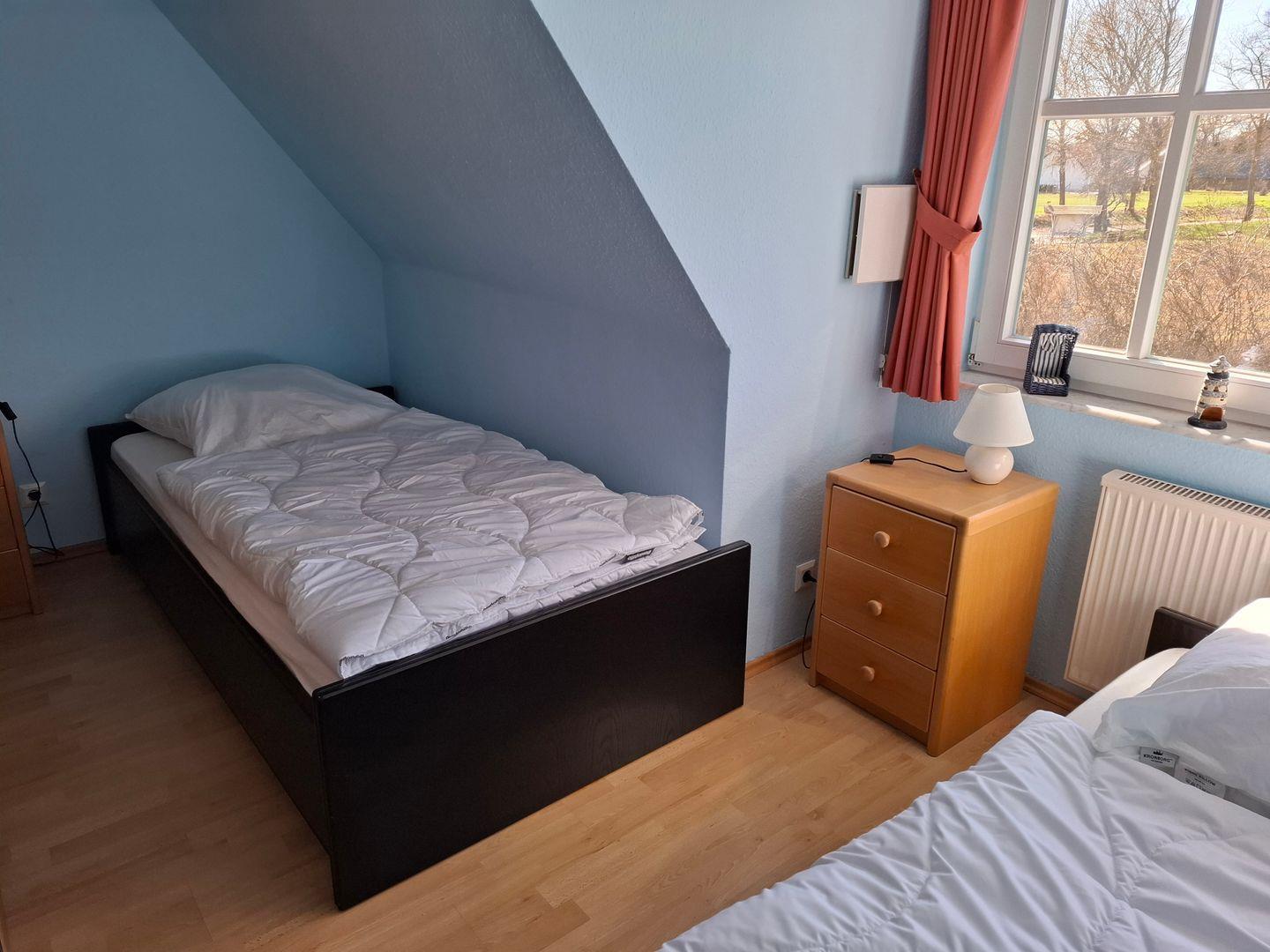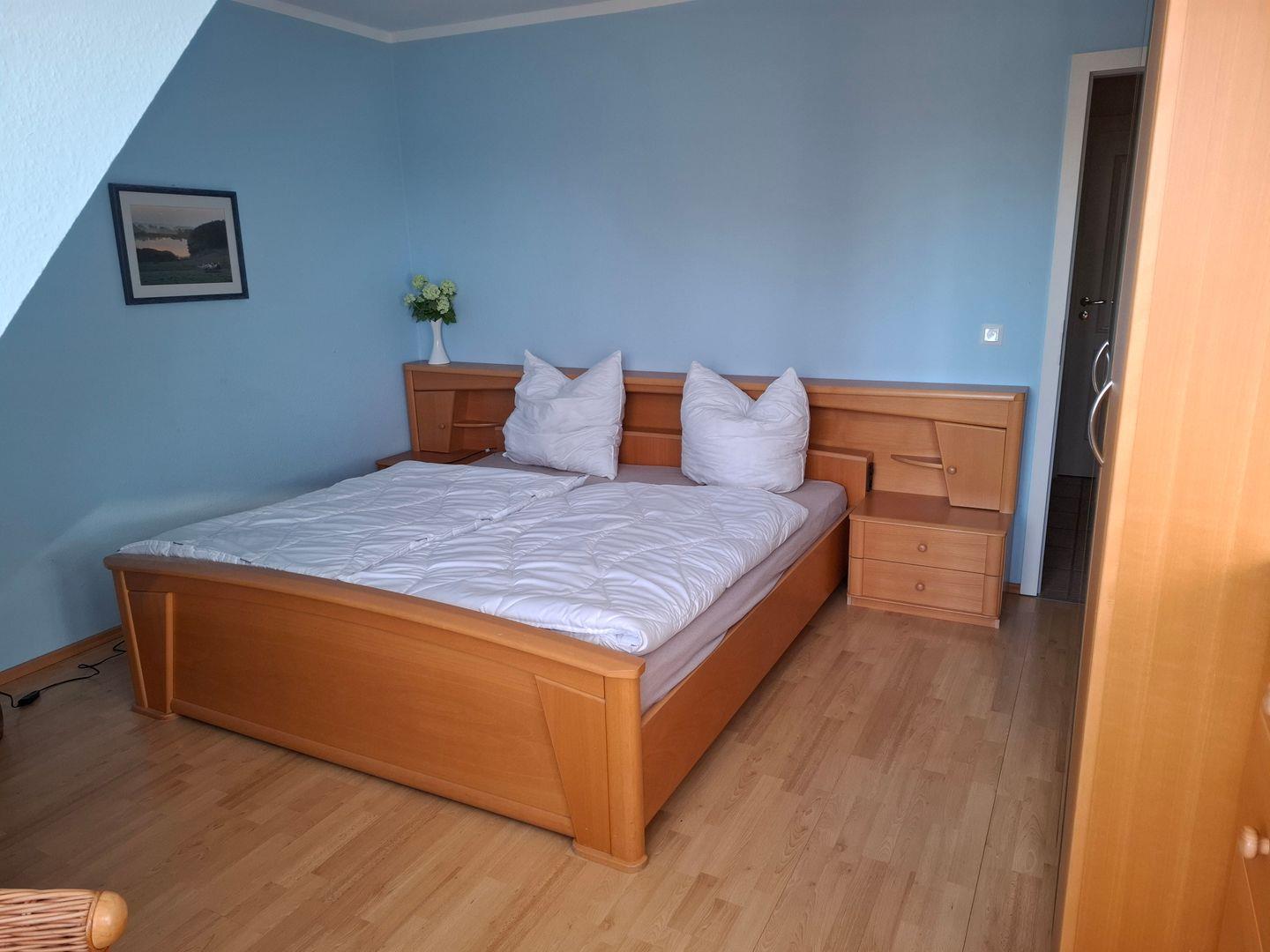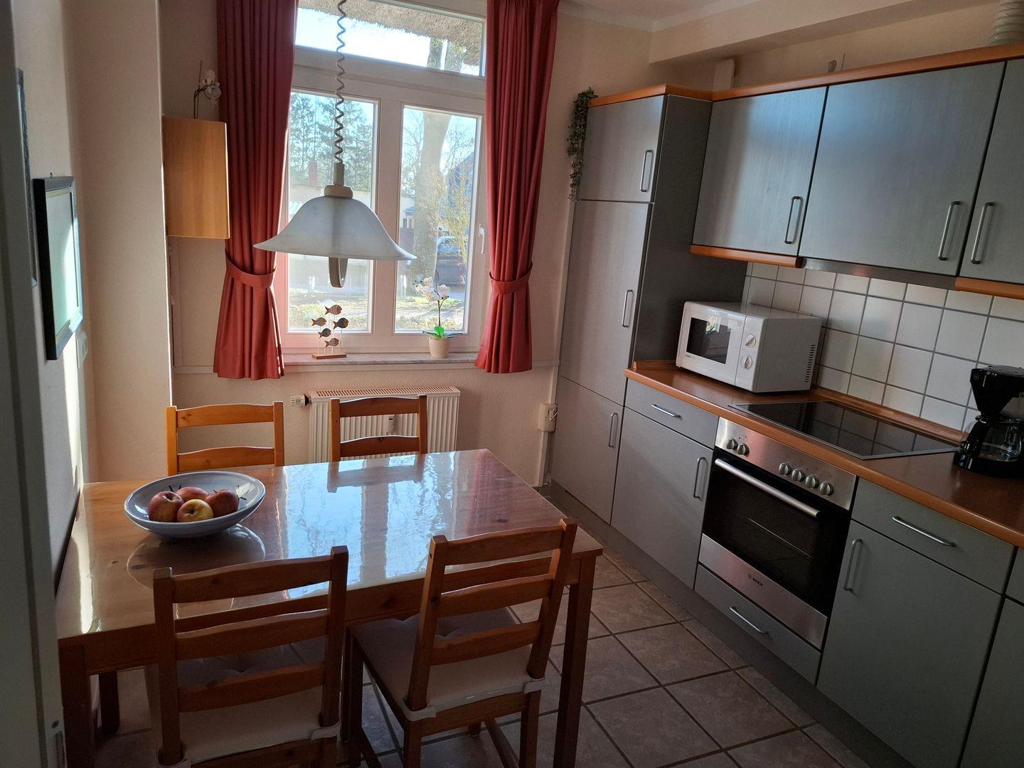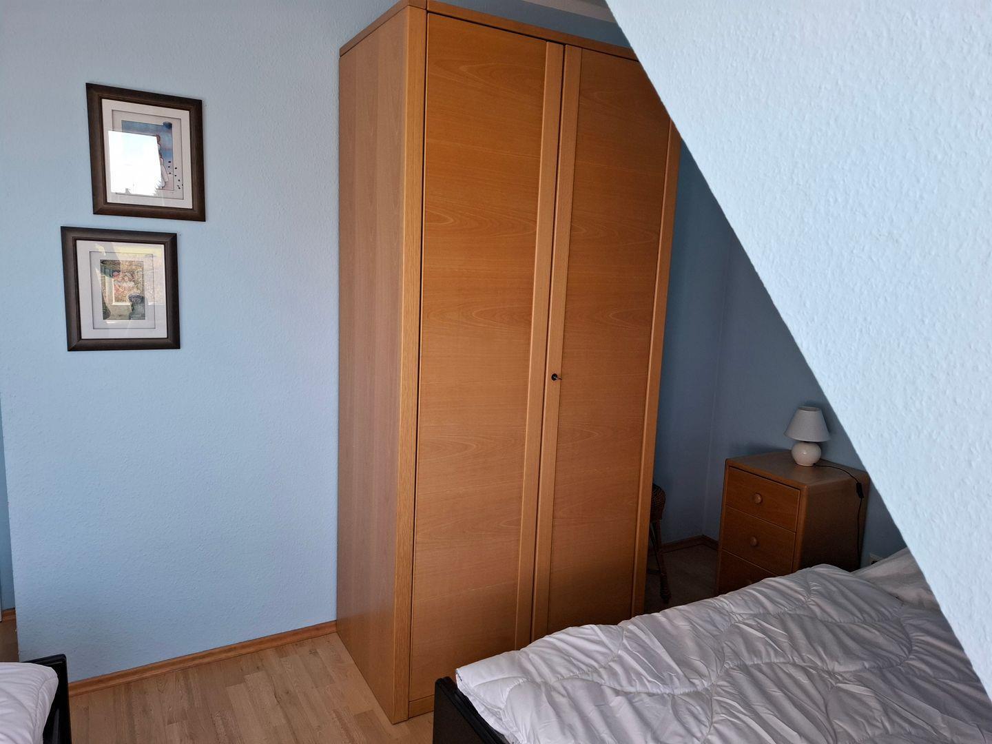 Die gemütliche und moderne 3-Raum-Ferienwohnung verteilt sich auf 2 Ebenen und ist im Landhausstil eingerichtet. Im Erdgeschoss finden Sie eine separate Küche mit Esstisch, ein Gäste-WC sowie den Wohnbereich, in dem auch bei schlechtem Wetter, Sat-TV, DVD-Player, Stereoanlage mit CD- und Kassetten-Deck, Telefon und W-LAN für Unterhaltung sorgen. Im Obergeschoss finden Sie die beiden Schlafzimmer (1 mit Doppelbett, 1 mit 2 Einzelbetten) sowie ein weiteres Badezimmer mit Dusche/WC. Für die 5. Person kann ein Zustellbett im großen Schlafzimmer aufgestellt werden. Die schöne und möblierte Terrasse der Wohnung bietet Ihnen zusätzlich einen Strandkorb zum Entspannen. Im Keller befindet sich ein Münzwasch- und Trockenautomat.