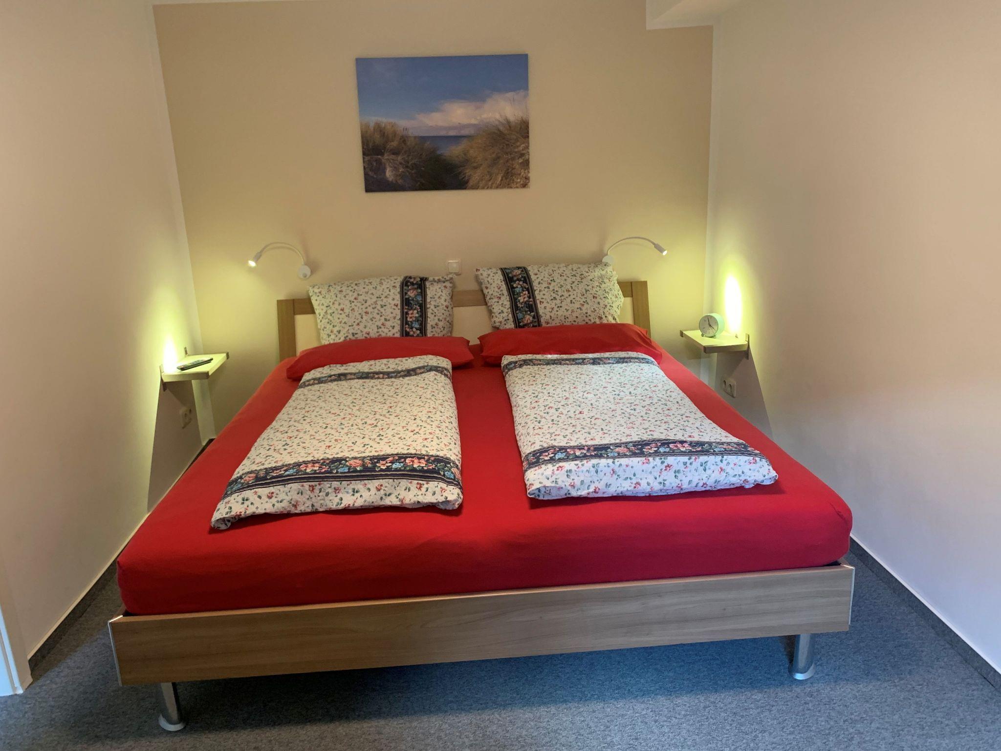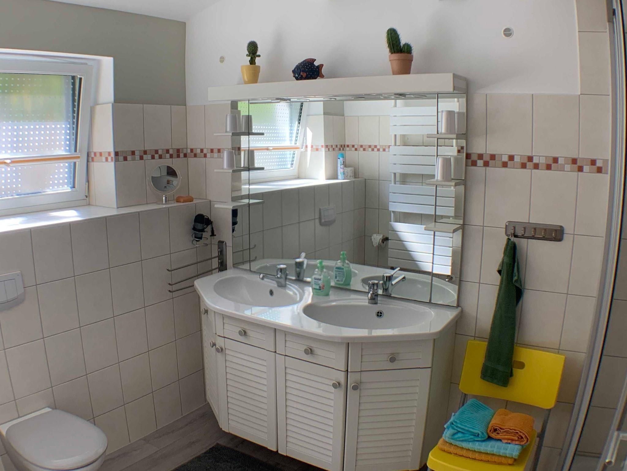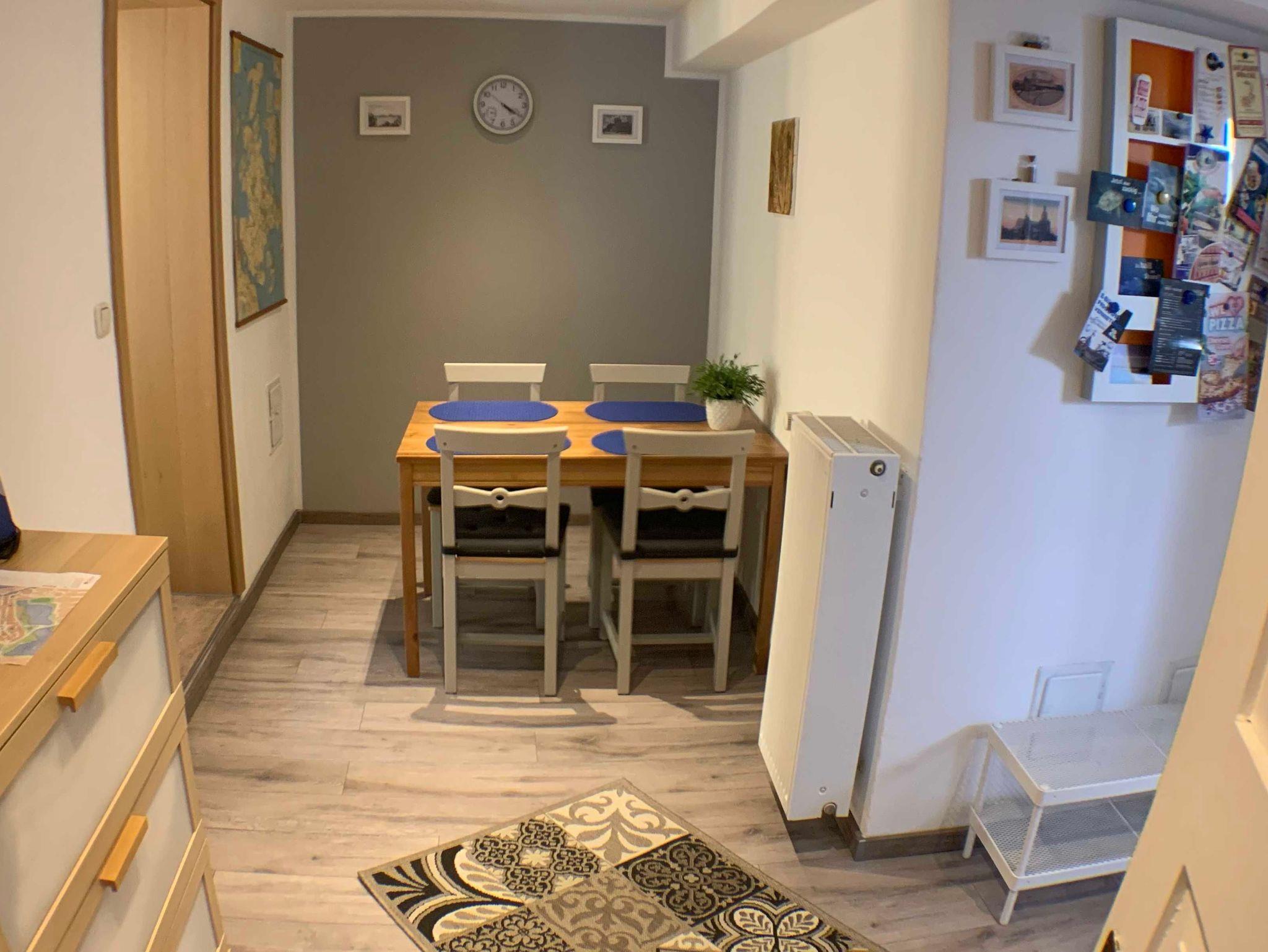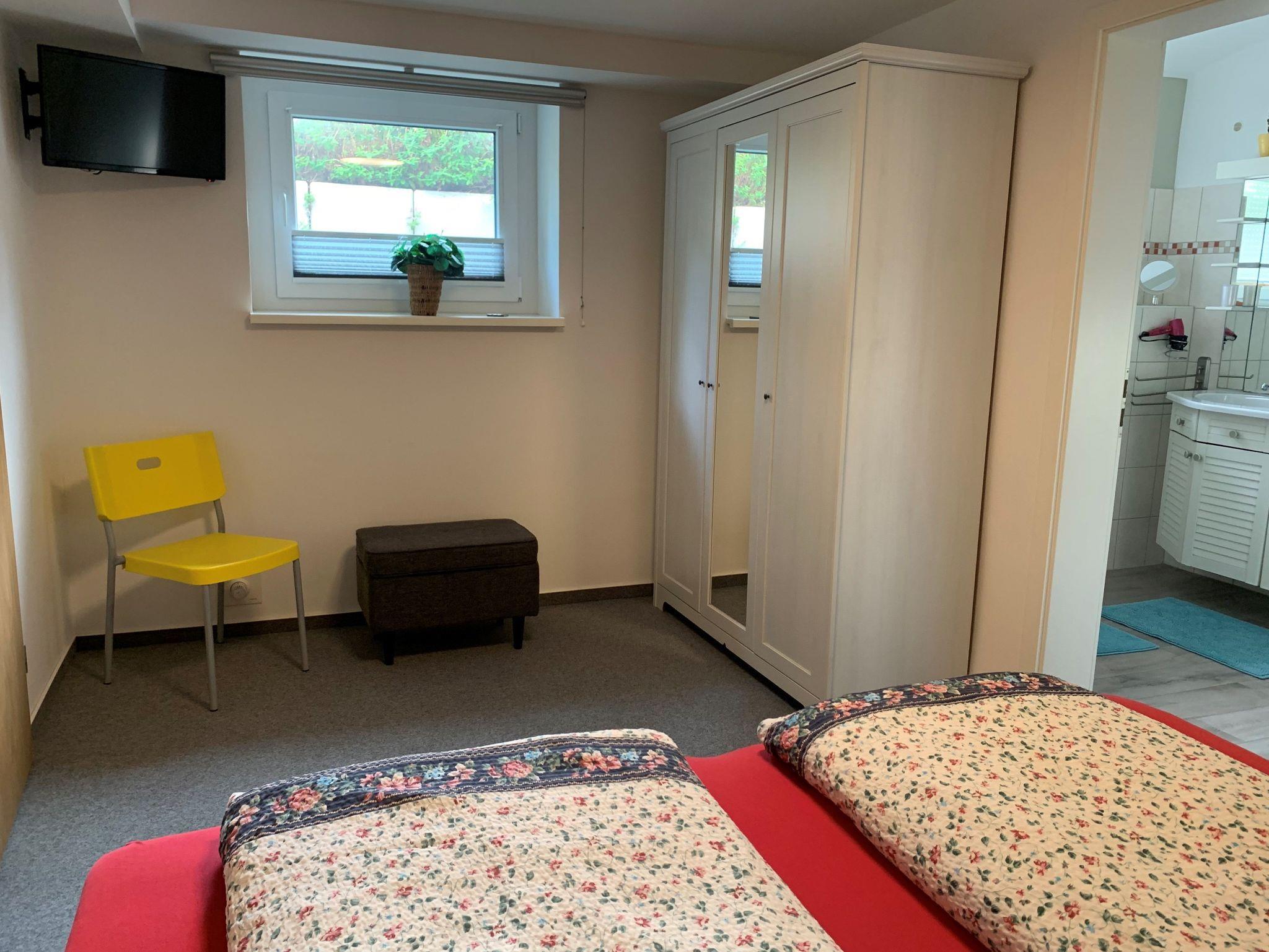 Unsere Ferienwohnung befindet sich im Souterrain und ist ca. 57 qm groß. Sie verfügt über ein Wohnzimmer, ein Schlafzimmer mit Doppelbett (1,80 breit), Esszimmer, eine kleine Küche und ein Bad mit Dusche/WC. Für die 2. Person kann eine Aufbettung auf der Schlafcouch im Wohnzimmer erfolgen. Das Schlafzimmer ist das Durchgangszimmer zum Badezimmer.