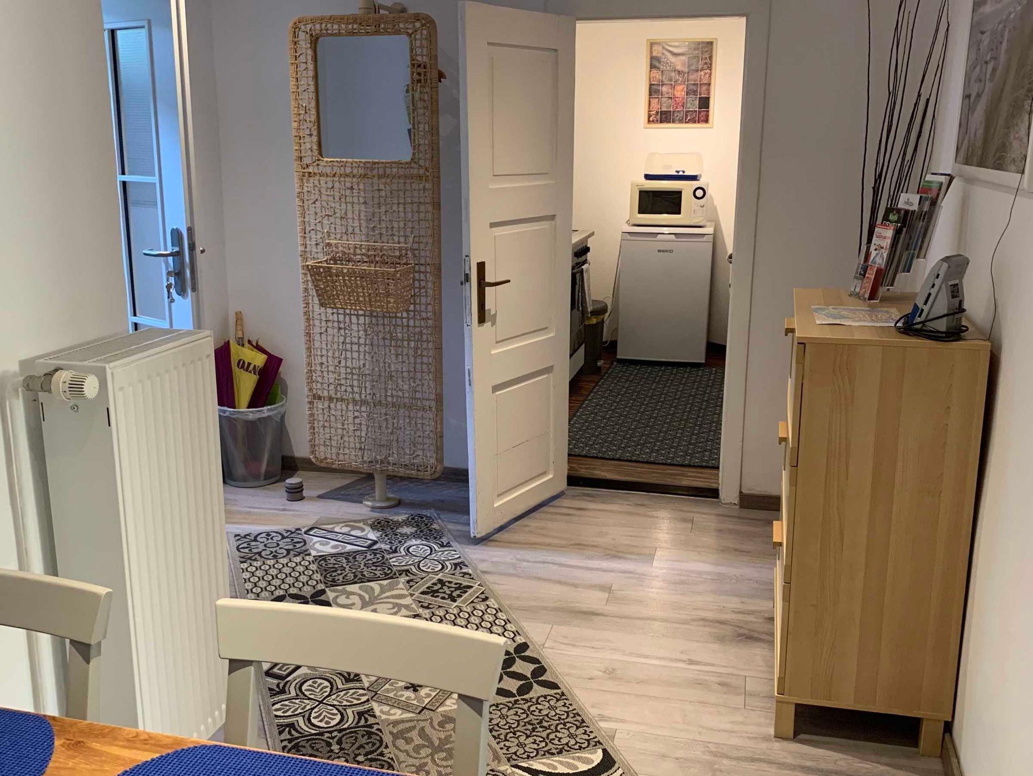 Die Ferienwohnung am Sund ist eine Souterrainwohnung mit einem Wohnzimmer, eine kleine Küche, ein Schlafzimmer, ein Badezimmer sowie einen Flur. Ein Gästeparkplatz befindet sich direkt auf dem Grundstück.