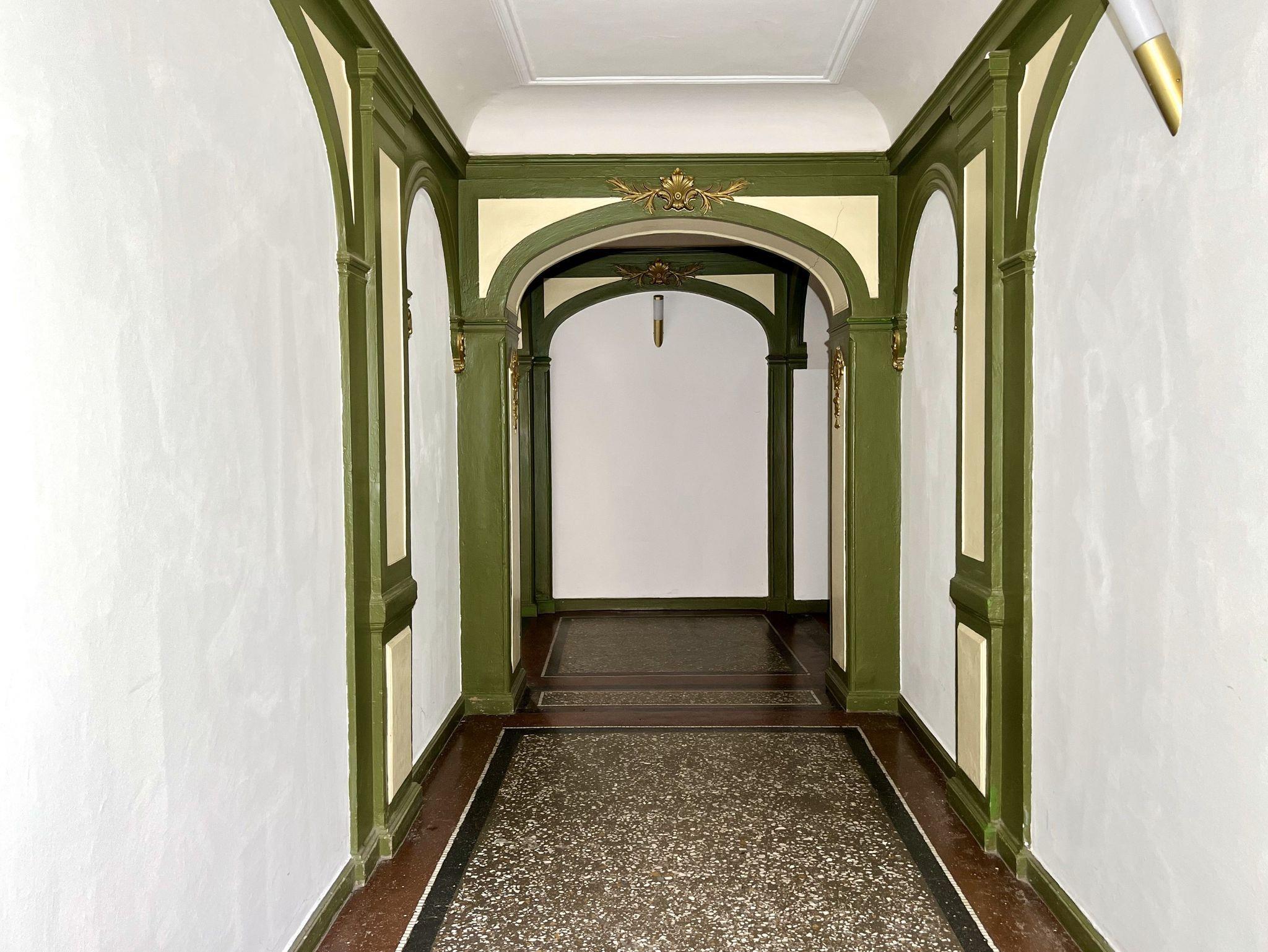 Das Appartement ist 62 qm groß, frisch renoviert, modern eingerichtet und über einen Treppenaufgang zu erreichen. Die Deckenhöhe beträgt vier Meter, wobei das Wohnzimmer eine geschnitzte Holzdecke und Deckenmalereien hat. Die Küche ist in das Wohnzimmer integriert und mit modernen Geräten ausgestattet. W-LAN kostenfrei. Eine Gefriermöglichkeit steht im Keller für alle Gäste bereit (pro Wohnung 1 Gefrierfach).