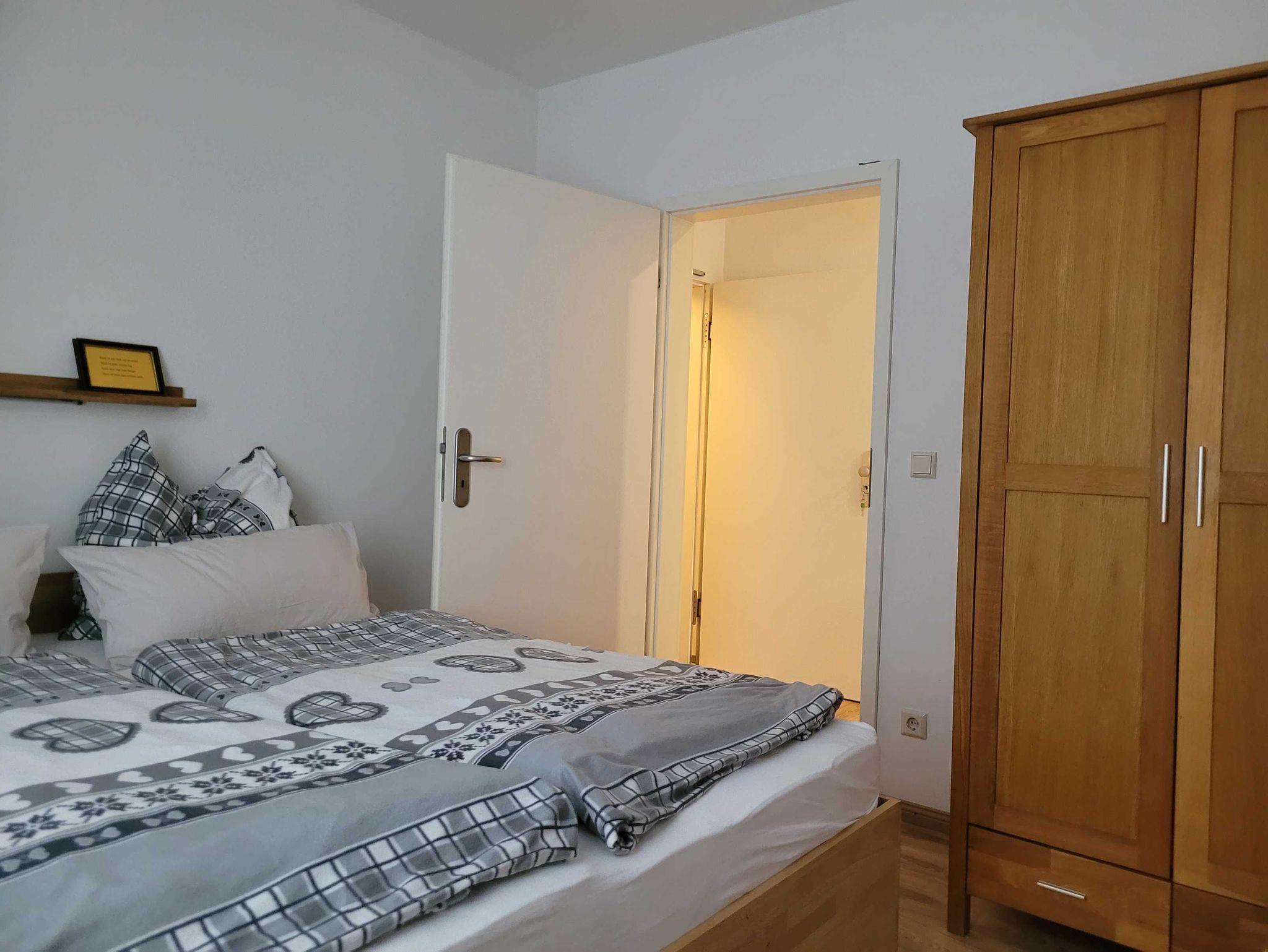 Die 50qm große Ferienwohnung (EG oder OG) ist hell und freundlich eingerichtet. Im Schlafzimmer befindet sich ein Doppelbett (1,80x2,00m - getrennte Matratzen). Die sehr gut ausgestattete Küche (Wasserkocher, Kaffeemaschine, Mikrowelle, Toaster, Herd, Backofen, Kühlschrank mit Gefrierfach) verbindet den Flur mit dem offenen Wohnbereich. Im Wohnraum ebenfalls zu finden, eine Esstischgarnitur für 4 Personen sowie eine Couch mit Schlaffunktion für max. 2 Personen.