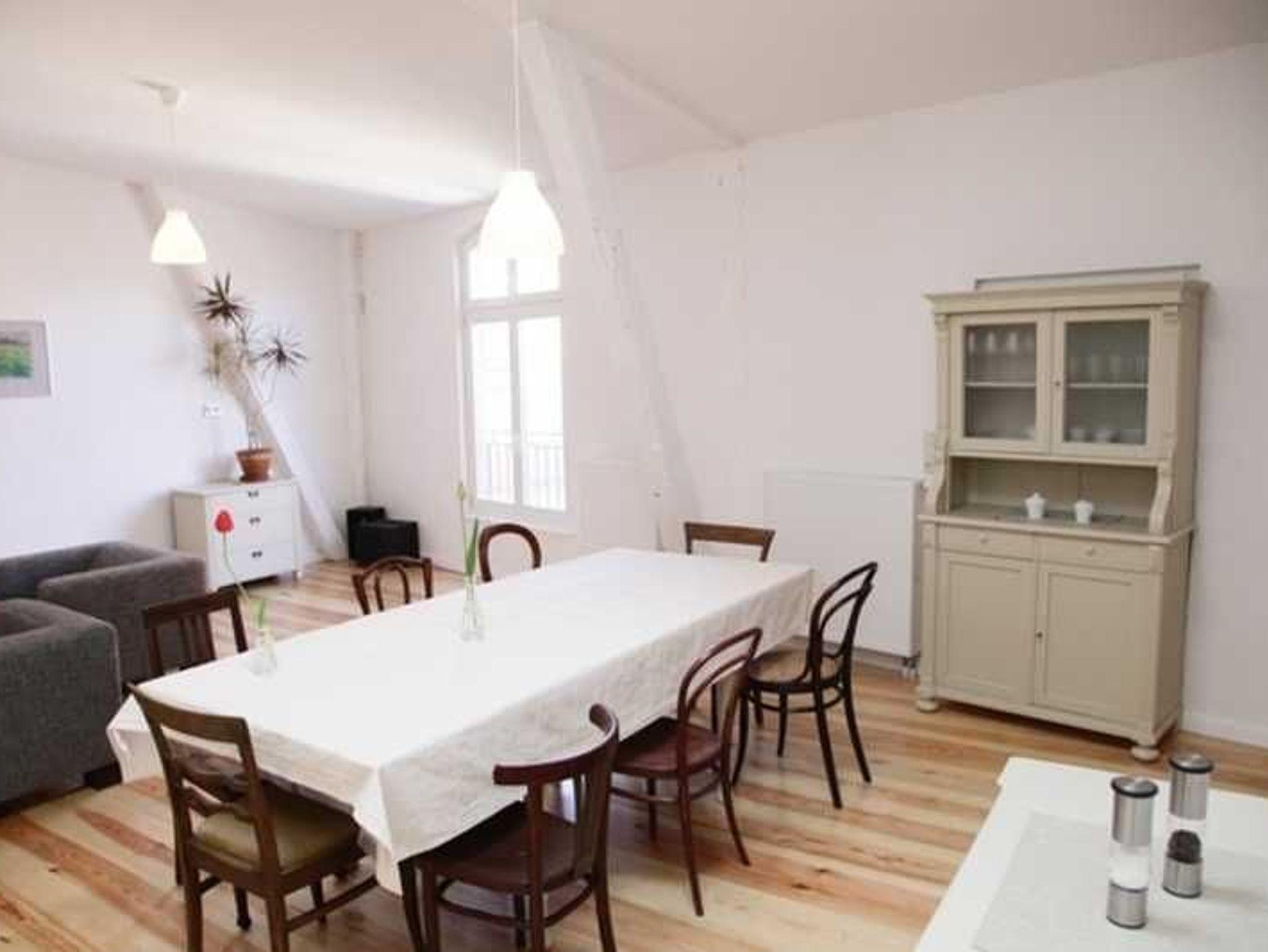 Die Ferienwohnung befindet sich im 1. OG des historischen Speichergebäudes. Sie finden dort eine offene Küche mit Esszimmer und Blick in den grünen Innenhof. Die Küche ist mit Elektroherd/ Ceranfeld, Backofen, Spülmaschine, Kühlschrank mit Eisfach, Kaffeemaschine, Wasserkocher und weiteren diversen Küchengeräten bestückt. Im geräumige Wohnzimmer stehen 2 gemütliche Ledersofas mit Kissen und Decken, sowie ein Couchtisch. Zusätzlich finden Sie hier ein Bücherregal mit einer Auswahl interessanter Urlaubslektüre und eine Spät-Biedermeier-Kommode. Außerdem ist im Wohnzimmer der Flachbildfernseher mit Satelliten-Empfang und ein DVDPlayer mit DVD Sammlung vorhanden. Hier finden sie noch ein zusätzliches Einzelbett.