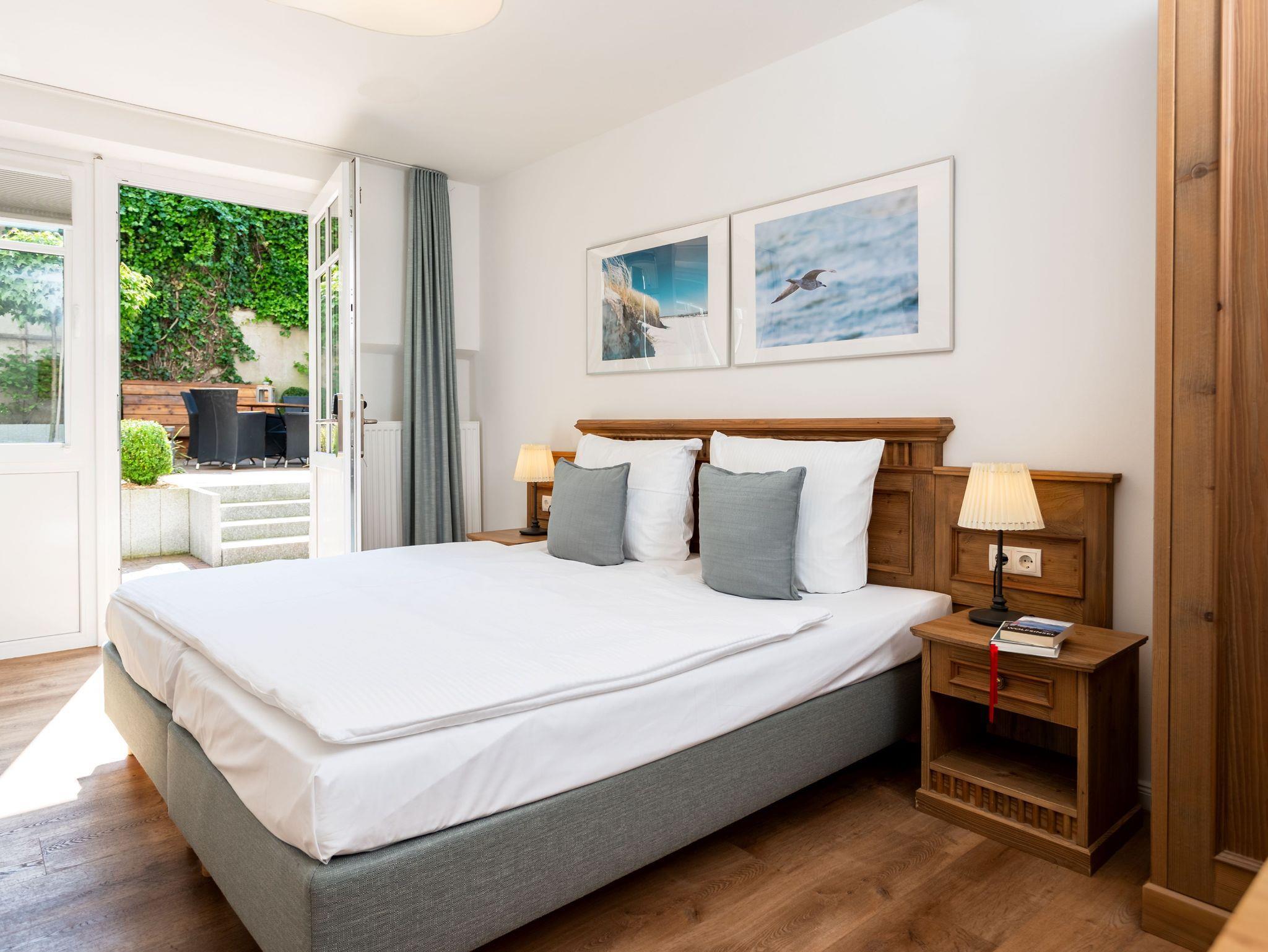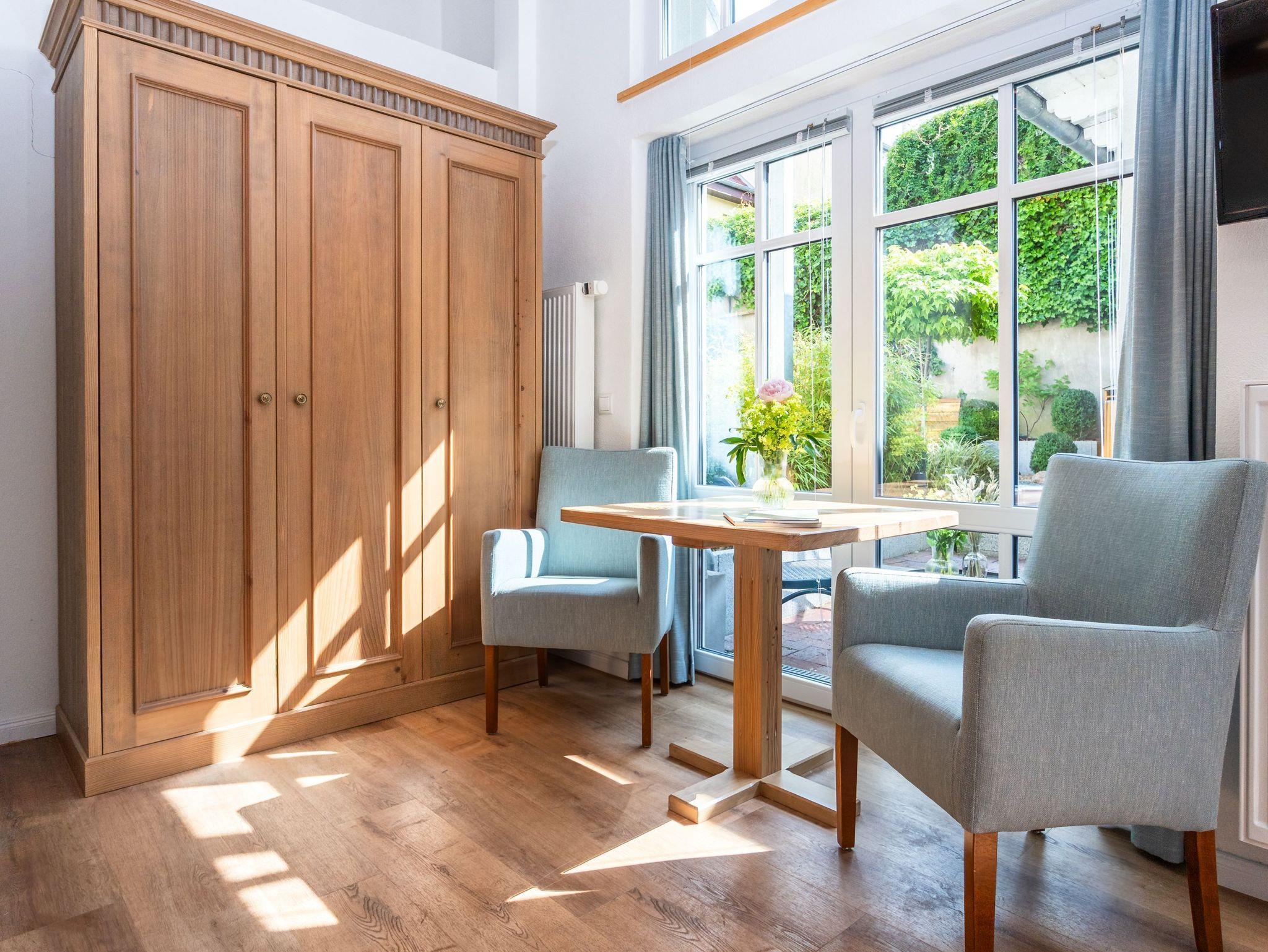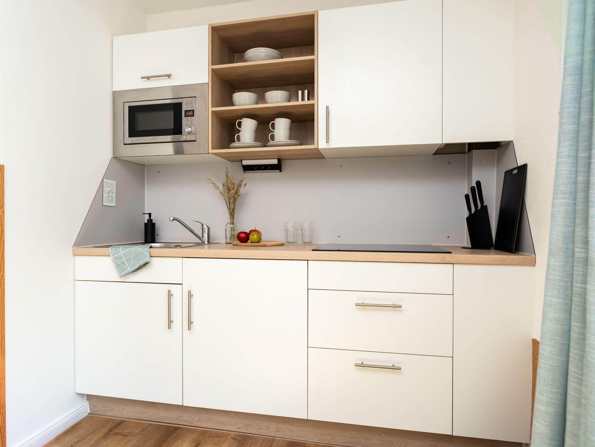Unsere modernen 1-Raum-Apartments Classic befinden sich im Erdgeschoss mit Zugang über unseren Innenhof. Zur Ausstattung gehören ein komfortables Boxspringbett, eine kleine Sitzecke mit Tisch, eine praktische Küchenzeile und ein Badezimmer mit Dusche und WC.