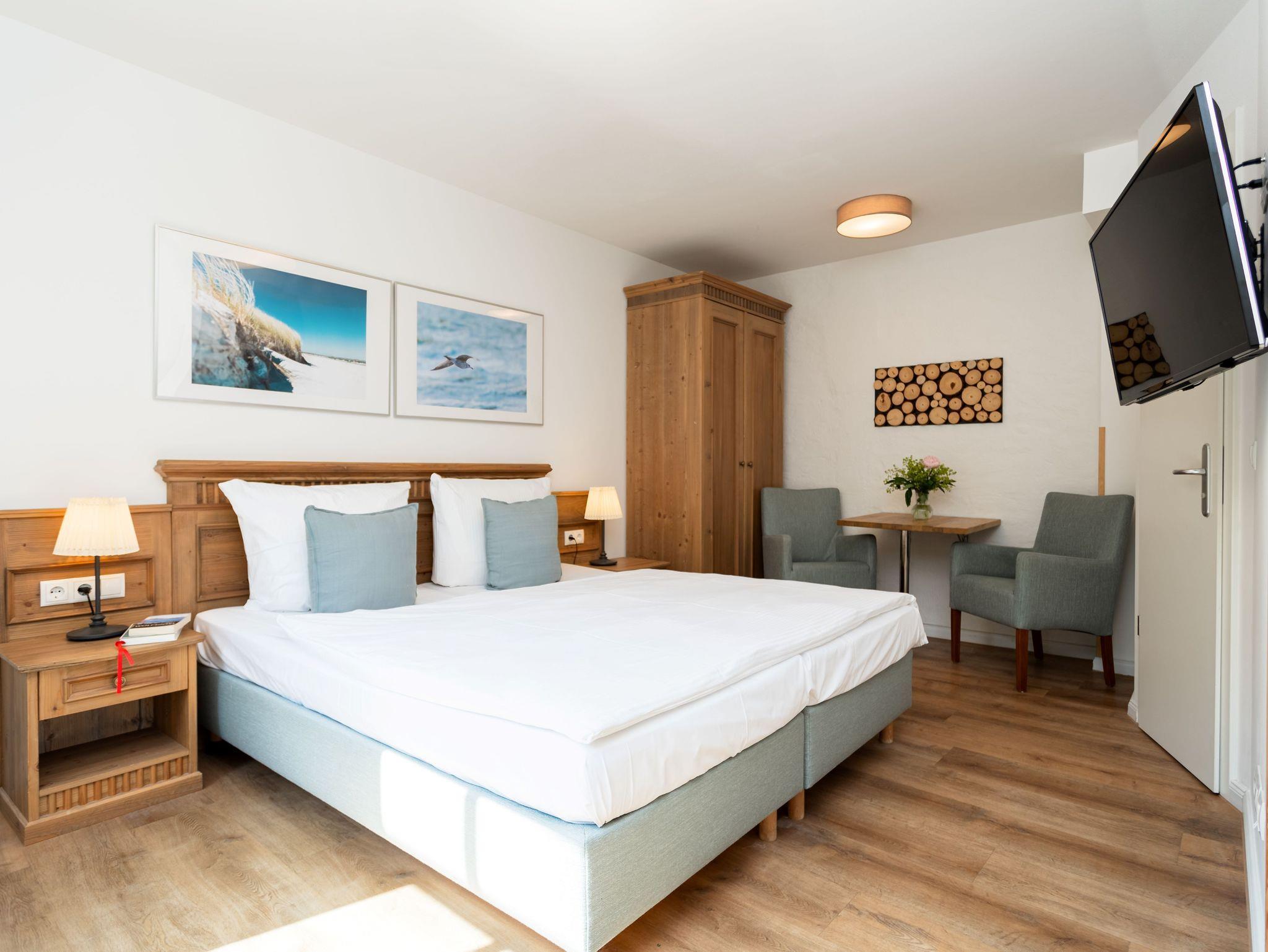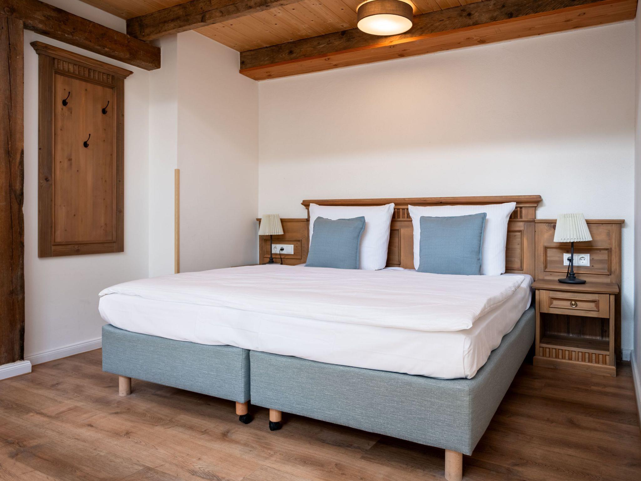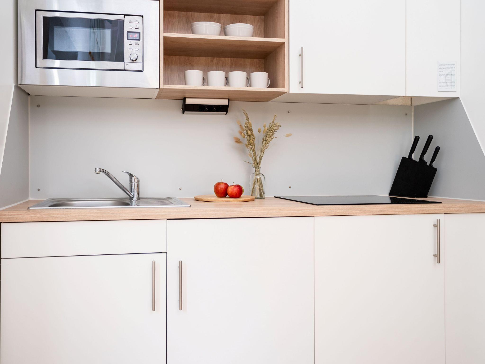 Unsere modernen 1-Raum-Apartments Classic befinden sich im Erdgeschoss mit Zugang über unseren Innenhof. Zur Ausstattung gehören ein komfortables Boxspringbett, eine kleine Sitzecke mit Tisch, eine praktische Küchenzeile und ein Badezimmer mit Dusche und WC.