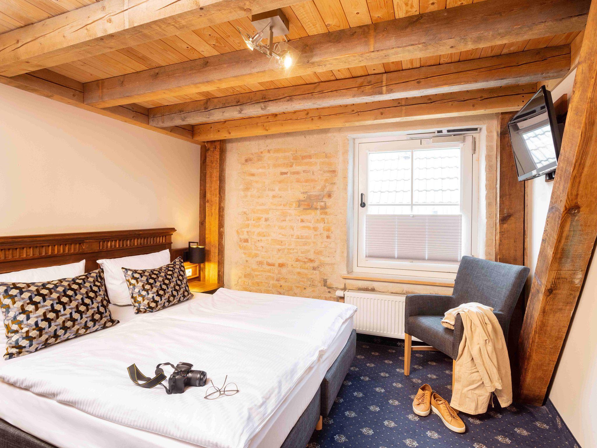 Unser 2-Raum-Apartment Superior befindet sich im 3. Obergeschoss. Es hat ein separates Schlafzimmer mit gemütlichem Boxspringbett. Das zweite Doppelbett erreichen Sie über eine historische Treppe, die auch eine Galerie führt (hier ist leider keine Stehhöhe vorhanden). Eine Möglichkeit zur Aufbettung ist mit einer gemütlichen Schlafcouch im Wohnzimmer möglich. Es ist ebenso ein großer Essplatz, eine Küchenzeile und ein Badezimmer mit Dusche und WC vorhanden.