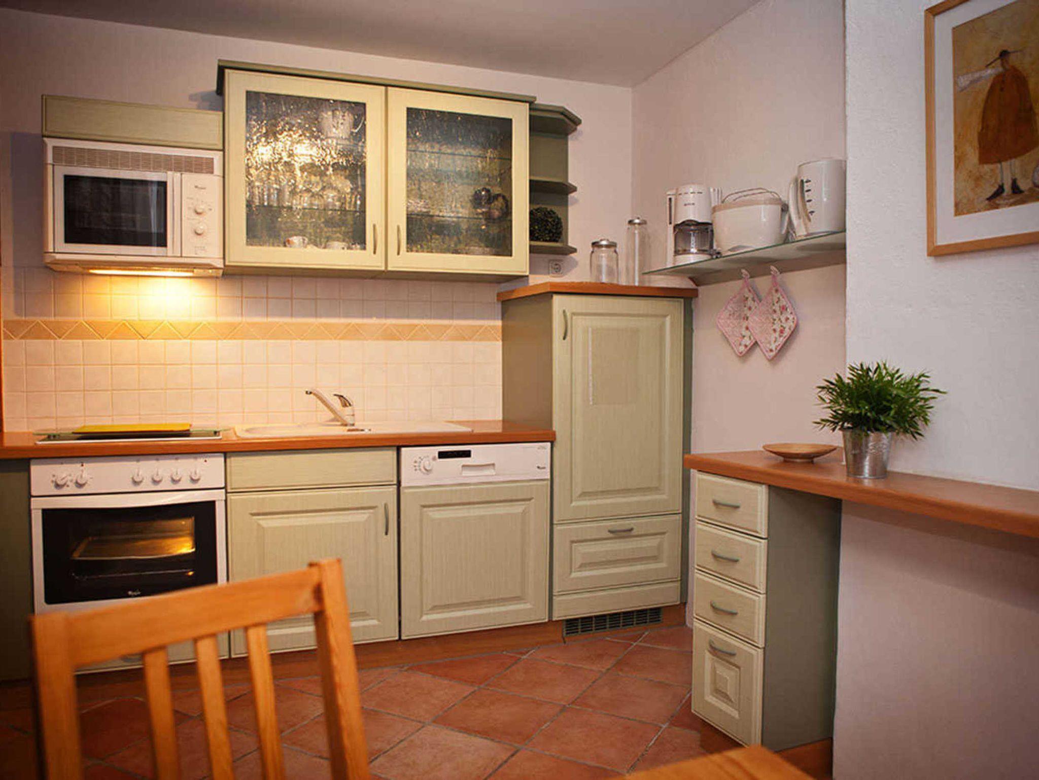 EBK: Kühlschrank mit Gefrierfach, E-Herd mit 4 Ceranfeldern und Backofen, Mikrowelle, Geschirrspüler, Kaffeemaschine, Wasserkocher, Toaster, Geschirr, Besteck, Topf, Pfanne