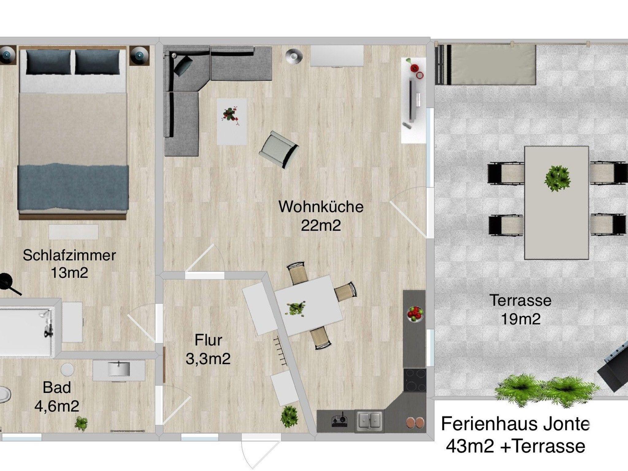 Das Ferienhaus ist ca. 52 qm groß und verfügt über ein Wohnzimmer mit offener Küche, Schlafzimmer, Dusche/WC sowie große überdachte Terrasse mit Grill und Blick auf den Strelasund.