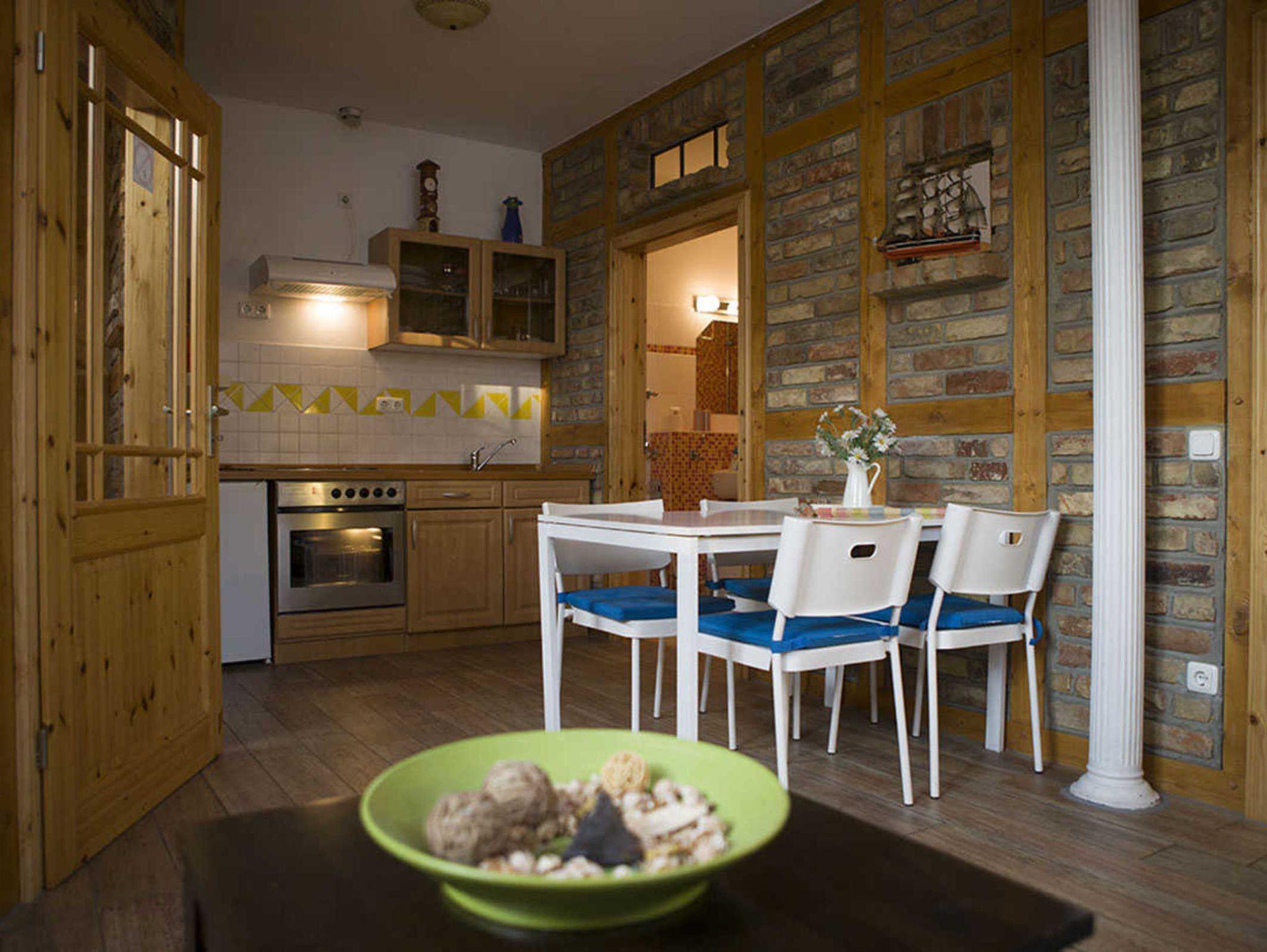 separate Küche mit Essbereich und EBK, Kühlschrank, E-Herd 2 Platten, Geschirr, Besteck,