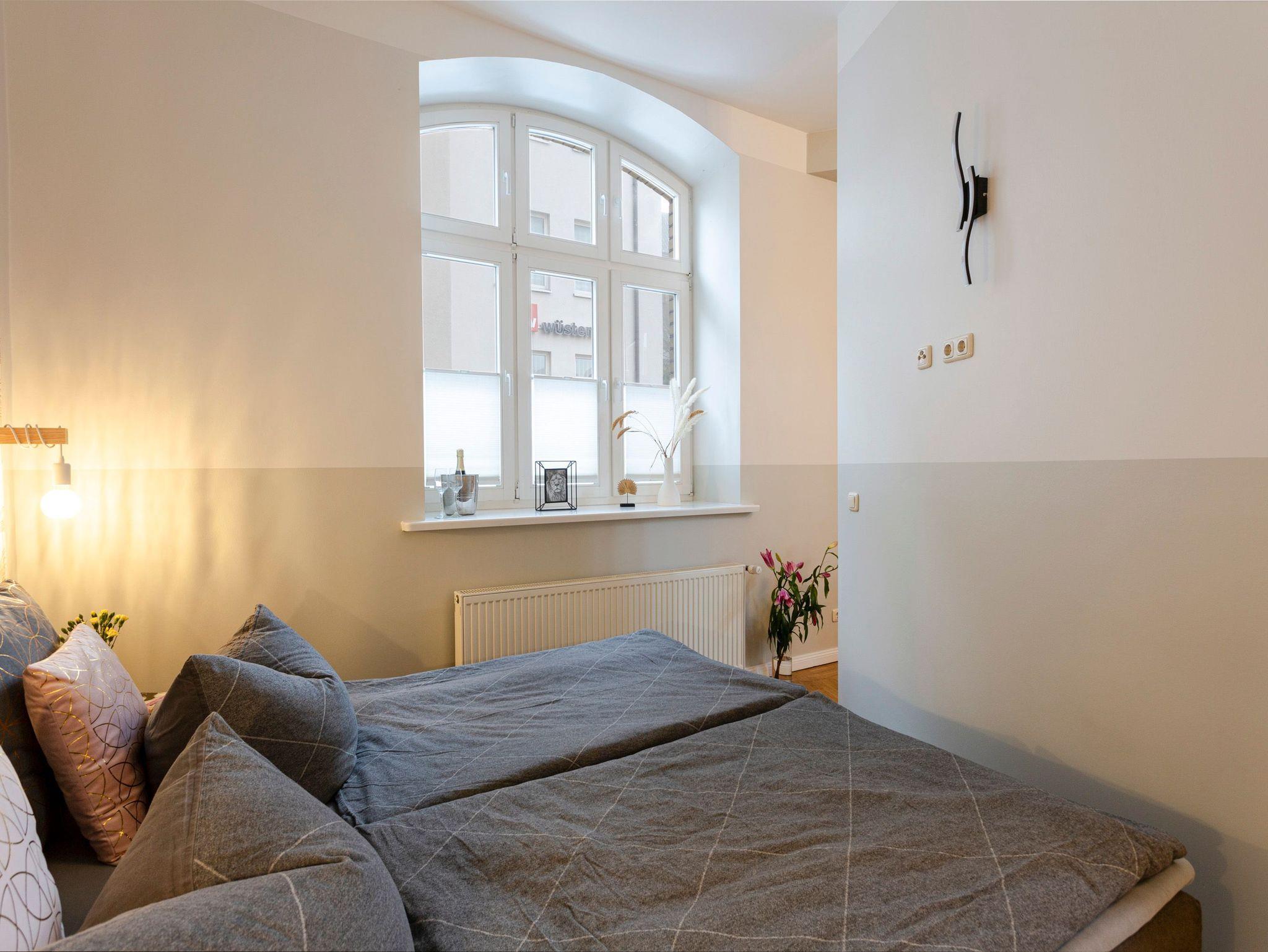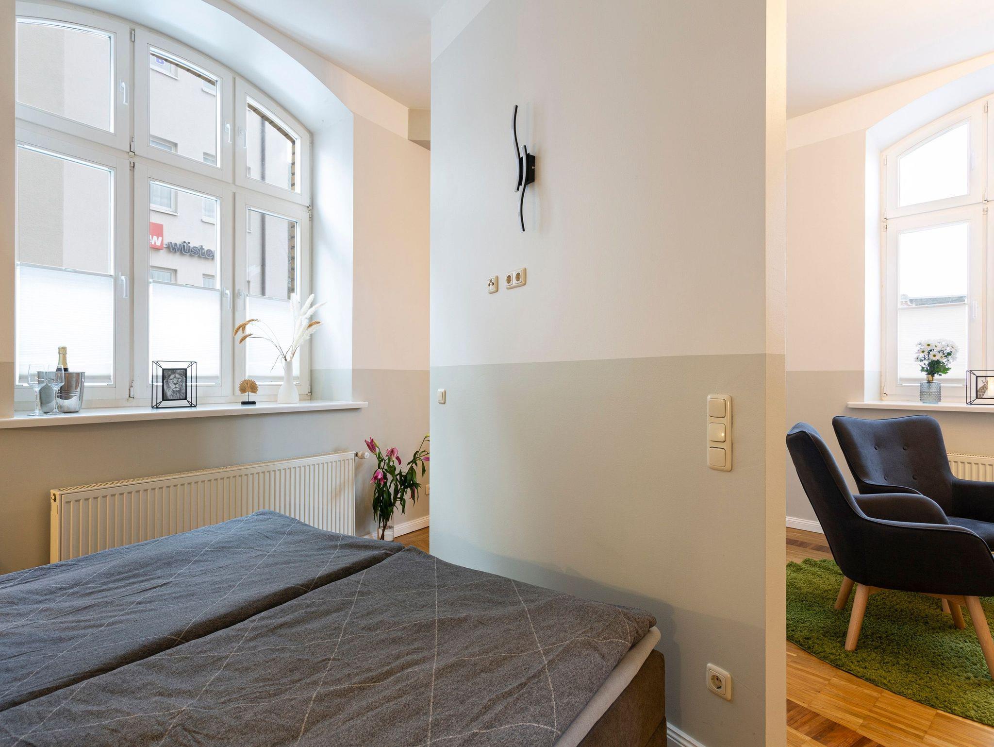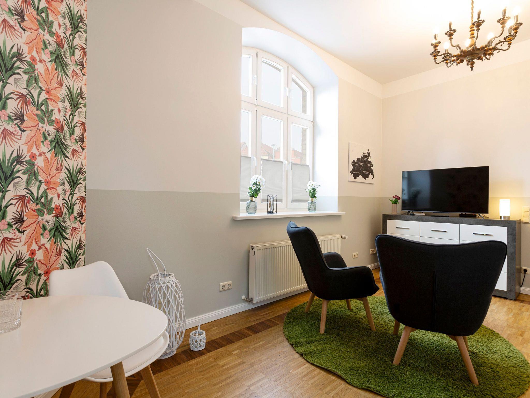 Das Altstadt-Studio 6 befindet sich im Erdgeschoss des Hauses und ist für 2 Personen geeignet. Das 42 m² große Studio verfügt über eine voll ausgestattete Küche, ein geräumiges helles Wohnzimmer mit abgetrenntem Schlafbereich und ein Bad mit Dusche, Waschbecken und WC. Das Wohnzimmer ist zum Neuen Markt ausgerichtet und lässt viel Licht in die altbautypischen Fenster herein. Hier befinden sich zwei angenehme Sessel, ein TV und ein Esstisch mit Stühlen. Der Schlafbereich ist durch einen Wand abgetrennt und die Fenster haben eine Südausrichtung. Neben dem großen Doppelbett (180x200) steht ihnen ein kleiner Raum für ihre Koffer und Kleidungsstücke zur Verfügung. Die Küche verfügt über einen kleinen Kühlschrank, Backofen, Herd, Mikrowelle, Wasserkocher, Kaffeemaschine und Toaster. Der kleine Tresen eignet sich für einen kleinen Snack oder ein kurzes Frühstück.