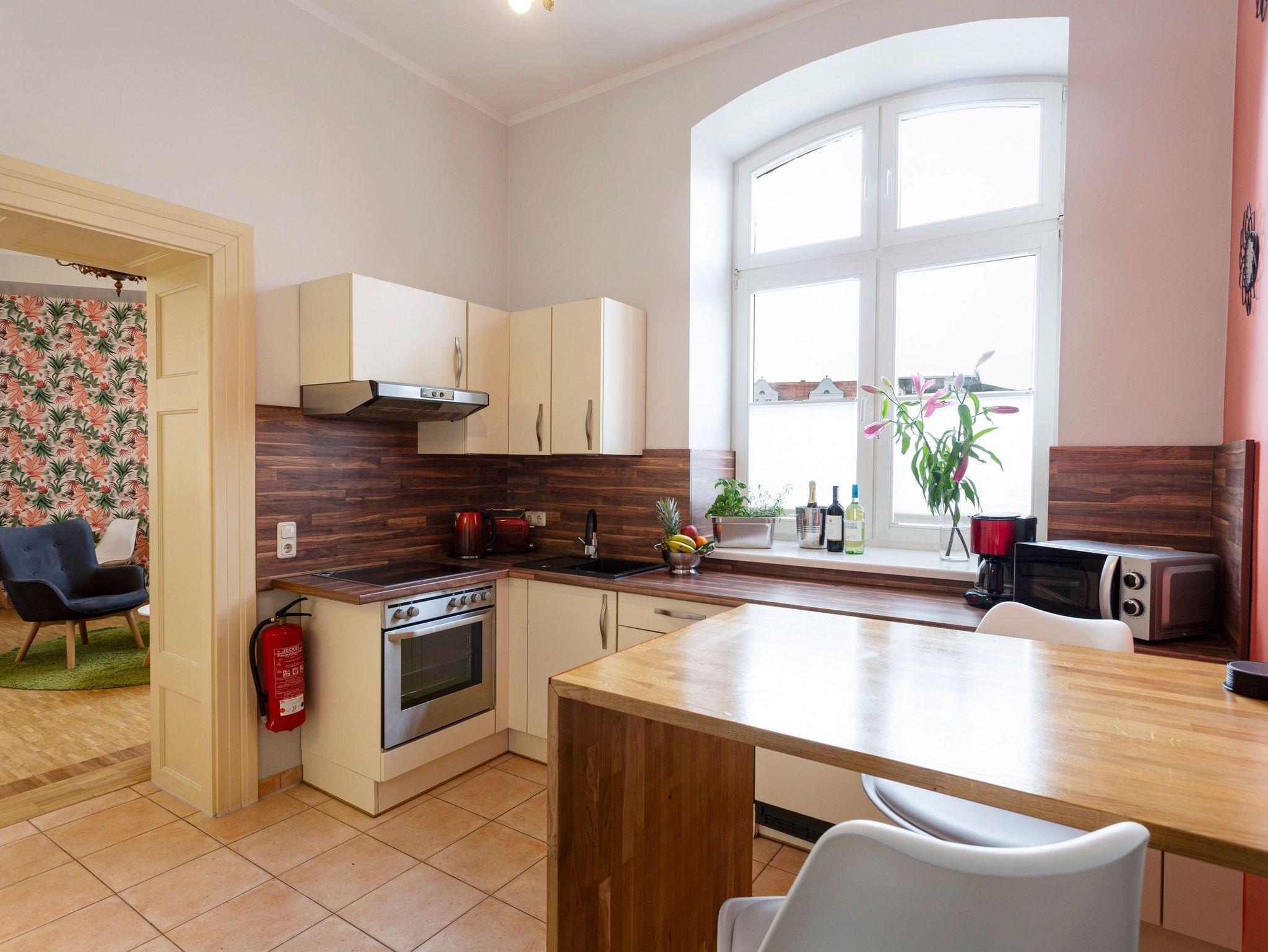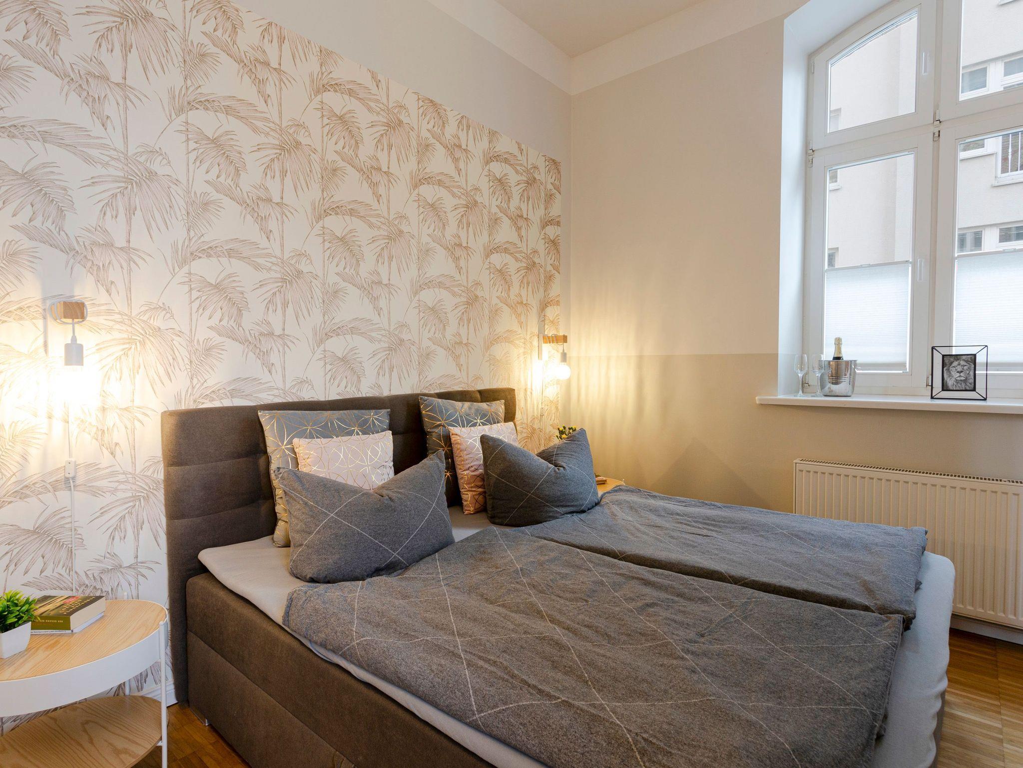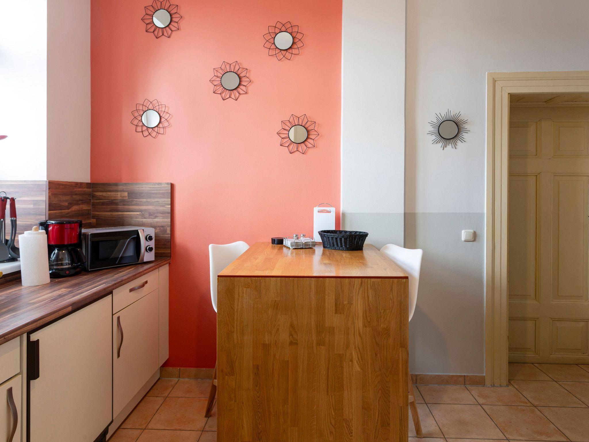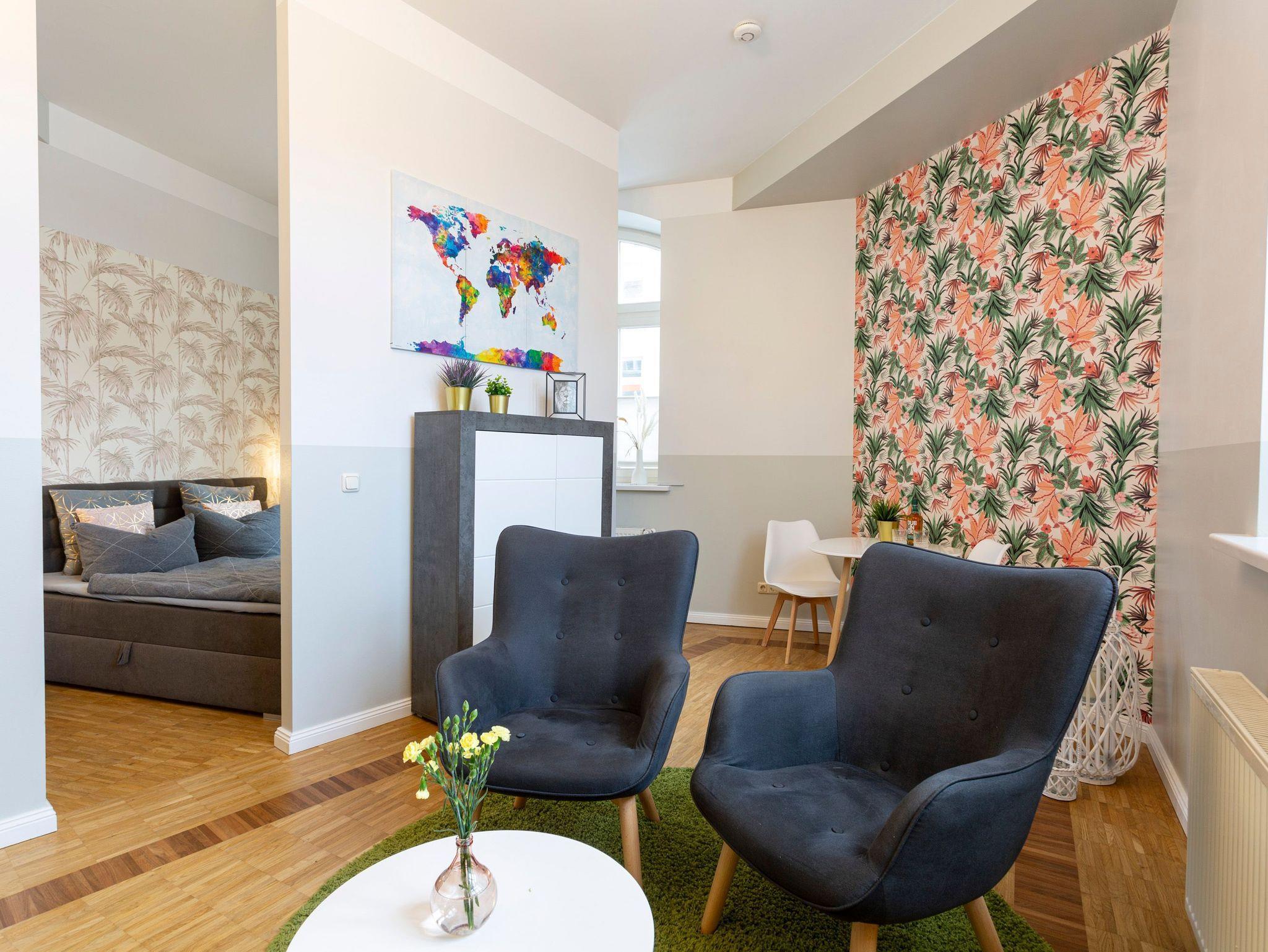 Das Altstadt-Studio 6 befindet sich im Erdgeschoss des Hauses und ist für 2 Personen geeignet. Das 42 m² große Studio verfügt über eine voll ausgestattete Küche, ein geräumiges helles Wohnzimmer mit abgetrenntem Schlafbereich und ein Bad mit Dusche, Waschbecken und WC. Das Wohnzimmer ist zum Neuen Markt ausgerichtet und lässt viel Licht in die altbautypischen Fenster herein. Hier befinden sich zwei angenehme Sessel, ein TV und ein Esstisch mit Stühlen. Der Schlafbereich ist durch einen Wand abgetrennt und die Fenster haben eine Südausrichtung. Neben dem großen Doppelbett (180x200) steht ihnen ein kleiner Raum für ihre Koffer und Kleidungsstücke zur Verfügung. Die Küche verfügt über einen kleinen Kühlschrank, Backofen, Herd, Mikrowelle, Wasserkocher, Kaffeemaschine und Toaster. Der kleine Tresen eignet sich für einen kleinen Snack oder ein kurzes Frühstück.