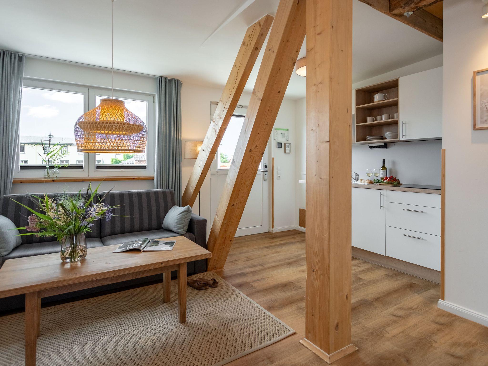 Unsere 1,5-Raum-Apartments Deluxe bieten etwas mehr Raum als die Classic-Varianten. Sie befinden sich im 3. Obergeschoss. Zur Ausstattung gehören ein gemütliches Boxspringbett, TV/Radio, eine Sitzecke, eine praktische Küchenzeile, ein Badezimmer mit Dusche. Das Schlafzimmer ist separat, allerdings gibt es über das offene Spitzdach eine Verbindung zum Wohn-/Küchenbereich.
