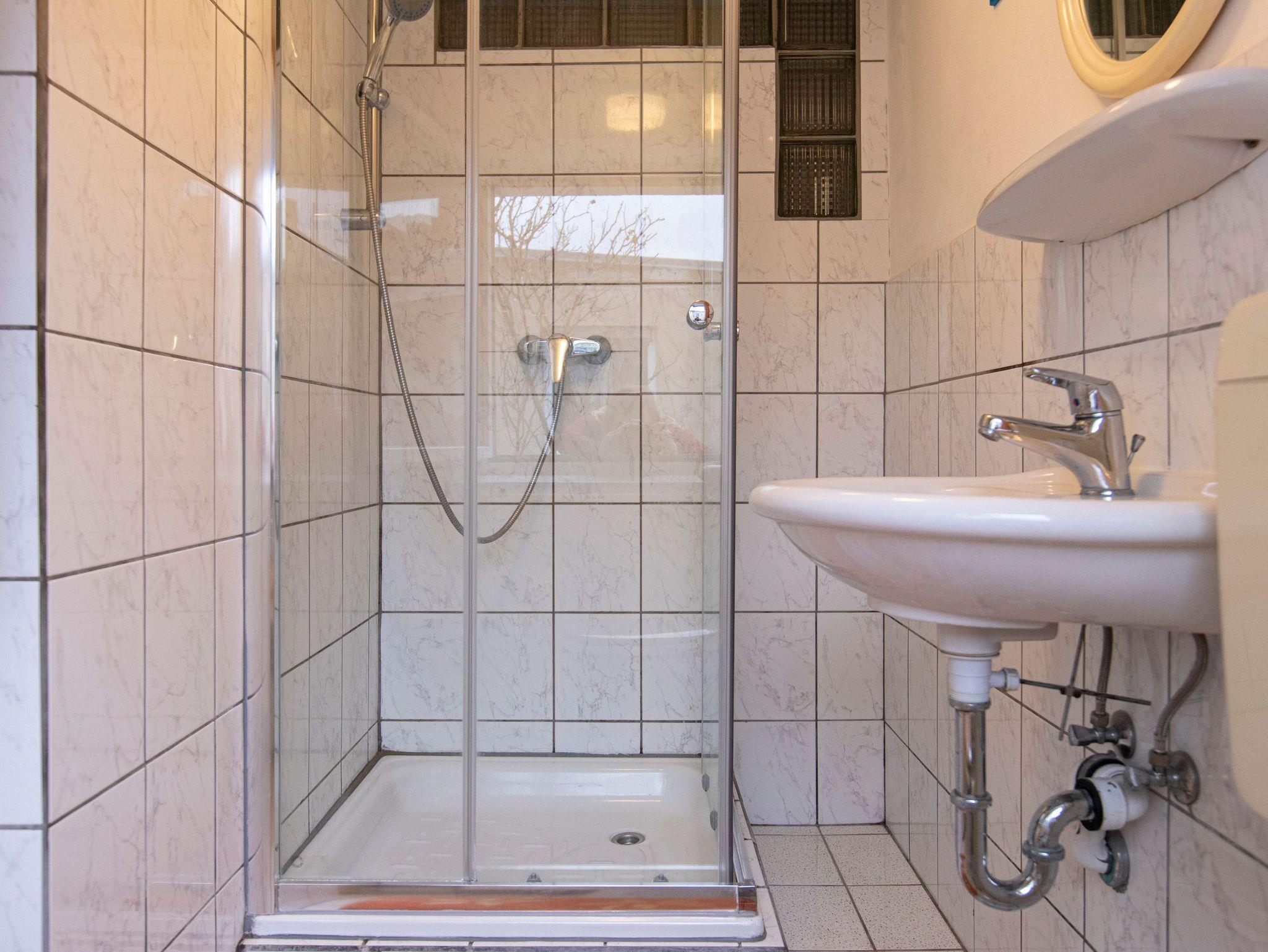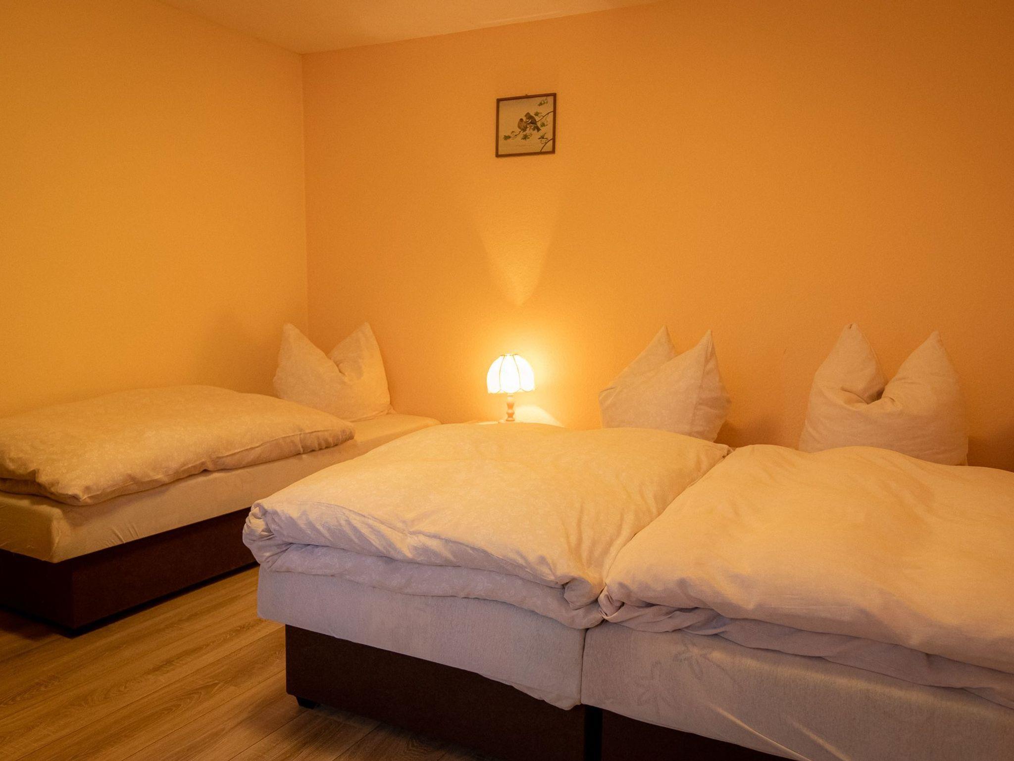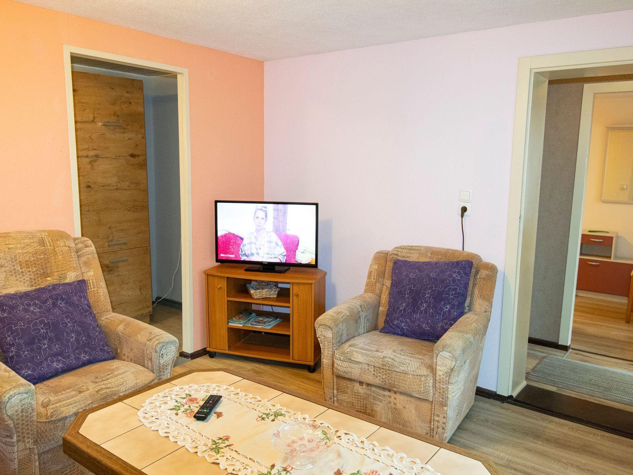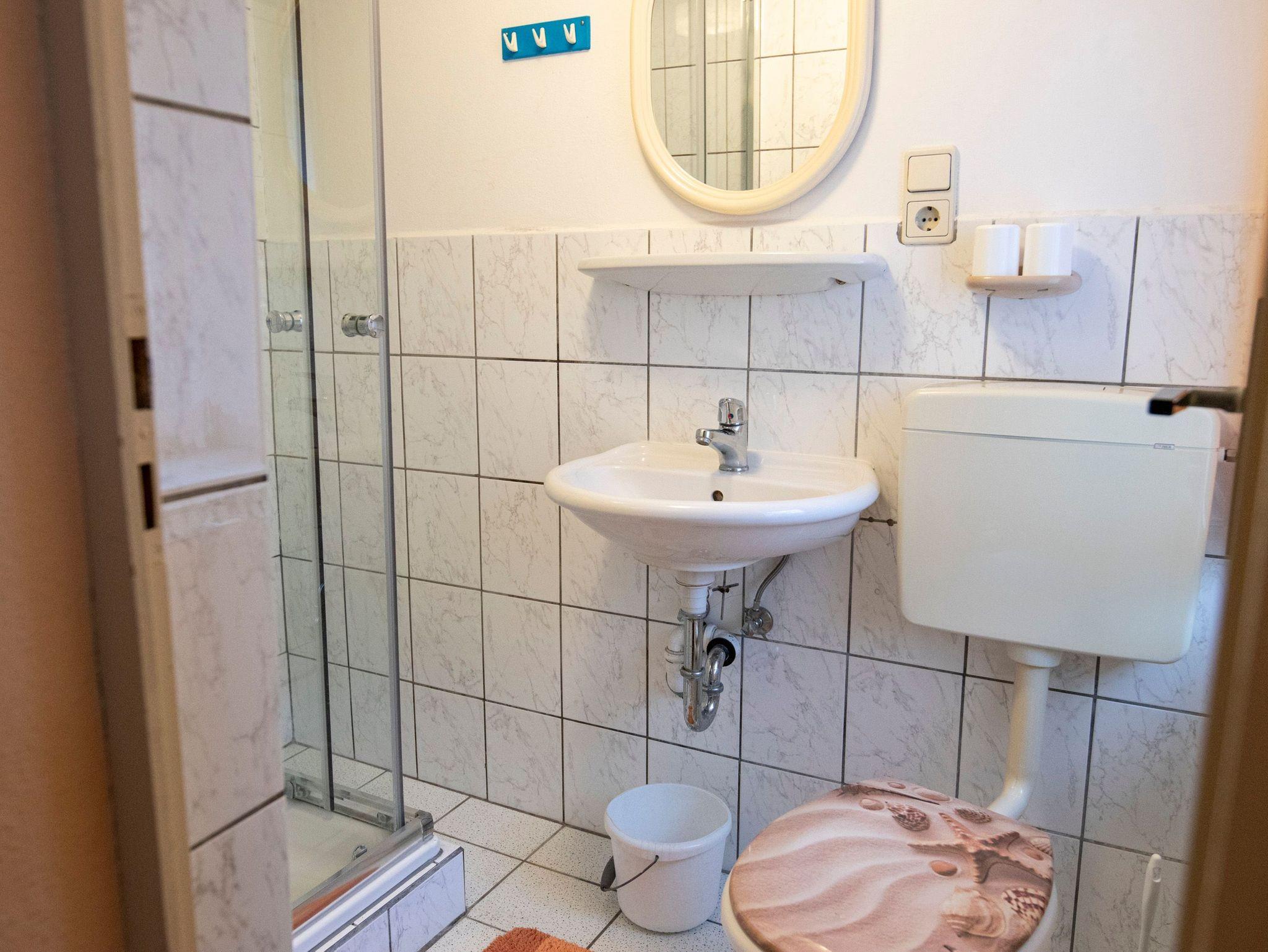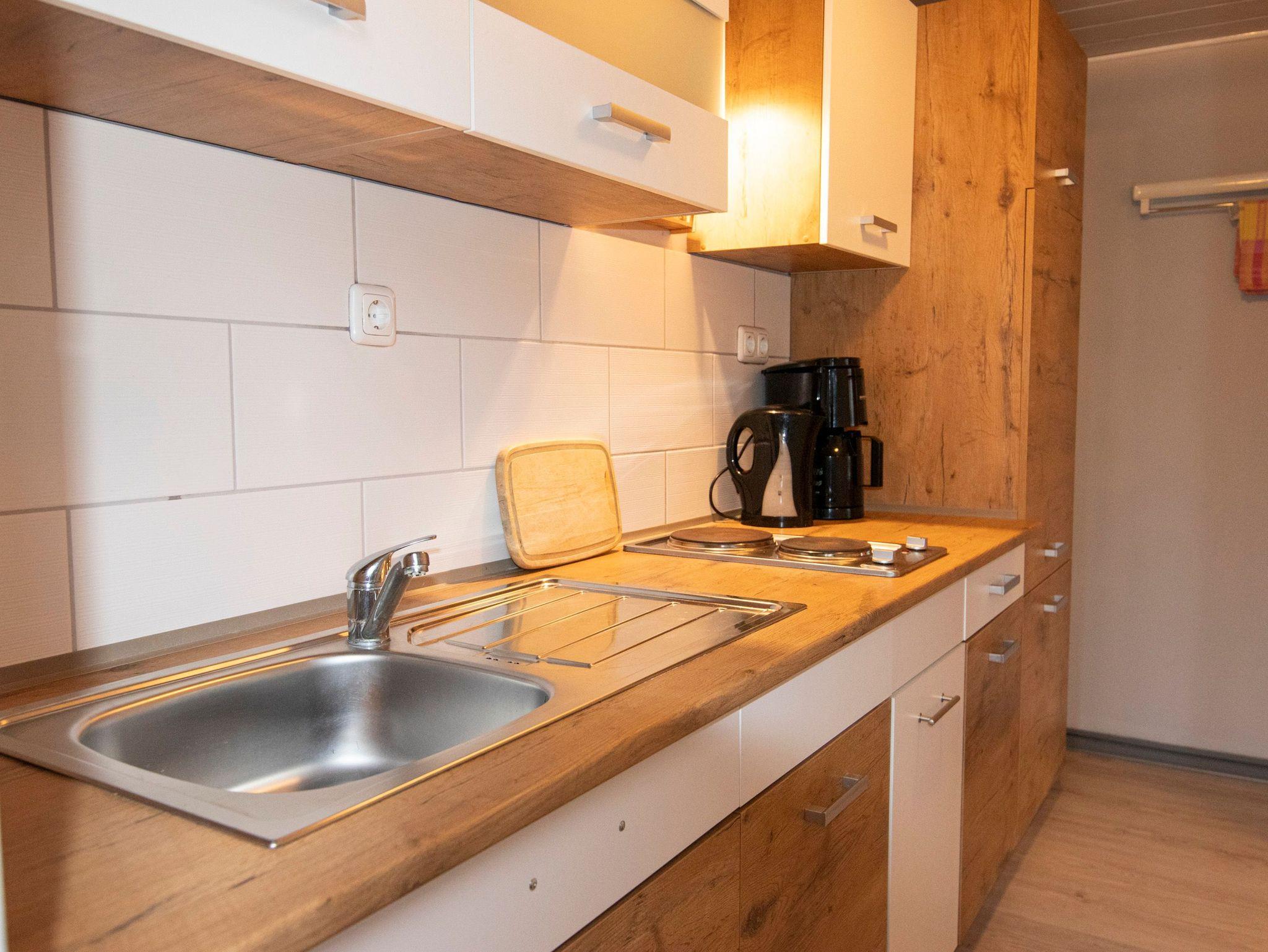 Über den Hof gelangen Sie in die 25m² Ferienwohnung, in einem Anbau des Haupthauses. Vom Eingangsbereich mit Flur gelangen Sie zur linken Seite in die Wohnstube, mit Sofa, 2 Sesseln, TV und Radio. Vom Wohnraum aus kommen Sie in die kleine komplett ausgestatette Küche mit 2-Platten-Herd, Kühlschrank, Kaffeemaschine, Wasserkocher, Sandwichtoaster etc. Vom Flur gelangen Sie rechts in den Schlafraum mit 3 Einzelbetten (2 zusammen gestellt). Das Bad verfügt über Dusche und WC.