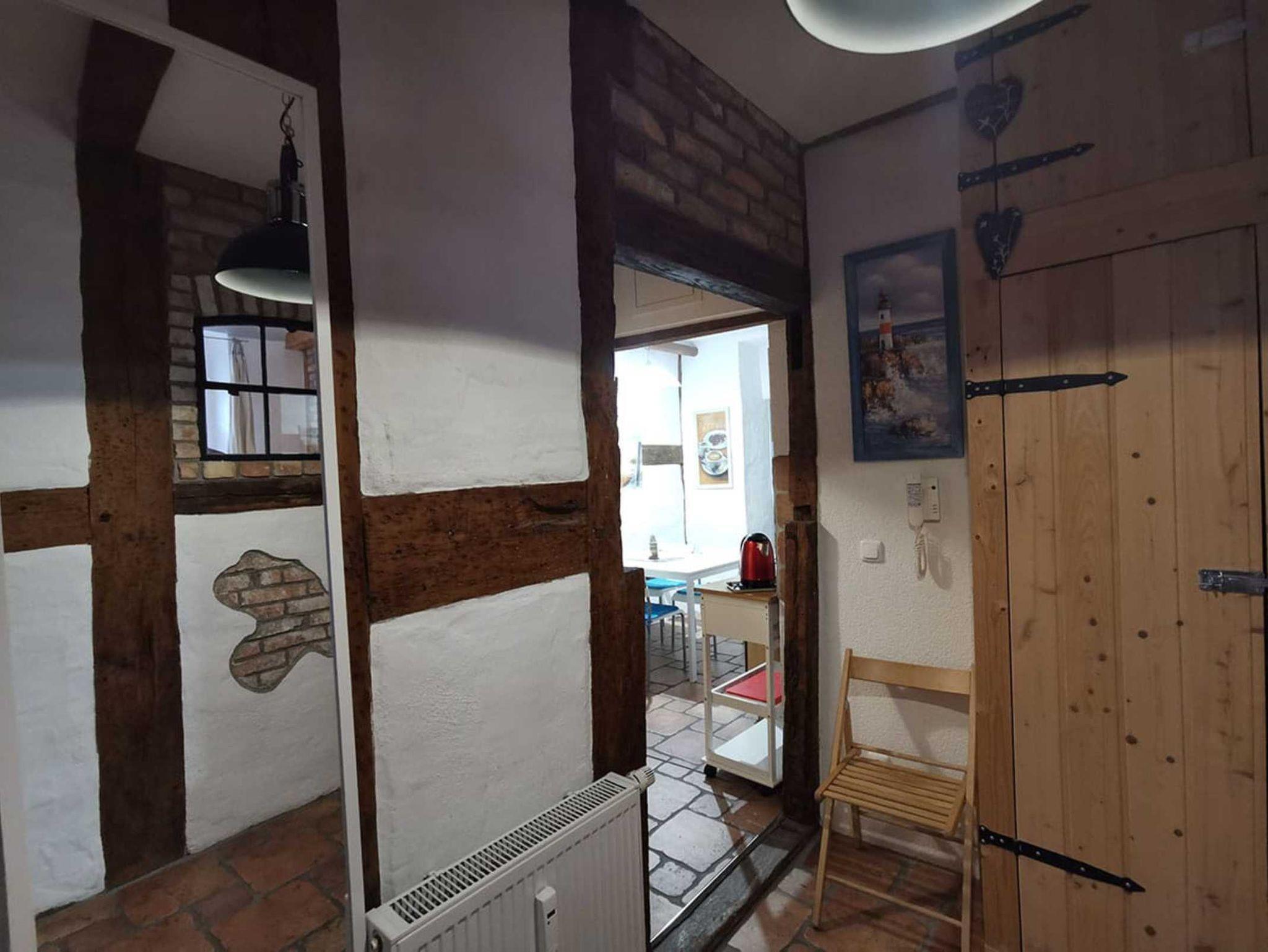 Unsere Ferienwohnung (ca 70 m²) befindet sich in der Frankenstr. 49 im Erdgeschoss, direkt in der Altstadt in Hafennähe. Sie verfügt über ein Wohnzimmer mit großem Esstisch für 6 Personen und 2 Schlafzimmer. Die Aufbettung für die 5. und 6. Person befindet sich auf der Schlafcouch im Wohnzimmer. Die Küche mit Einbauküche und großem Esstisch hat Zugang zur Terrasse, mit Blick zum historischen Innenhof. Das Bad ist gefliest mit WC und Dusche.