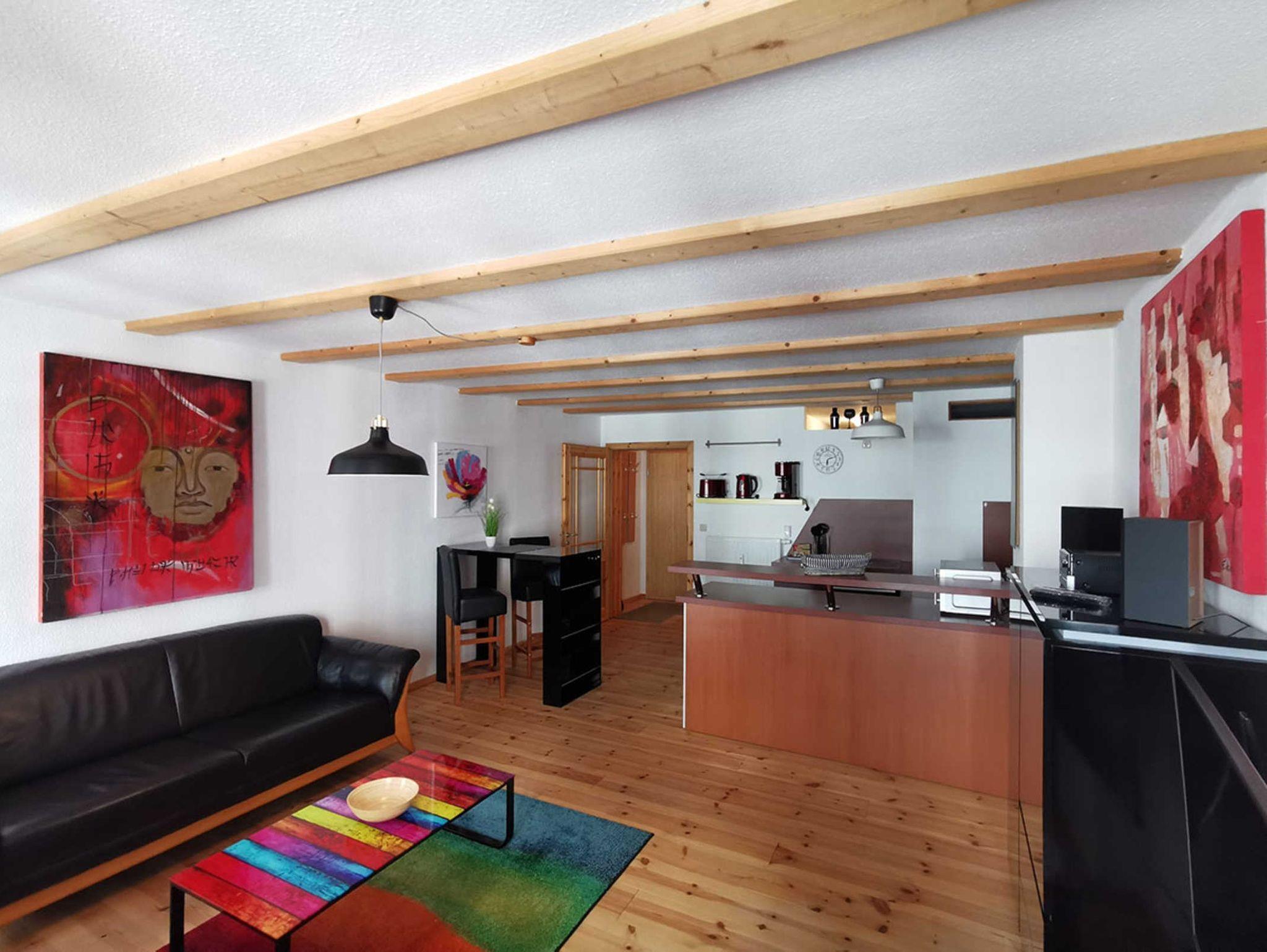 Wohnzimmer: großer Wohnraum mit offener Küche, Couch für 2 Personen, TV, erhöhte Sitzecke