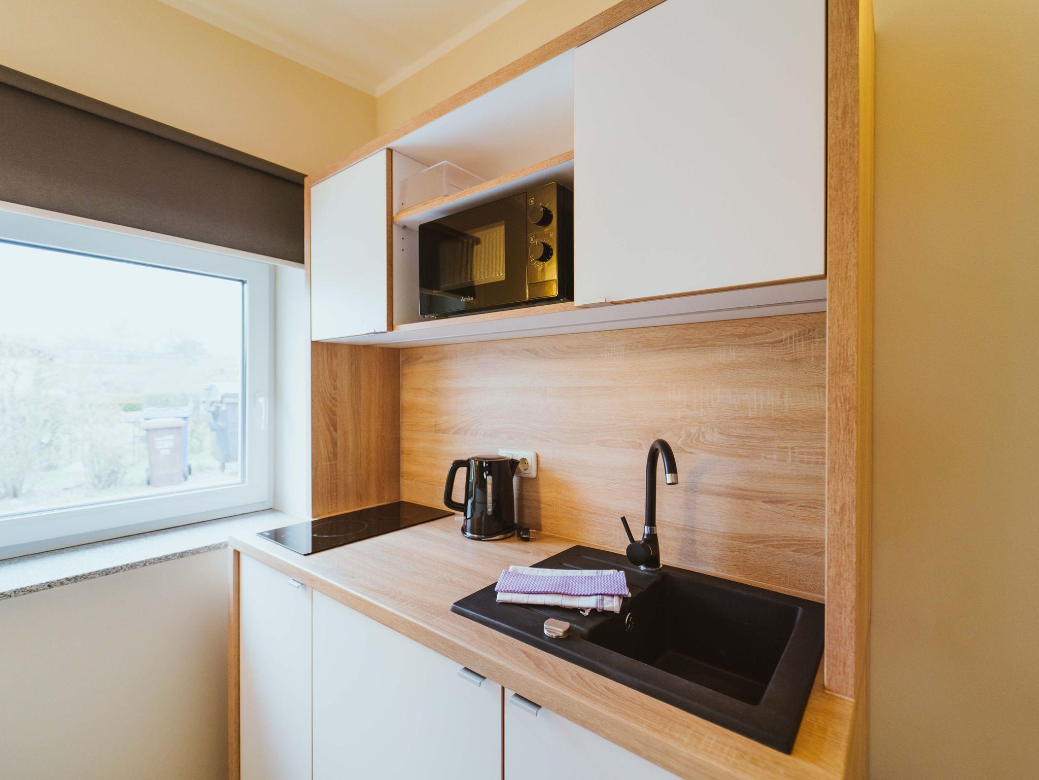Das Studio M ist ca. 18qm groß und verfügt über zwei Betten (90×200 cm), einen Schrank sowie eine Küchenzeile mit Kochfeld, Kühlschrank, Kaffeemaschine, Wasserkocher und einer Mikrowelle. Geschirr und Besteck ist für Zwei Personen vorhanden.
