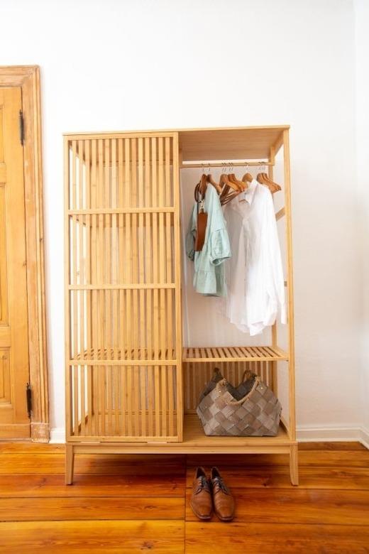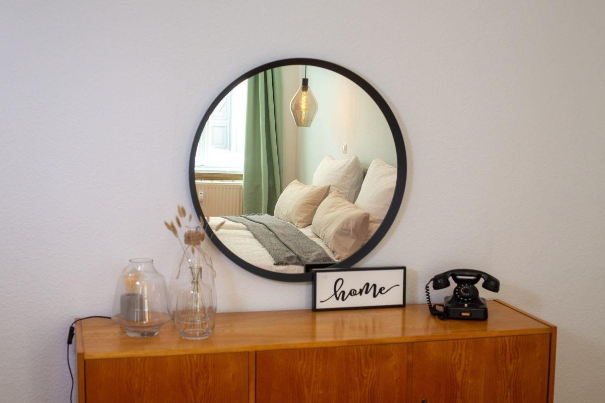 Wenn sie dann erschöpft vom Ausflug wiederkommen, können Sie sich im angrenzenden Schlafzimmer erholen. Öffnen Sie die historische Flügeltür, es erwartet Sie ein gemütliches 1,80m*2,00m Bett, mit hochwertigen in Mecklenburg-Vorpommern hergestellten Matratzen mit bestem Komfort. Sowohl ein offener Kleiderschrank und eine Kommode stehen Ihnen für Ihre Bekleidung zur Verfügung.