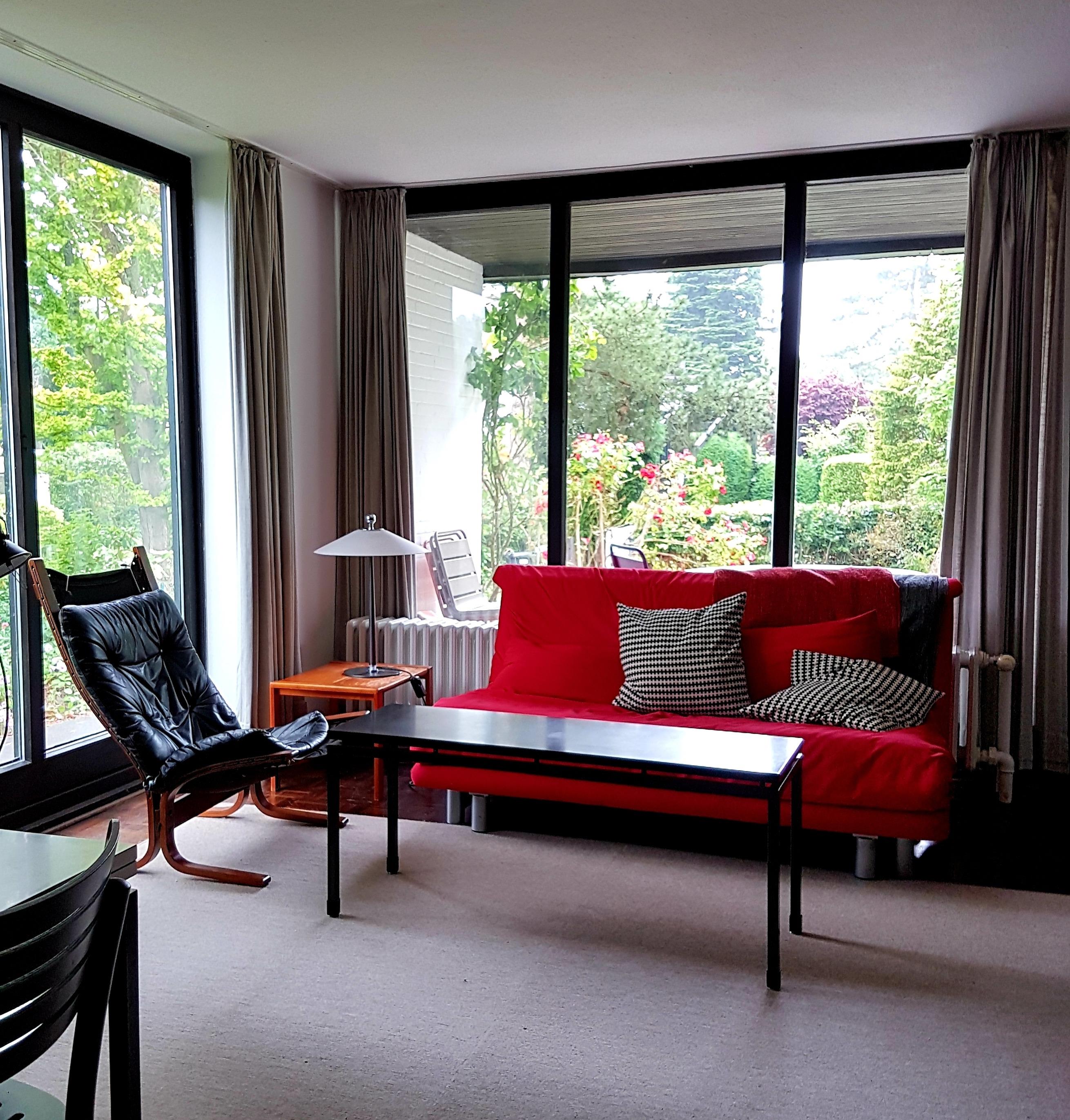 Passend zur Architektur ist die Inneneinrichtung überwiegend im Stil der 60er Jahre gehalten, typisch sind die Holzeinbauten, das dunkle Parkett und die Panoramafenster. Die Schlafräume sind mit Tretfort Teppich ausgelegt . Das Wohn- und Esszimmer mit Durchreiche zur Küche öffnet sich zur geschützten Loggia, die direkt in die Terrasse übergeht.