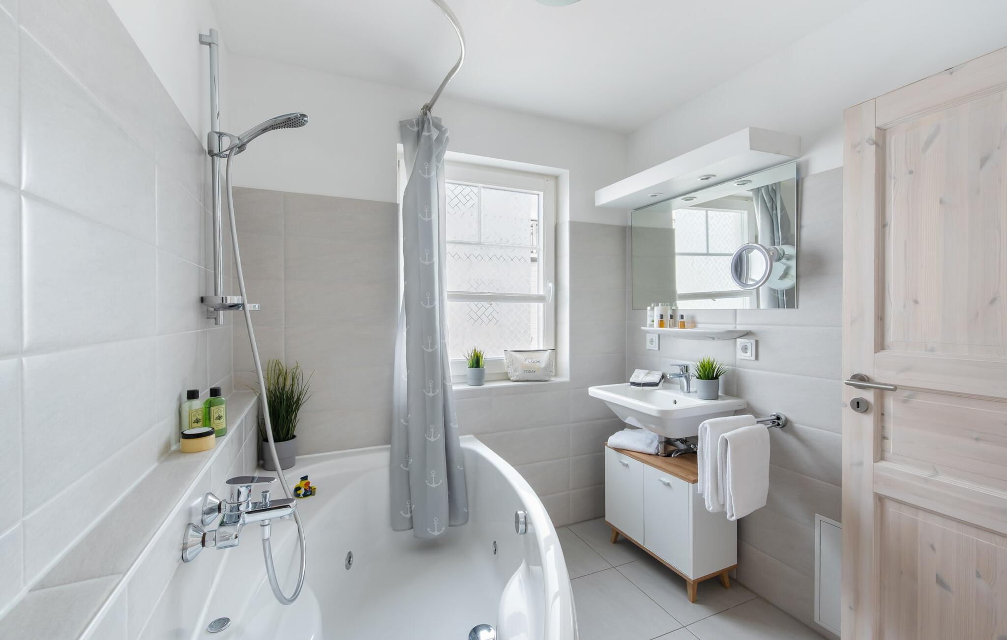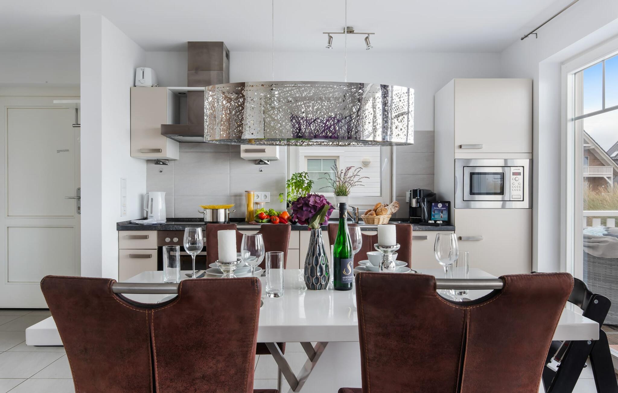 BEACH VILLA: Hvis I er så heldig at kunne leje BEACH VILLA til jeres familieferie, har I ramt jackpotten. Denne ejendom imponerer ikke kun med sin førsteklasses beliggenhed, men også med sin højkvalitets og børnevenlige indretning. Beliggende direkte ved lystbådehavnen, i første række til stranden i feriestedet ved Østersøen, med en uhindret udsigt over Østersøen og Slien, tilbyder STRANDVILLA en perfekt beliggenhed til en afslappet ferie med eller uden børn. Den åbne stue/alrum med integreret tekøkken oversvømmes af lys, lyst og venligt takket være vinduesfronten fra gulv til loft. Udsigten falder ud over den tilstødende terrasse på stranden og havet (Østersøen/Schlei). Et overvældende øjeblik og feriefølelsen sætter ind med det samme. Den moderne indretning med nogle få udvalgte, subtile maritime detaljer udstråler komfort, og det veludstyrede tekøkken glæder ethvert hjerte. At tilberede et måltid her og derefter spise det enten ved det stilfulde spisebord eller på terrassen er sjovt, for alt er ledsaget af udsigt til stranden og vandet. I opholdsområdet inviterer den rummelige L-formede sofa jer til at slappe af og se tv, og Wii-spillekonsollen sikrer variation og sjov for unge og gamle og hele familien, ikke kun på regnvejrsdage. På første sal byder det store soveværelse på en komfortabel dobbeltseng og en lille balkon. Det andet soveværelse er indrettet med to enkeltsenge. Begge værelser har udsigt til stranden og hvad kunne være dejligere end at falde i søvn og vågne ved siden af. I tror måske, I stadig drømmer. Ud over alt det nyttige byder det komplette badeværelse på et boblebad med bruser, som garanterer starten på en vellykket ny feriedag. Højdepunktet i STRANDVILLA er uden tvivl 3. sal, der præsenterer sig som en privat wellness-oase med finsk sauna med udsigt til stranden og bruser i gulvniveau. Når I først er på toppen, byder relaxområdet jer velkommen med gulv til loft-vinduer og en fænomenal udsigt hele vejen rundt til stranden og vandet. På den tilstødende, store terrasse inviterer en hyggelig dobbelt liggestol jer til at drømme og slappe af efter en saunasession. En ferie kunne ikke være bedre. Udover et gæstetoilet i stueetagen tilbyder STRANDVILLA også en parkeringsplads direkte ved huset. Vores favoritsted: Vi kan ikke bestemme os for denne lejlighed, den er smuk overalt. Bemærk venligst: OstseeResort Olpenitz er meget populært, og der bygges fortsat i parken. Ikke desto mindre kan I se frem til en 5-stjernet standard og et førsteklasses ophold. Byggeaktiviteterne kommer ikke til at forstyrre jer på ferien, og derfor gives der ikke yderligere afslag i prisen.