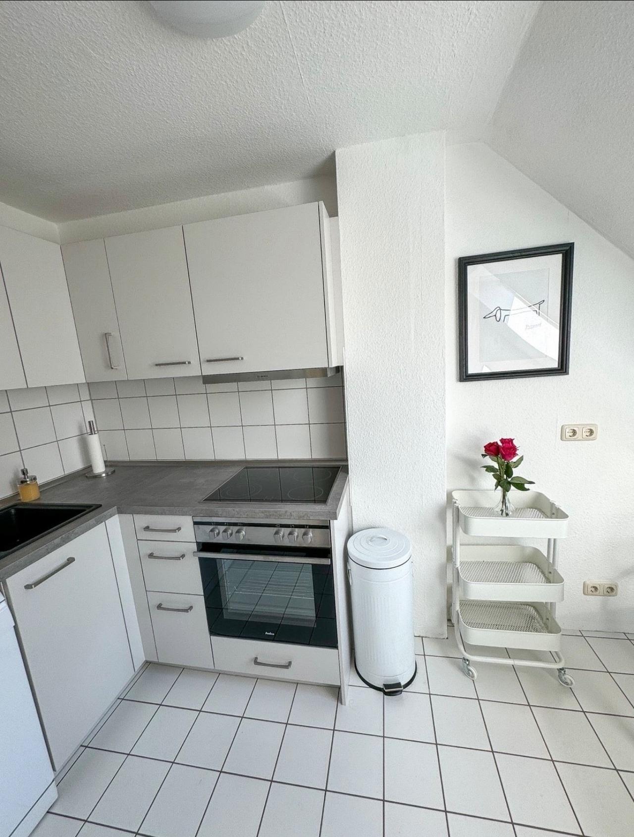Die gut ausgestattete Küche besitzt unter anderem einen Kühlschrank, einen Herd zum Kochen und sogar eine Spülmaschine.