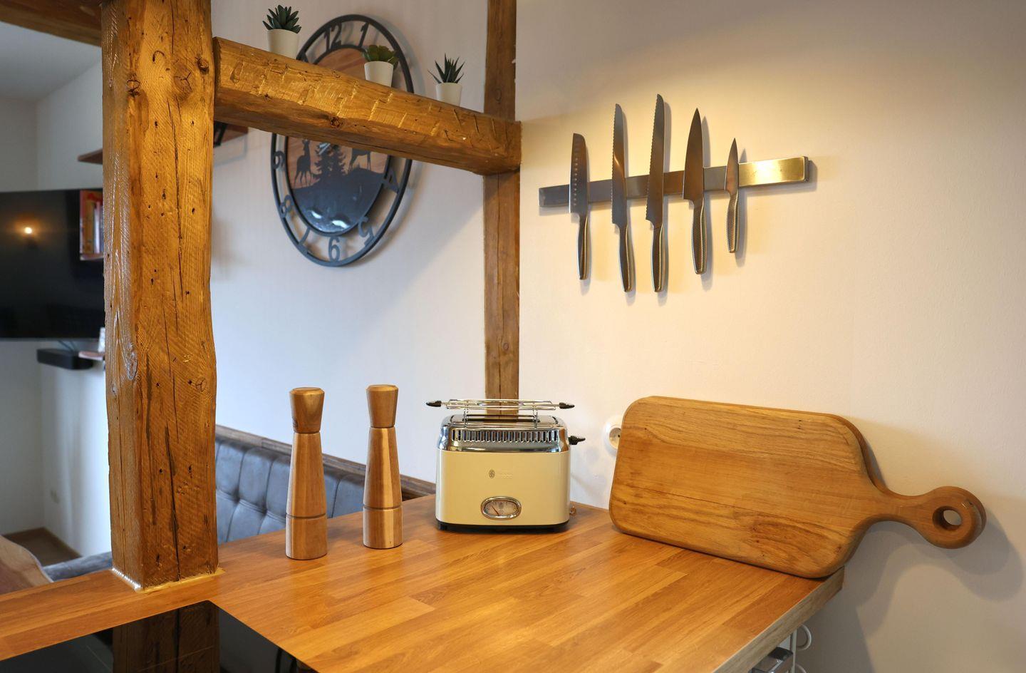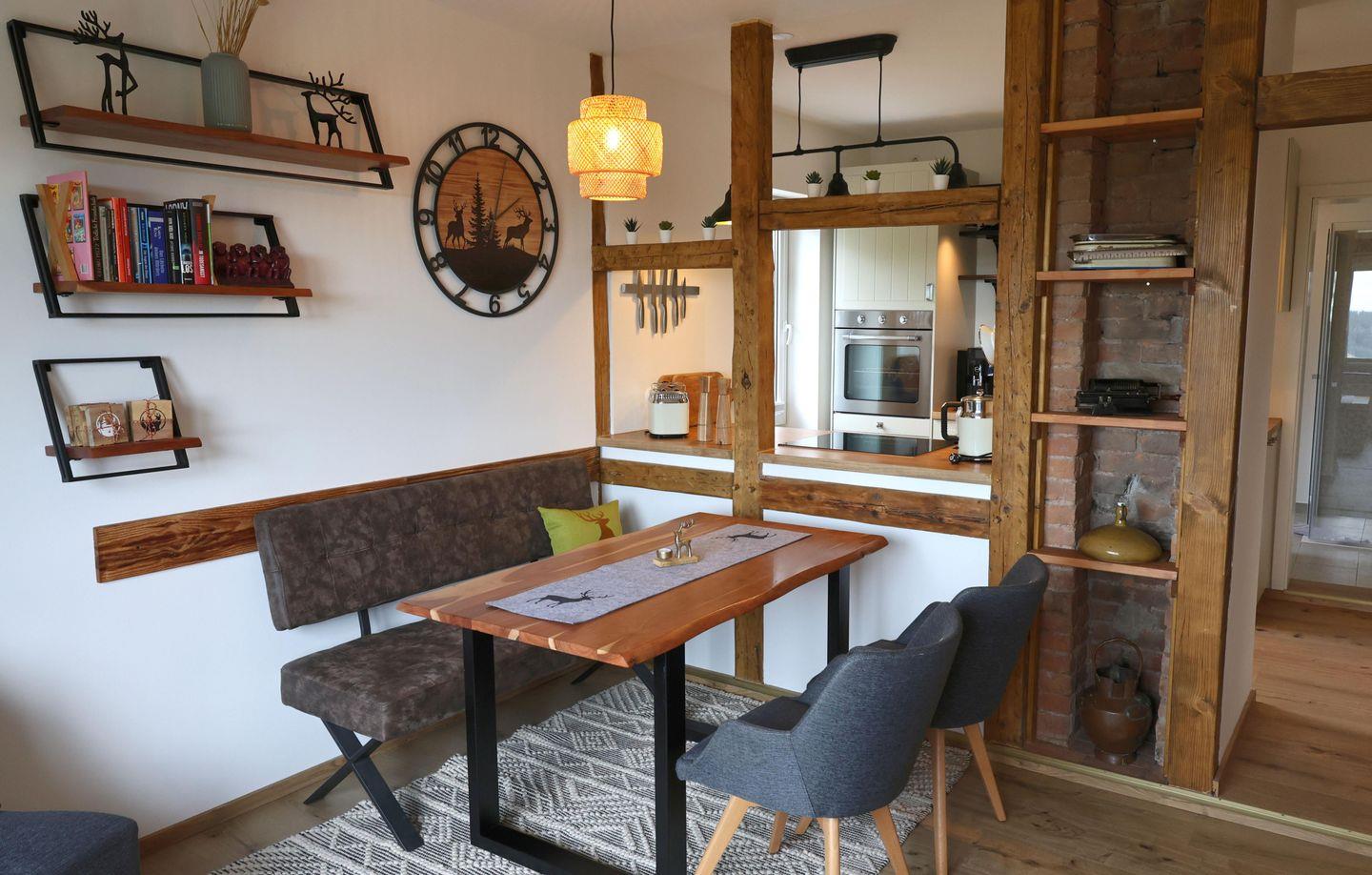 Neben dem Esstisch im Wohnzimmer gibt es noch zwei weitere Essbereiche – beide im Erdgeschoss für unterschiedliche Gruppengrößen eine ideale Alternative. Ob Frühstück im kleinen Kreis oder ein gemeinsames Abendessen mit allen: Hier findet ihr Platz, Gemütlichkeit und Raum zum Zusammensein.