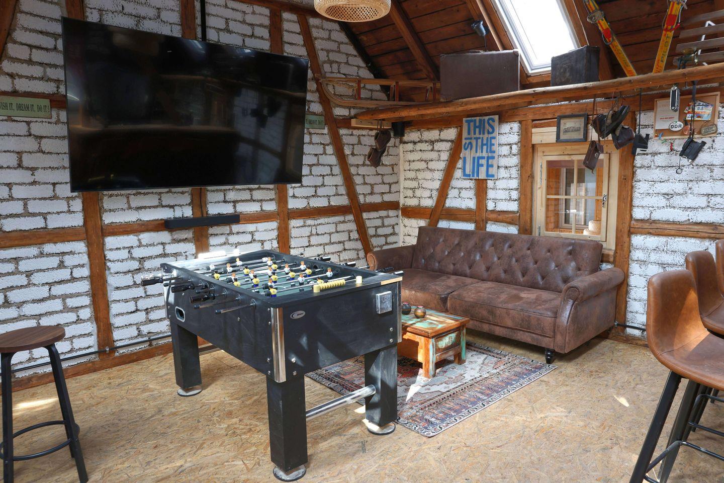 Ausgestattet mit einem Tischkicker, XXL-TV für Sport oder Filmabende, Bar mit Kühlschrank, Bierzapfanlage & Spüle. Hier habt ihr einen Ort, an dem ihr ungestört feiern und lachen könnt – ohne das Wohnhaus „aus dem Takt“ zu bringen. Perfekt für Gruppen, die gemeinsam etwas erleben wollen.