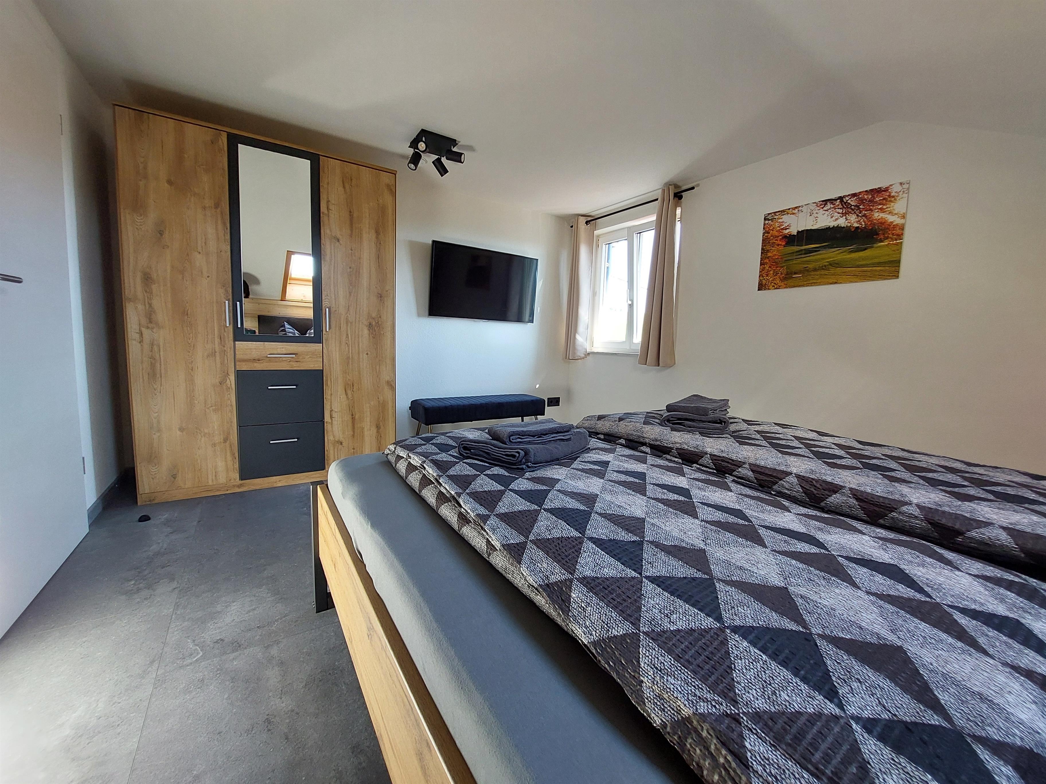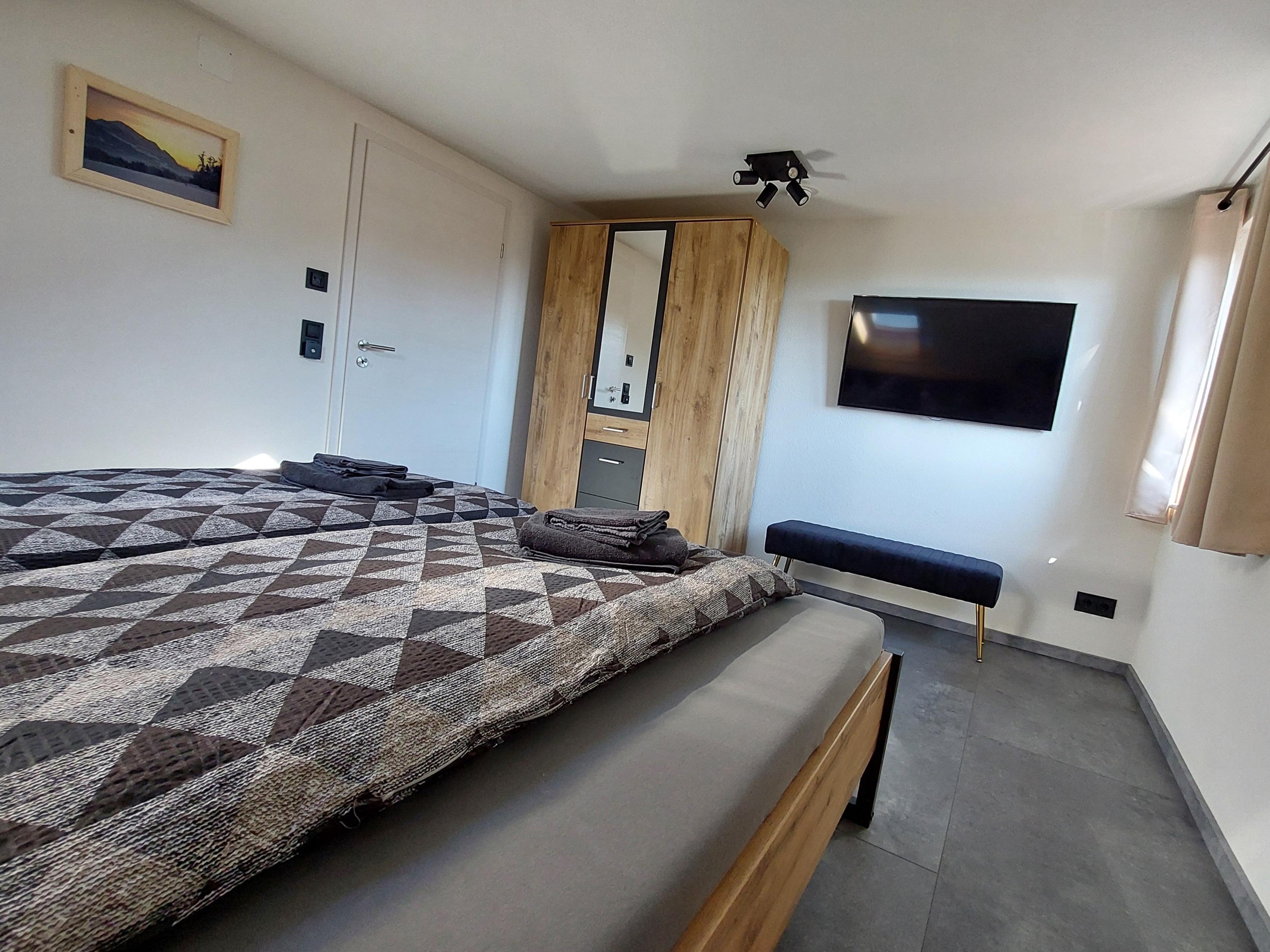 Schlafzimmer mit bequemem Betten, Kleiderschränke und TVs