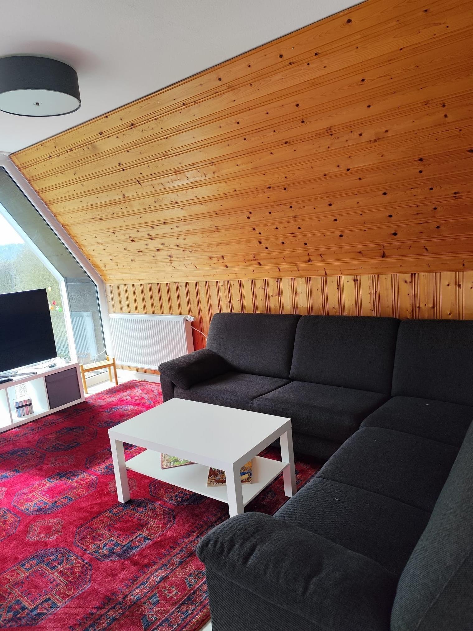 Das Ferienhaus bringt nicht nur eine außergewöhnliche Architektur mit sich, sondern besticht auch durch den renovierten Innenraum. Im Erdgeschoss findet sich ein großer Wohn-, Essraum mit Panoramafenster in den Garten. Außerdem gibt es ein neu renoviertes Badezimmer mit begehbarer Dusche. Über eine offene Treppe im Wohnzimmer gelangt man in das Obergeschoss. Hier finden sich zwei Schlafzimmer mit insgesamt vier Schlafmöglichkeiten (ein Babybett kann zusätzlich mit dazu gestellt werden).