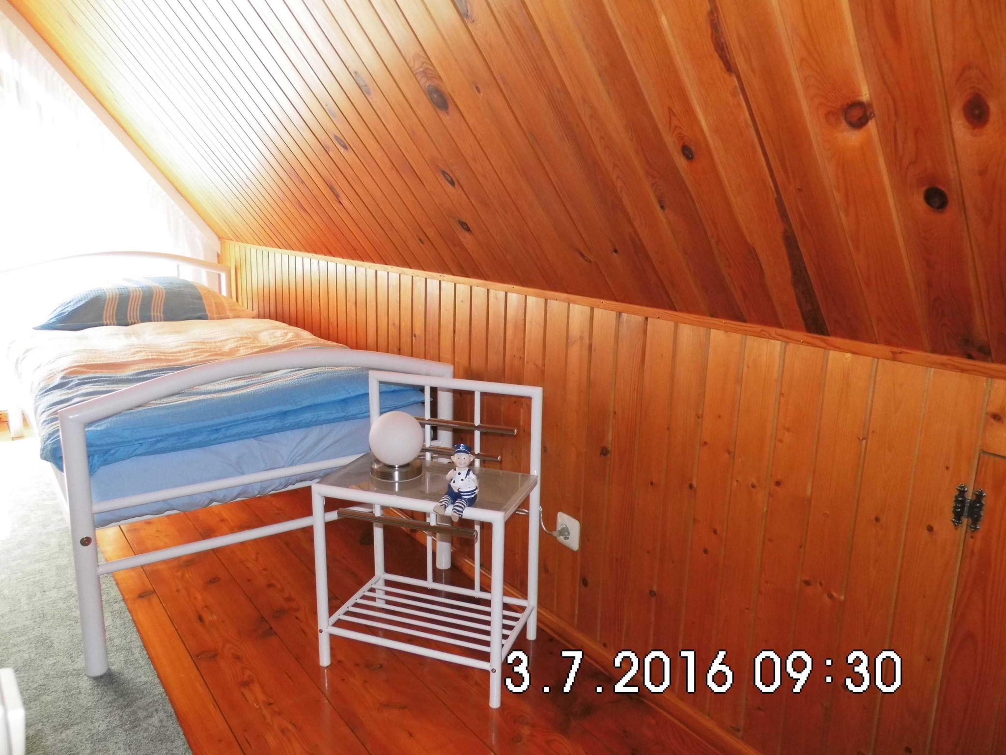 Im Zimmer befindet sich eine Treppe nach oben, wo sich der Schalfbereich befindet. Es ist ein gemütliches Zimmer mit einem einzelnes Bett auf der einen Seite und auf der anderen Seite zwei einzelne Betten.Der Stauraum für die Sachen befindet sich in den Seitenwänden.