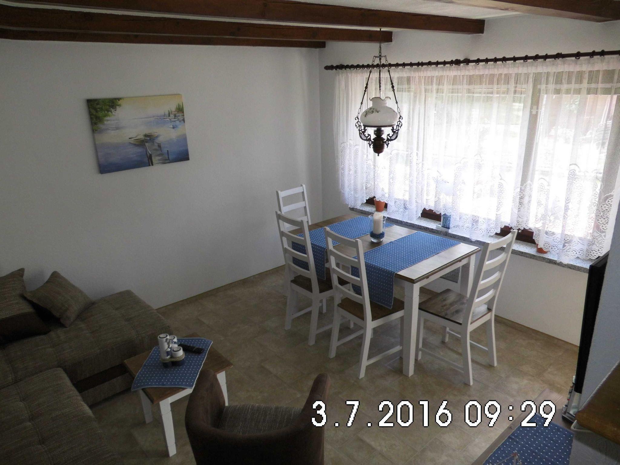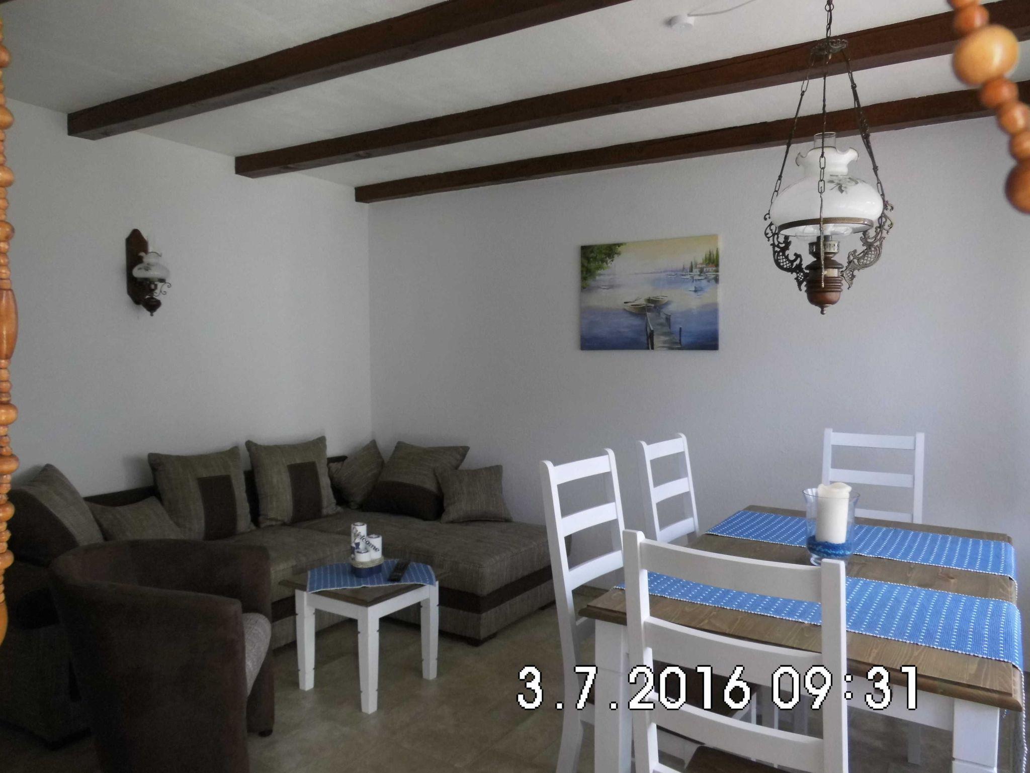Weiter gehts in den Wohn-Eßbereich. Die Eckcouch lädt zum kuscheln ein. Der TV- Flachbildschirm und ein Radio mit CD bringen die richtige Stimmung dazu. Am großen Eßtisch kann man die Zeit mit Karten- oder Brettspiele, die sich im Ferienhaus befinden, verbringen.