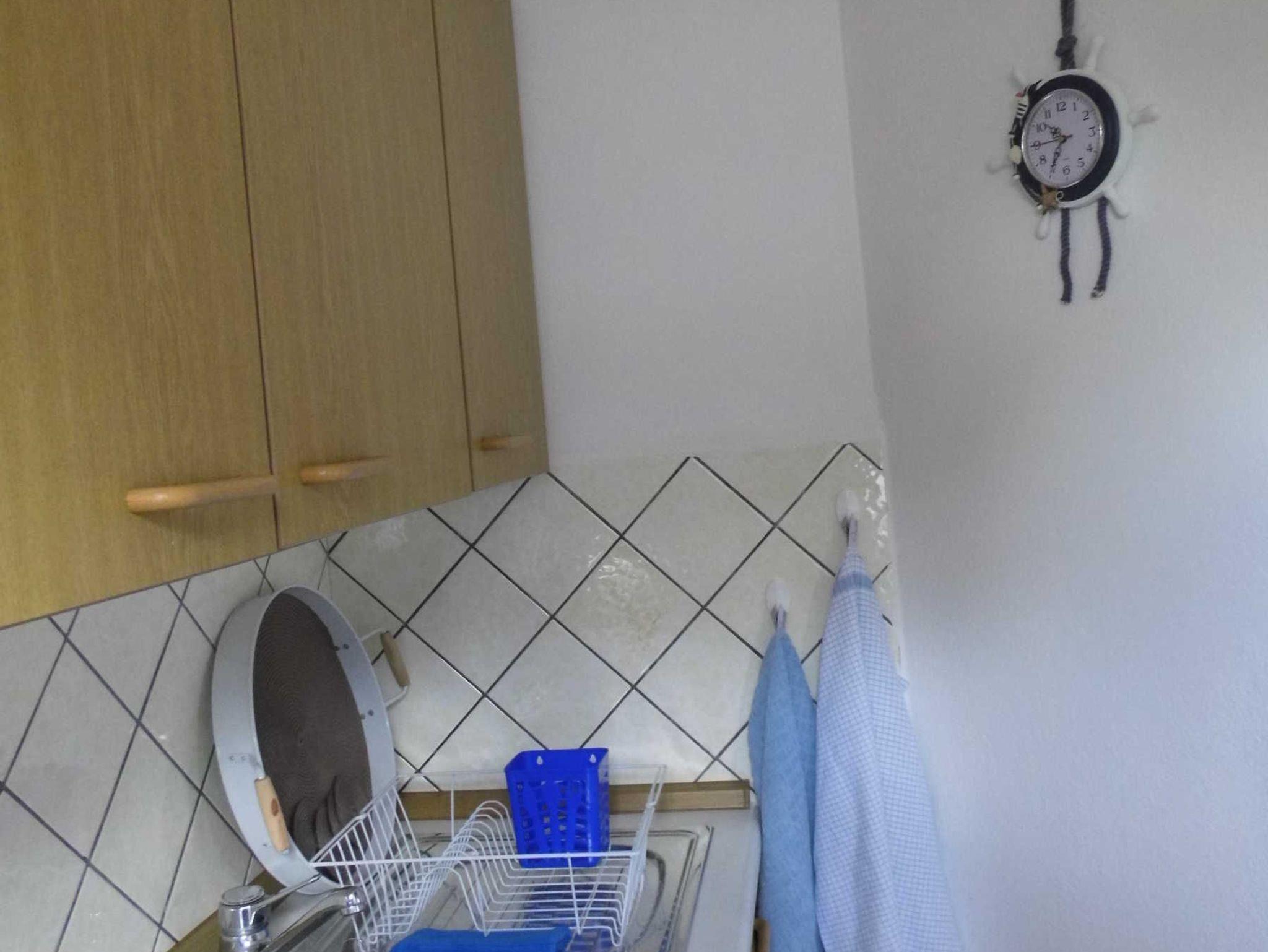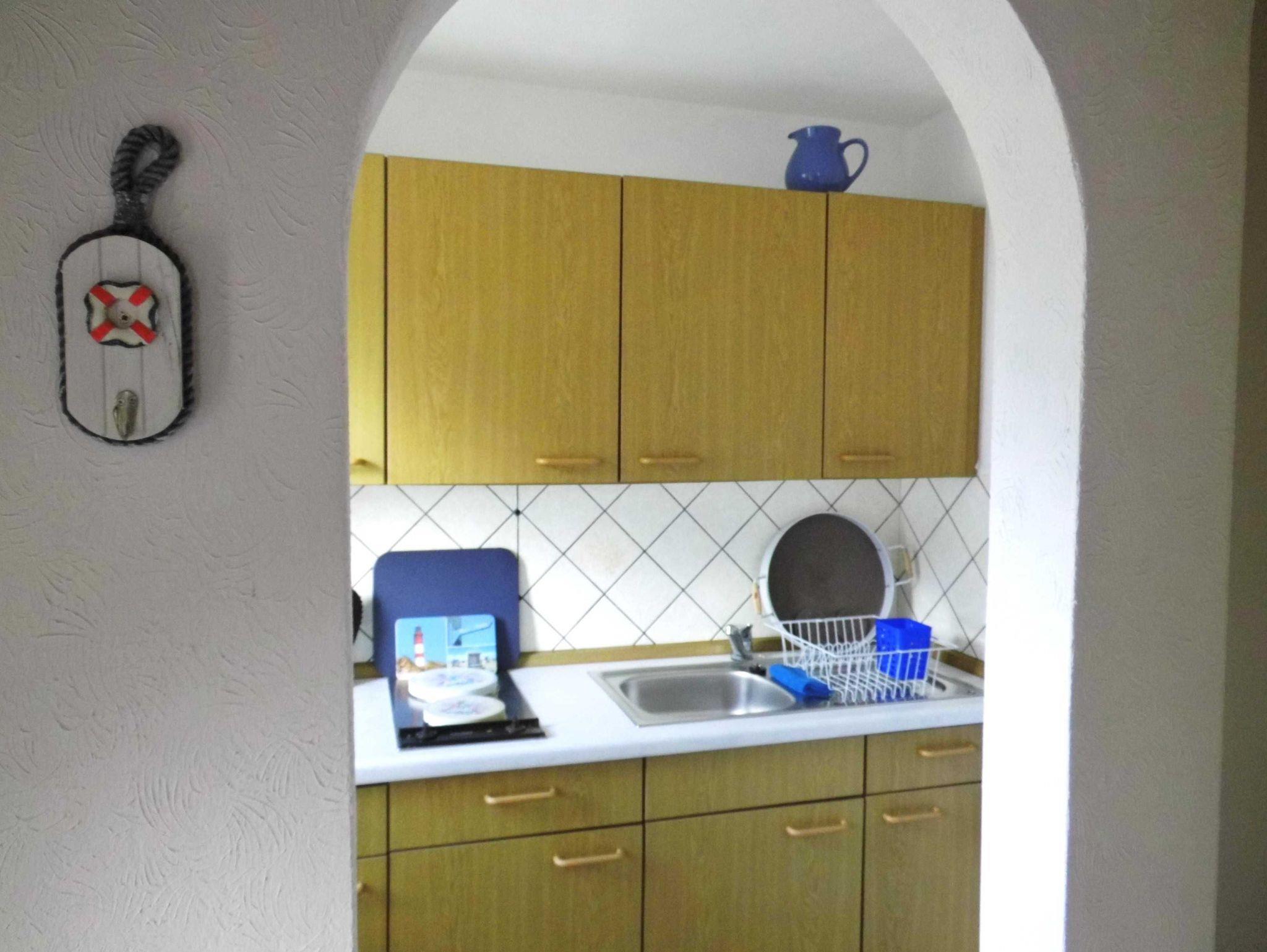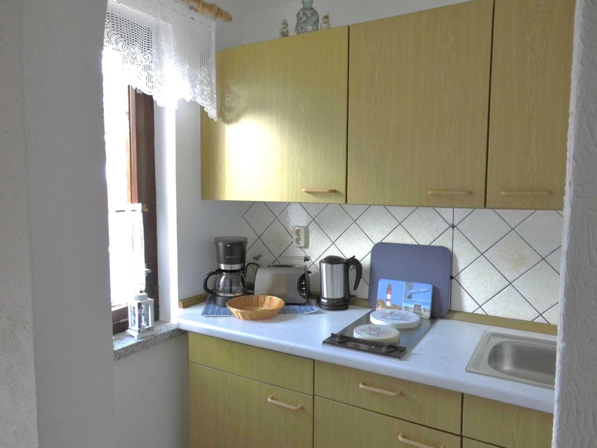 Wenn Sie in das Häuschen eintretten, kommen Sie in ein hellen gefließten Flur. Von hier schaut man in die offene Küche. Dort finden Sie folgende Ausstattung vor: Mini-Backofen, Wasserkocher, Toaster, Kaffeemaschine+Filter,Kühlschrank, zwei Kochplatten, Geschirrhandtücher, Lappen, Spülmittel und was man so in der Küche braucht sind vor Ort.