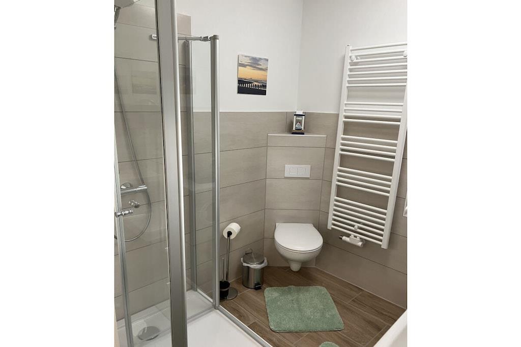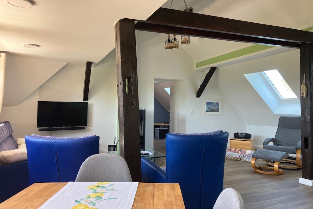 Vores nyrenoverede (2022) tidligere bondegård i Hof Gronow, nær Strelasund og Tremter Bodden-stranden (400 m) mellem Stralsund og Greifswald, tilbyder feriegæster en komfortabel, kærligt indrettet 94 m² (i henhold til DIN-standarder) maisonettelejlighed til op til 4 personer. Lejligheden er blevet tildelt 4 stjerner af den tyske turistforening (DTV). Beliggende i smukke naturlige omgivelser kan I nyde jeres ferie her. Med egen indgang, privat XL-terrasse med adgang til haven og privat parkeringsplads tilbyder den rummelige maisonettelejlighed, som i bund og grund er et pickup truck-hus (øverste etage tilhører udelukkende maisonetten): I stueetagen: en garderobe, et nyt flisebadeværelse med bruser/toilet/vaskemaskine og et fuldt udstyret køkken med opvaskemaskine og spisebord til 4 personer. På øverste etage: Hele øverste etage tilhører udelukkende ferielejligheden og tilbyder en storslået udsigt over vandet, Rügen eller langt over de tilstødende marker. Den lyse stue, der strækker sig helt op til gavlen og har charmen fra de cirka 100 år gamle, restaurerede tagbjælker, byder på syv vinduer og panoramaudsigt mod vest og øst mod Rügen og Strelasund. Til køligere dage finder I en ny brændeovn med fedtstensplade (inklusive træ), samt en reol og et spilleskab. Ovenpå er der to soveværelser: "Fyrstuen" med eget flisebelagt badeværelse/bruser/toilet, der også er åbent ud til gavlen, og det rummelige "Rügen-udsigtsværelse", begge med ordentlige senge i massivt egetræ og nye madrasser. Hvert værelse har et klædeskab og nyt vinylgulv af høj kvalitet. Nogle vinduer har myggenet, og der er plisségardiner eller gardiner til mørklægning. Opholdsrummet er i henhold til DIN-standarderne (eksklusive skrålofter) 85 m². Den møblerede XL-terrasse med grill måler 36 m² (hvoraf 1/4 er inkluderet i beregningen). Nyd de storslåede solopgange og solnedgange fra øverste etage! Nybygget i 2022: 2 soveværelser, 2 badeværelser, 1 stor stue med satellit-tv, fuldt udstyret køkken med spiseplads. Op til 3 velopdragne hunde er velkomne, EURO6 pr. nat pr. kæledyr. Trappen er noget stejl og moderne, udstyret med bevægelsesaktiverede LED'er. Inkluderet: alle forbrugsvarer såsom elektricitet (ikke til elbiler), vand, varme, brænde, Wi-Fi, basale køkkenartikler (håndklæder, klude, opvaskemiddel, krydderier osv.). Slutrengøring (professionelt rengøringsfirma) er EURO115, plus omkostningerne til en hund, hvis relevant. Sengelinned og håndklæder er inkluderet (sengene er redt op). Ingen turistskat. I DDR-tiden var huset et FDGB-feriehus (Frie Tyske Fagforeninger) for børn. Indtjekning fra kl. 15.00, udtjekning senest kl. 11.00.