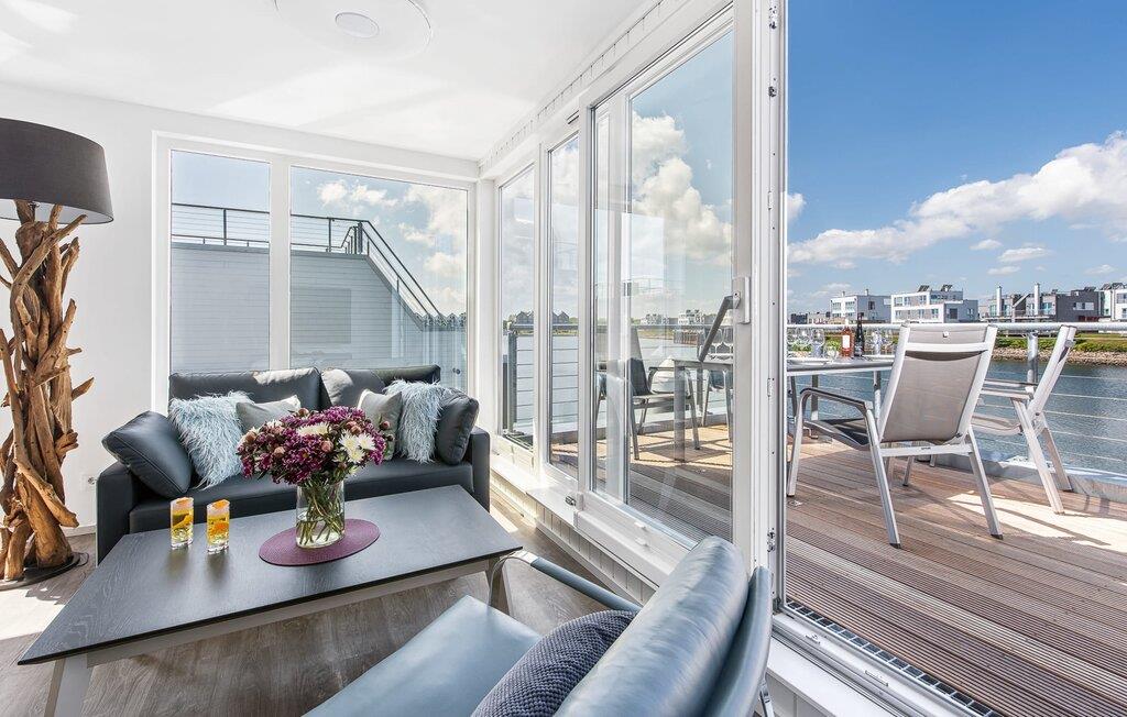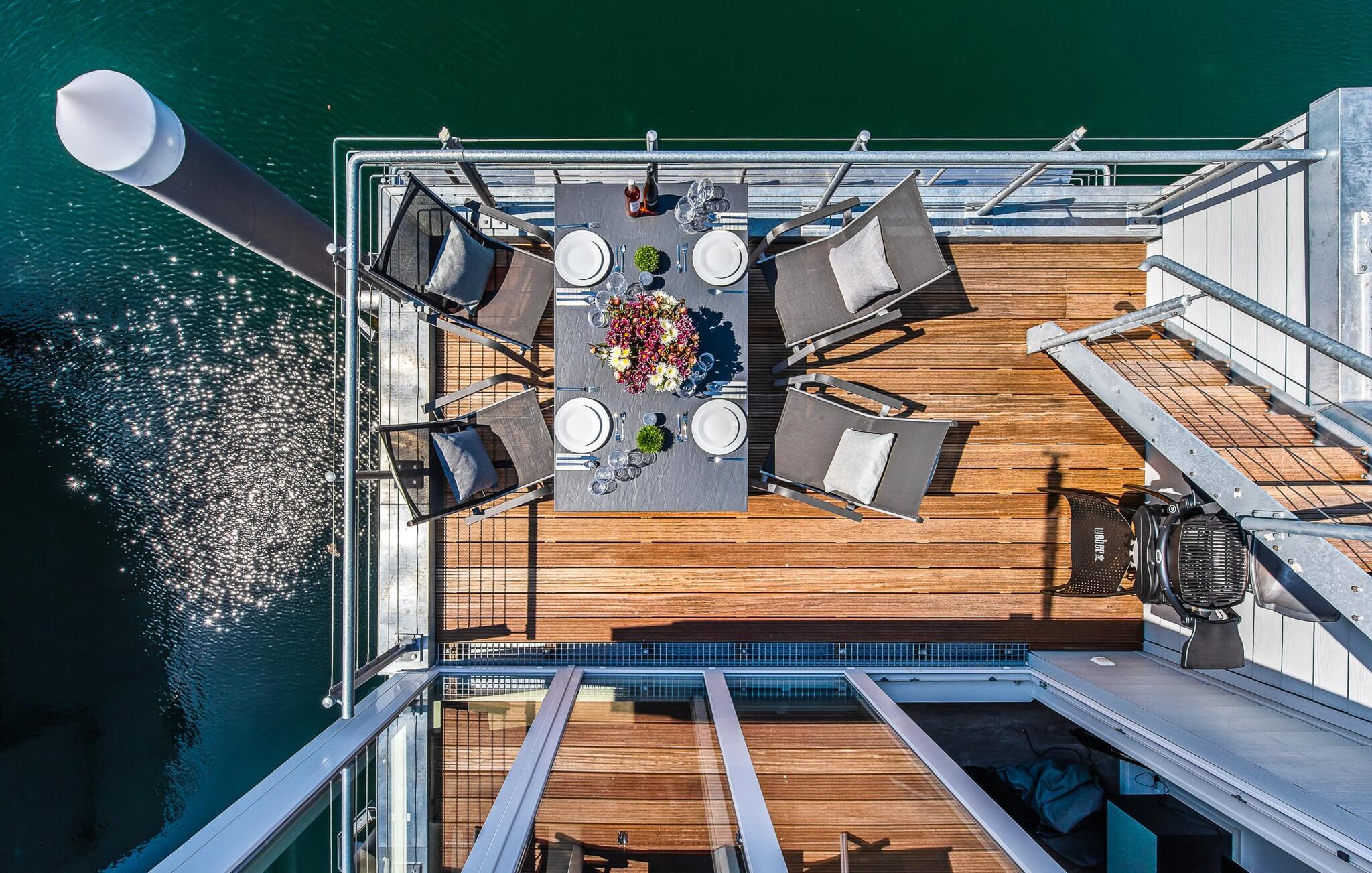 Det flydende hus strækker sig over tre plan. På øverste etage er der opholds- og spisestue i åbent plan med udsigt til vandet hele vejen rundt, fuldt udstyret køkken-alrum og tilstødende terrasse. Herfra kan I få adgang til den spektakulære tagterrasse med udsigt over sejl- og sportsbådshavnen, Sleien og dens udmunding i Østersøen. Udstyret med havemøbler af høj kvalitet, herunder en strandstol og lounge samt en Weber elektrisk grill, tilbyder terrasserne en ren feriefølelse og betagende solnedgange.