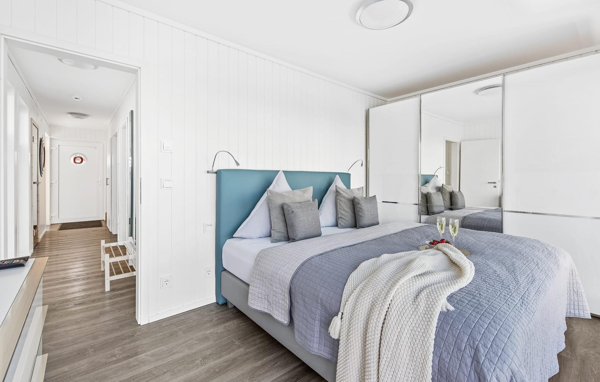 Husets afslapningsområde er i stueetagen med to soveværelser, badeværelse og sauna. Det store soveværelse imponerer med et panoramavindue fra gulv til loft, hvorigennem I kan nyde den betagende vandbaggrund og en tilstødende omgivende terrasse. Begge soveværelser er udstyret med boksmadrasser og har fladskærms-tv med hjemmeunderholdningsprogrammer.
