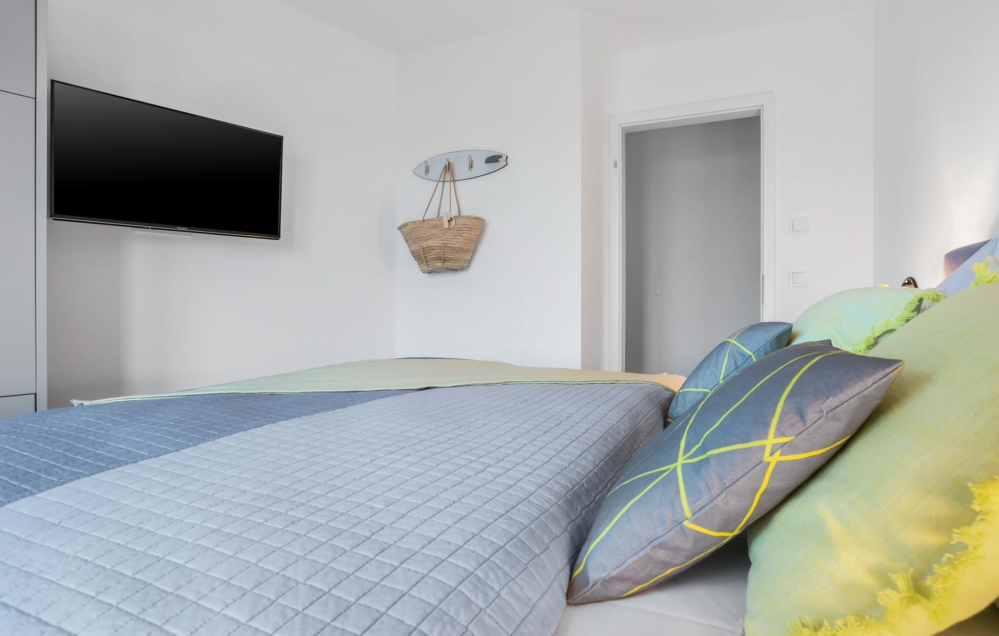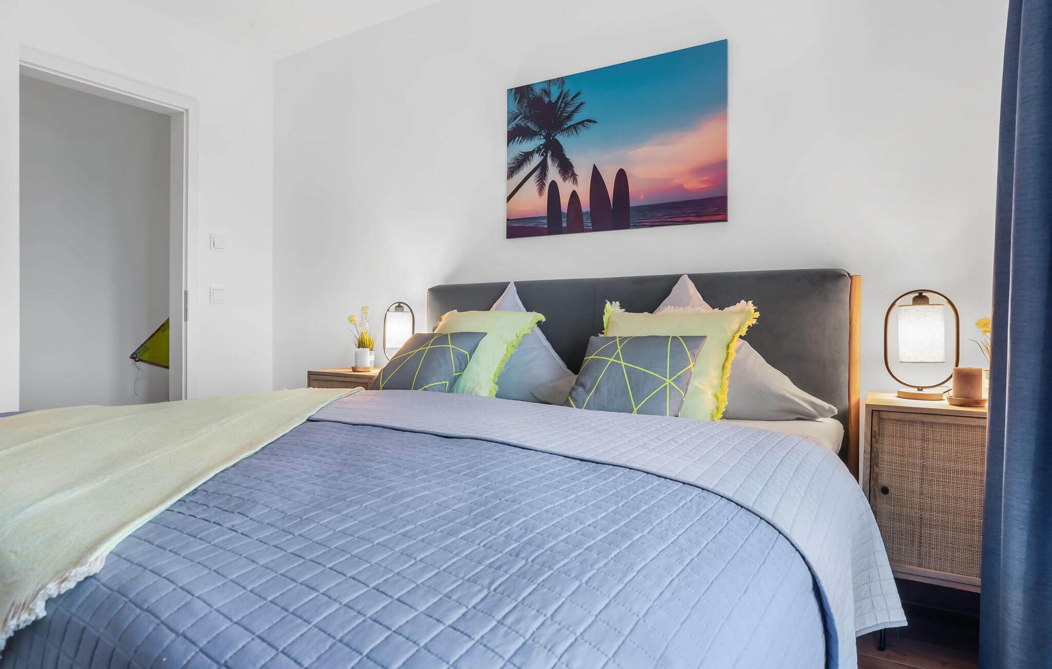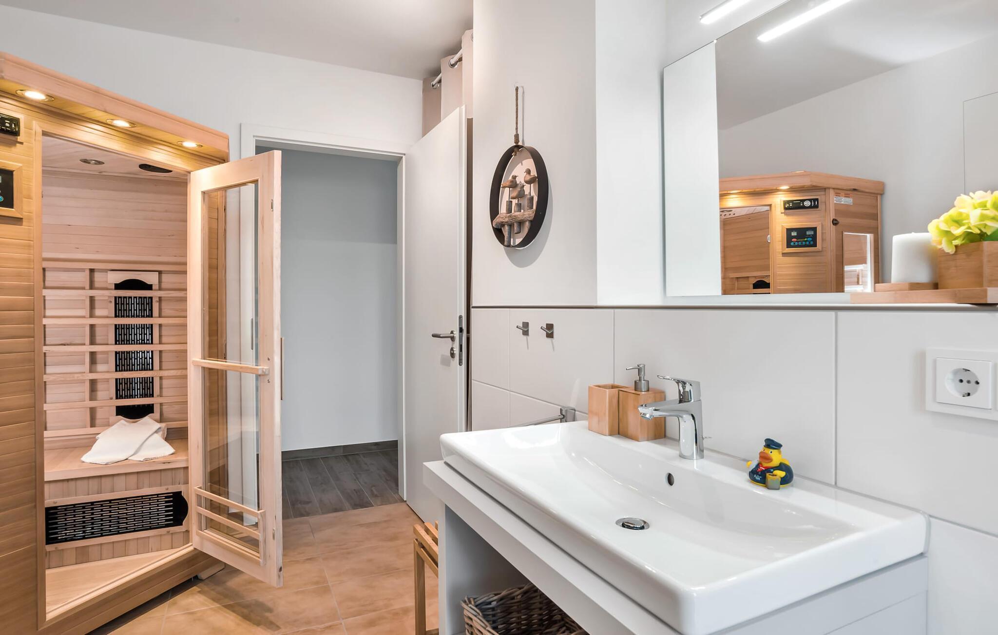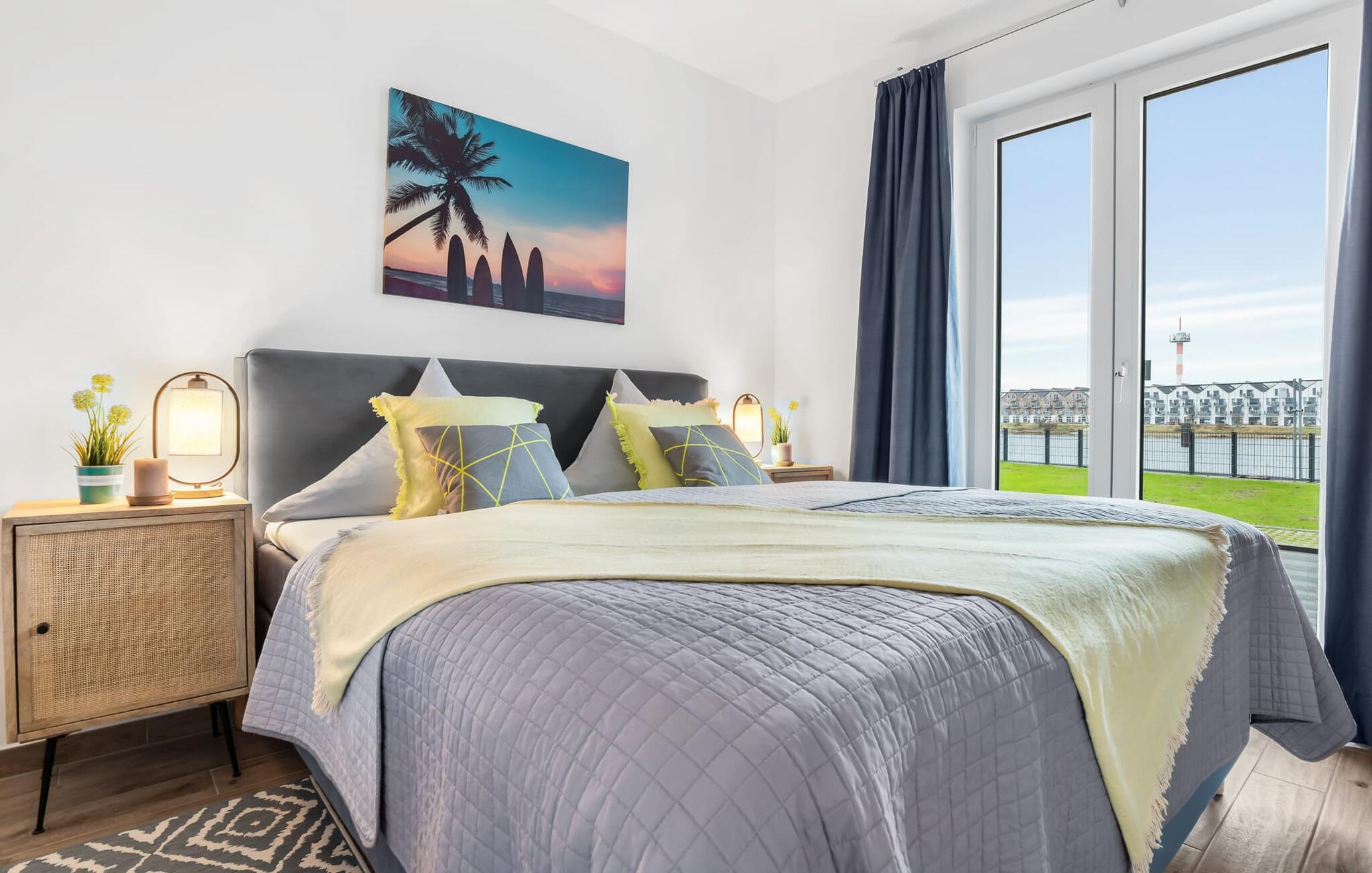 Beliggende direkte på havnebassinet i feriestedet Olpenitz ved Østersøen, med en uhindret udsigt over havnen og ud over Østersøen, inviterer SURFERS LOUNGE jer til at tage på et lokalt krydstogt. Den populære havnepromenade med sine små butikker ligger i gåafstand til slentre og slentre og giver mulighed for at forkæle sig selv med souvenirs og smukke ting. Den åbne stue/spisestue med integreret køkken oversvømmes med lys takket være vinduet fra gulv til loft, og at se de daglige solopgange bliver en uforglemmelig ferieoplevelse. Herfra har gæsten udgang til den store terrasse. Udsigten over havnen, vandet og skibe og den fjerne Østersø giver jer følelsen af at være kaptajn på en lang rejse for en stund. Terrassen strækker sig i en tilspidset form rundt om hele lejligheden og forstærker følelsen af at være på dækket. Stilfulde udendørsmøbler er tilgængelige for at spise eller blot slappe af i denne unikke atmosfære. Opholdsområdet er domineret af et behageligt opholdsområde med fjernsyn og pejs, som formår at forvandle selv uvorne dage til hyggedage. Møblerne i SURFERS LOUNGE er nordisk hyggelige og er understreget med friske BoHo-accenter. Det fuldt udstyrede tekøkken lader intet tilbage at ønske og giver jer lyst til at tilberede lækkerier sammen og derefter nyde dem sammen. Og udsigten til havnen er der altid. To smagfuldt indrettede værelser af høj kvalitet er tilgængelige for passagererne. Det store soveværelse byder på en dobbeltseng. Det andet soveværelse er indrettet med to enkeltsenge og et fjernsyn. En afslappende søvn er garanteret, og de smukke drømme kommer naturligt. Et andet højdepunkt er brusebadet. Ud over alt det nyttige, venter en bruser på gulvniveau og en infrarød kabine på at forkæle gæsterne. Det være sig efter en dag på stormfuldt hav eller en lang dag på stranden. En parkeringsplads ved huset er tilgængelig for jer. Vores favoritsted: start dagen med en solid morgenmad på terrassen med udsigt over havnen og solopgangen... Bemærk venligst: OstseeResort Olpenitz er meget populært, og der bygges fortsat i parken. Ikke desto mindre kan I se frem til en 5-stjernet standard og et førsteklasses ophold. Byggeaktiviteterne kommer ikke til at forstyrre jer på ferien, og derfor gives der ikke yderligere afslag i prisen.
