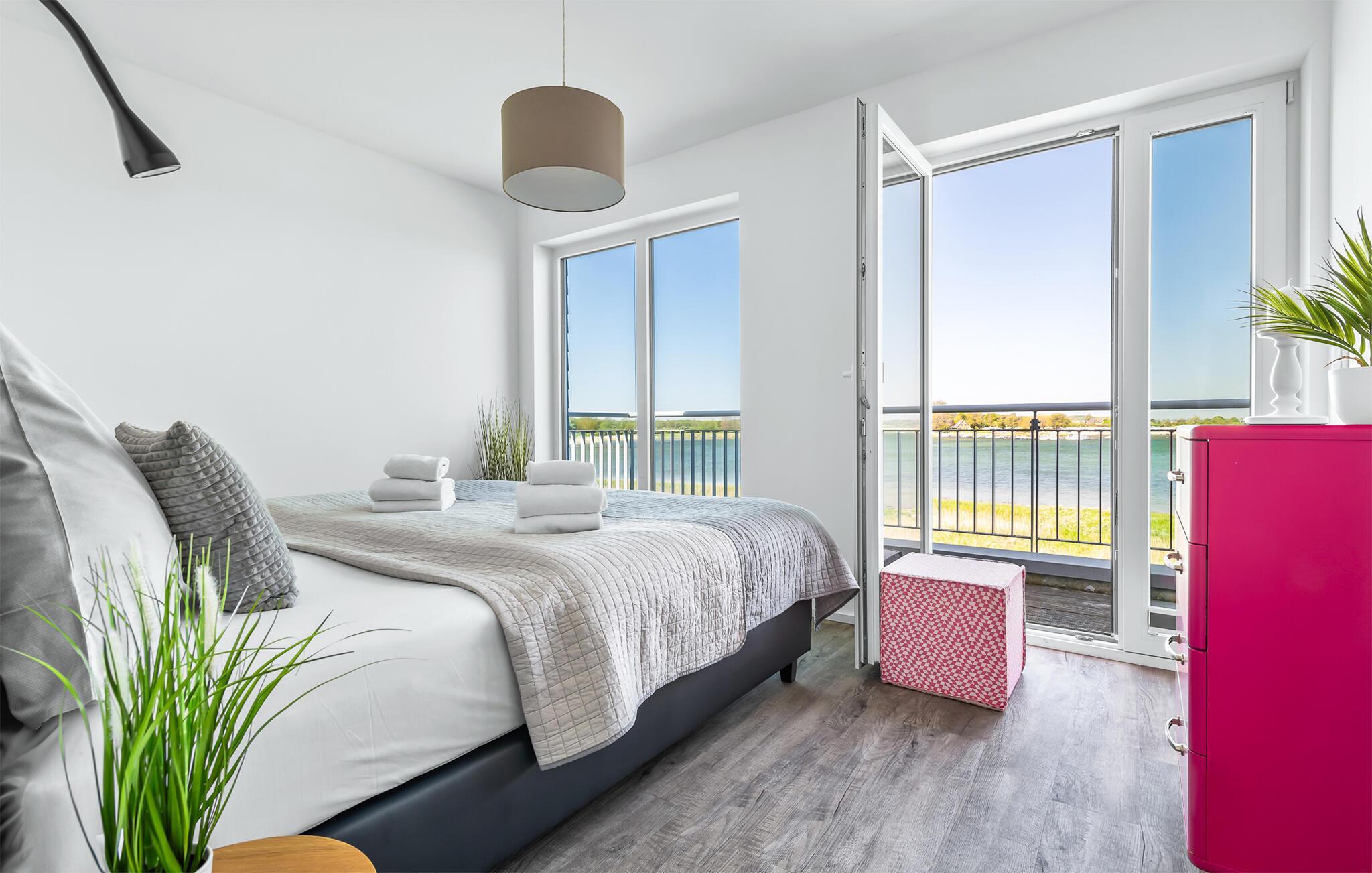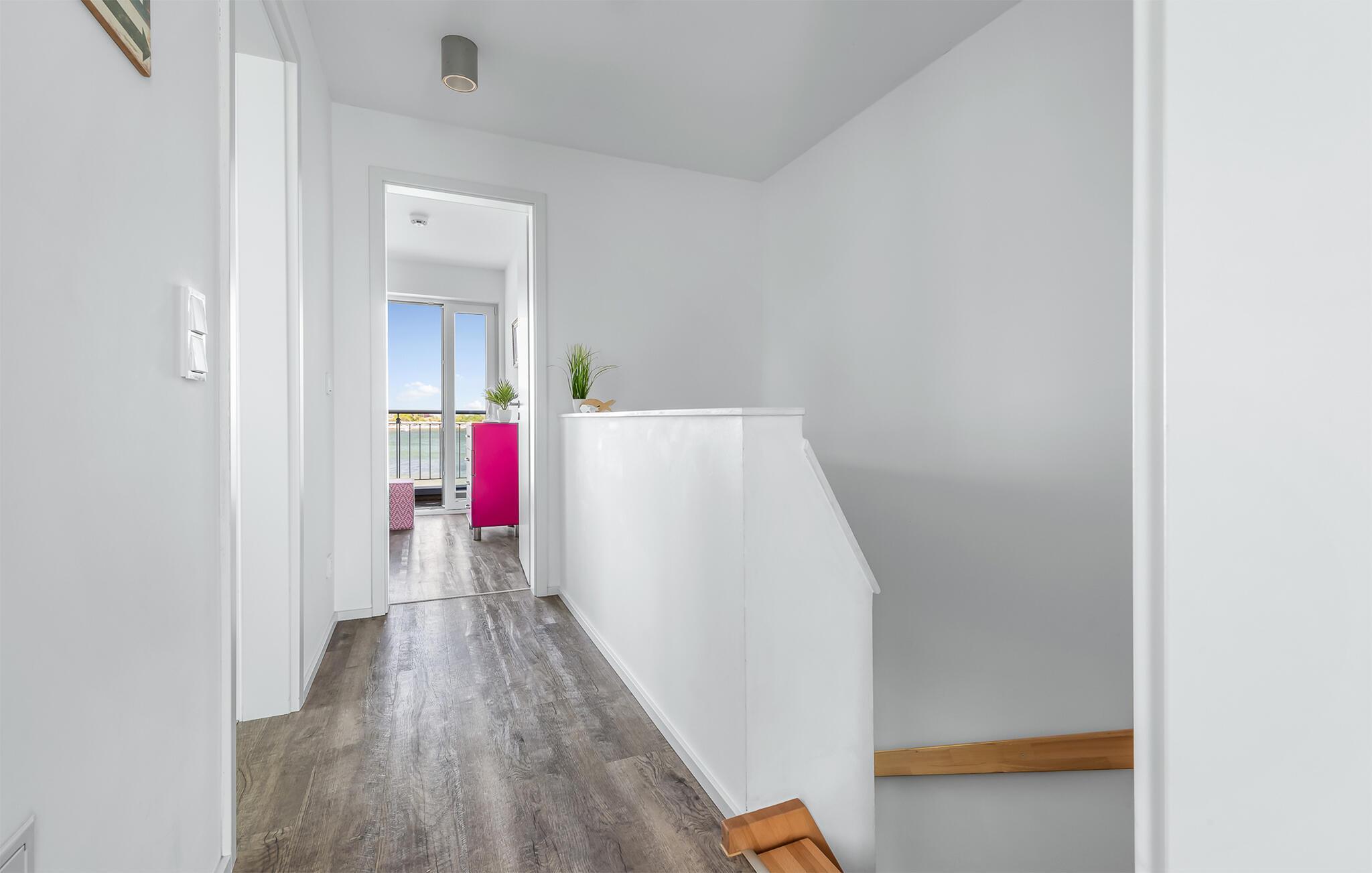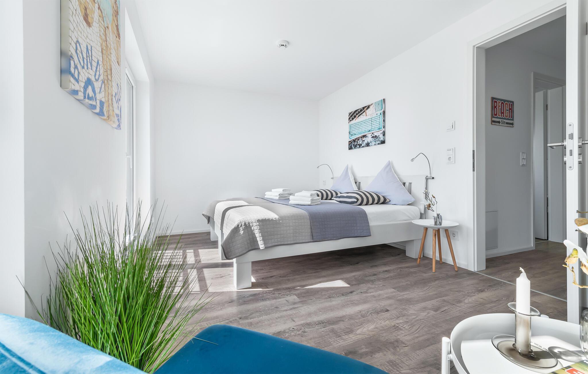 Feriehusets afslapningsområde er på første sal. Gæsterne kan falde i søvn i to soveværelser og vågne op til udsigten over vandet. Det store soveværelse vender ud mod Schlei og er indrettet med en dobbeltseng. Med en morgenkaffe kan du se ænder, gæs og østersfangere vågne op på den tilstødende terrasse, mens sivene fra Schleiufer svajer blidt i vinden. Det andet soveværelse har udsigt over lystbådehavnen og har to enkeltsenge, der kan skubbes sammen.