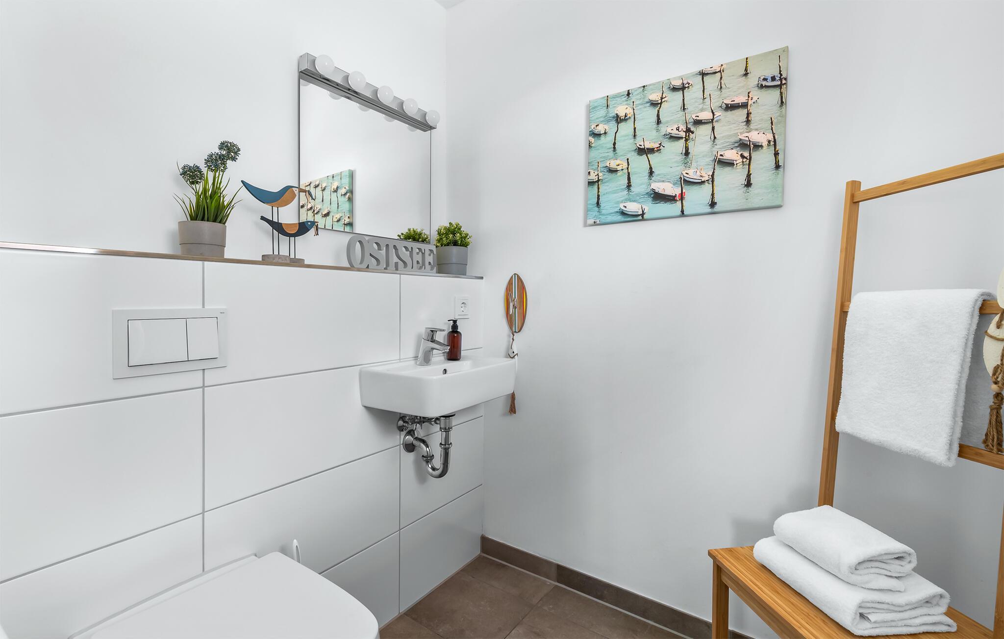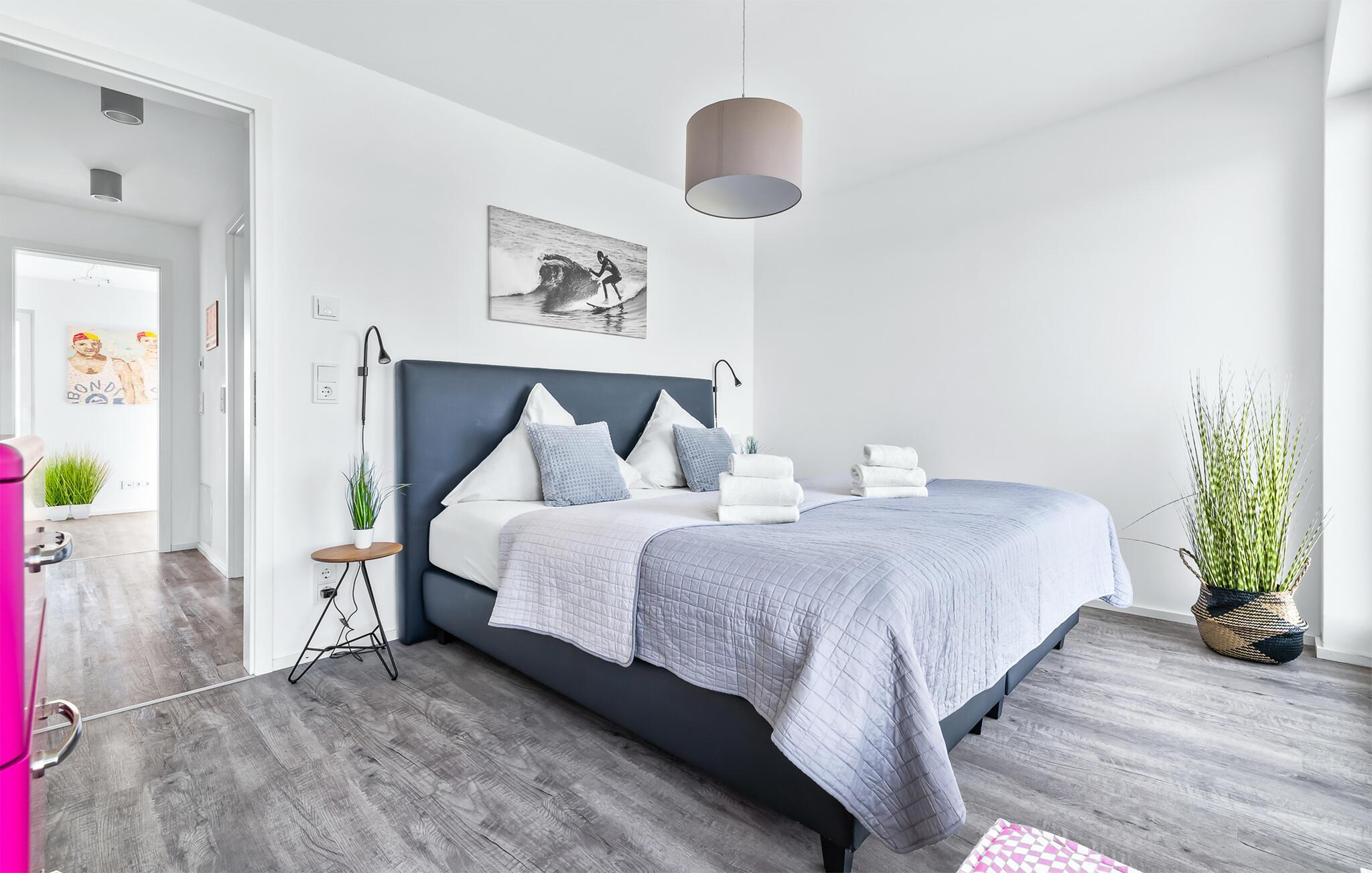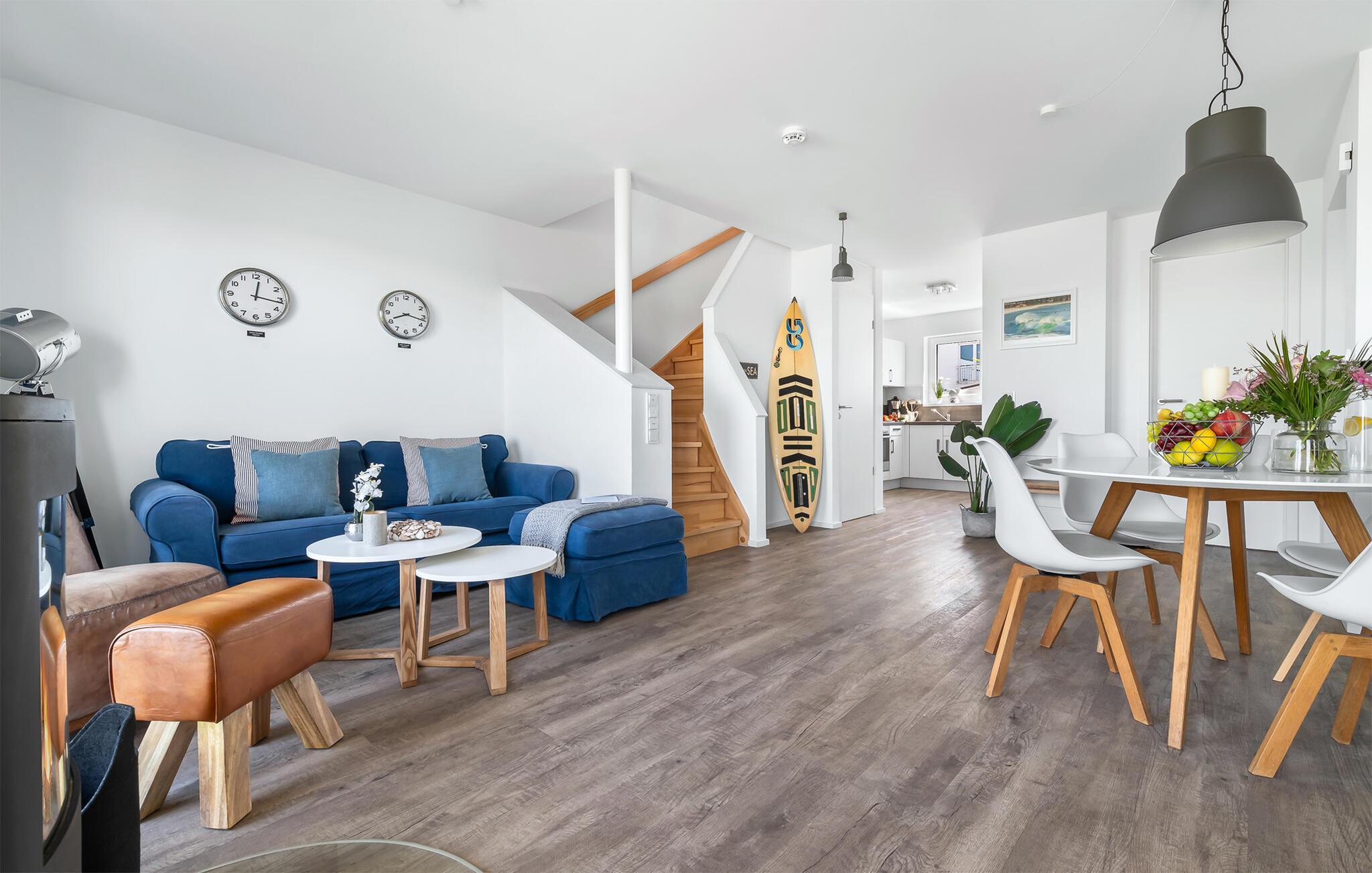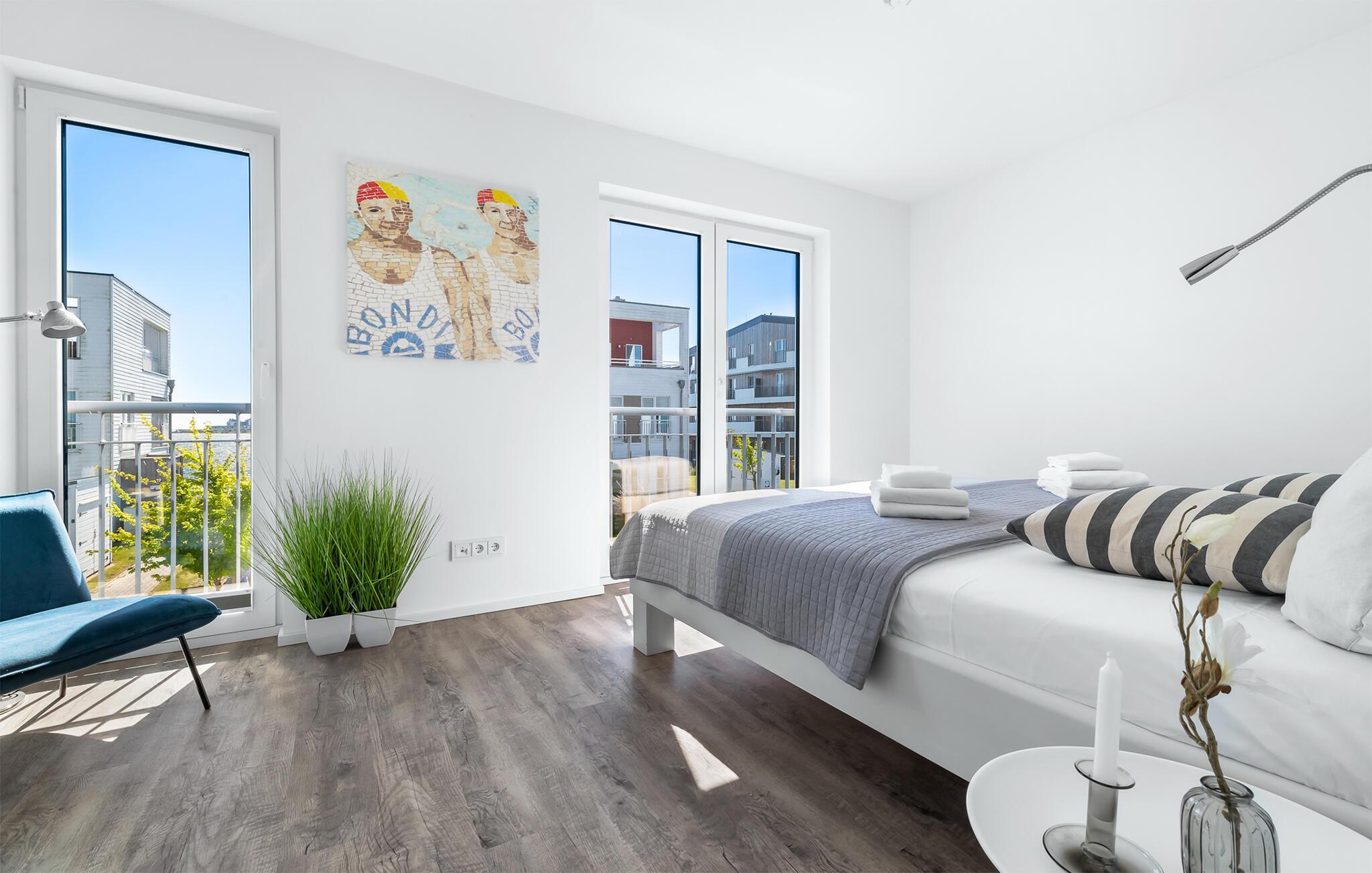 Feriehusets afslapningsområde er på første sal. Gæsterne kan falde i søvn i to soveværelser og vågne op til udsigten over vandet. Det store soveværelse vender ud mod Schlei og er indrettet med en dobbeltseng. Med en morgenkaffe kan du se ænder, gæs og østersfangere vågne op på den tilstødende terrasse, mens sivene fra Schleiufer svajer blidt i vinden. Det andet soveværelse har udsigt over lystbådehavnen og har to enkeltsenge, der kan skubbes sammen.