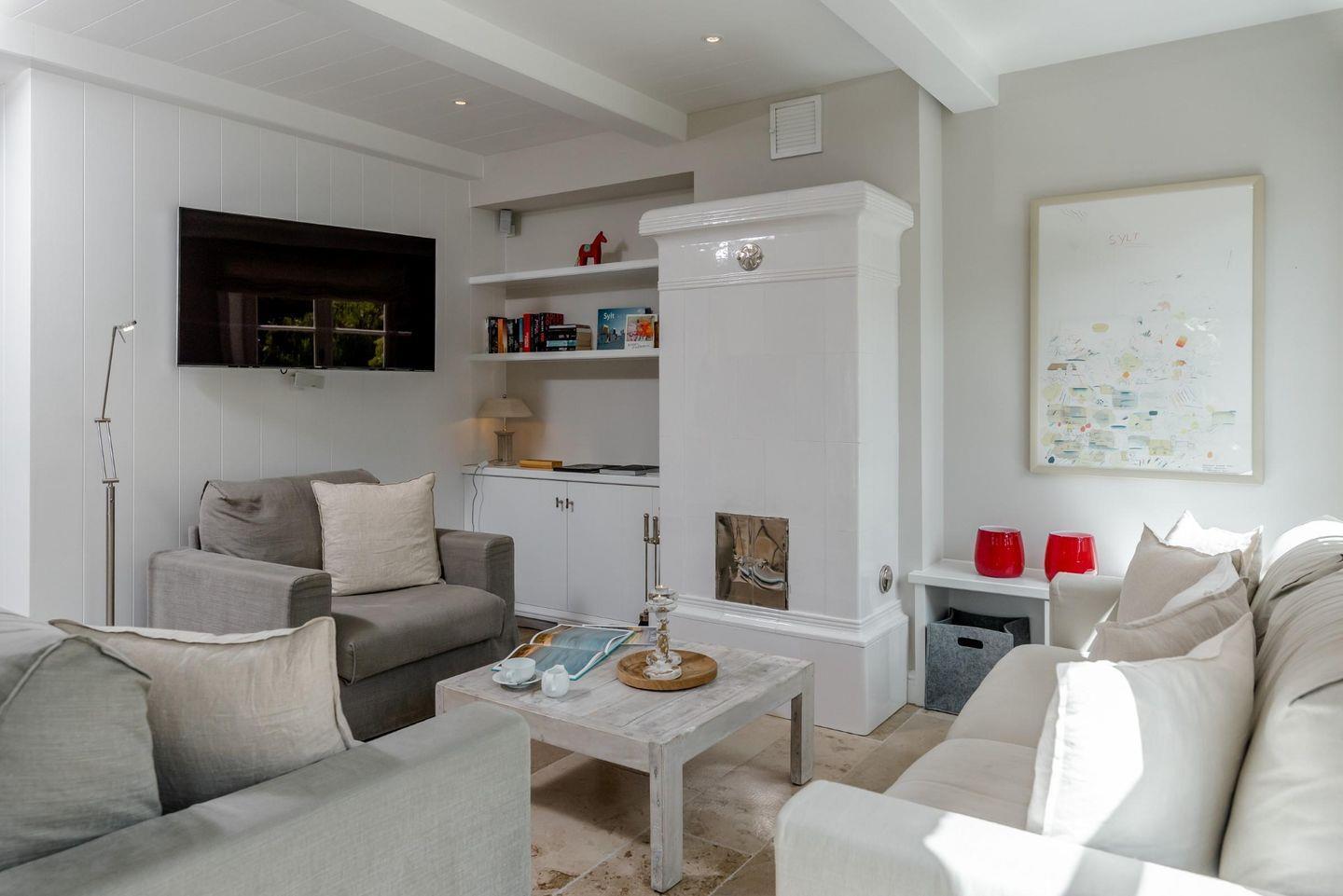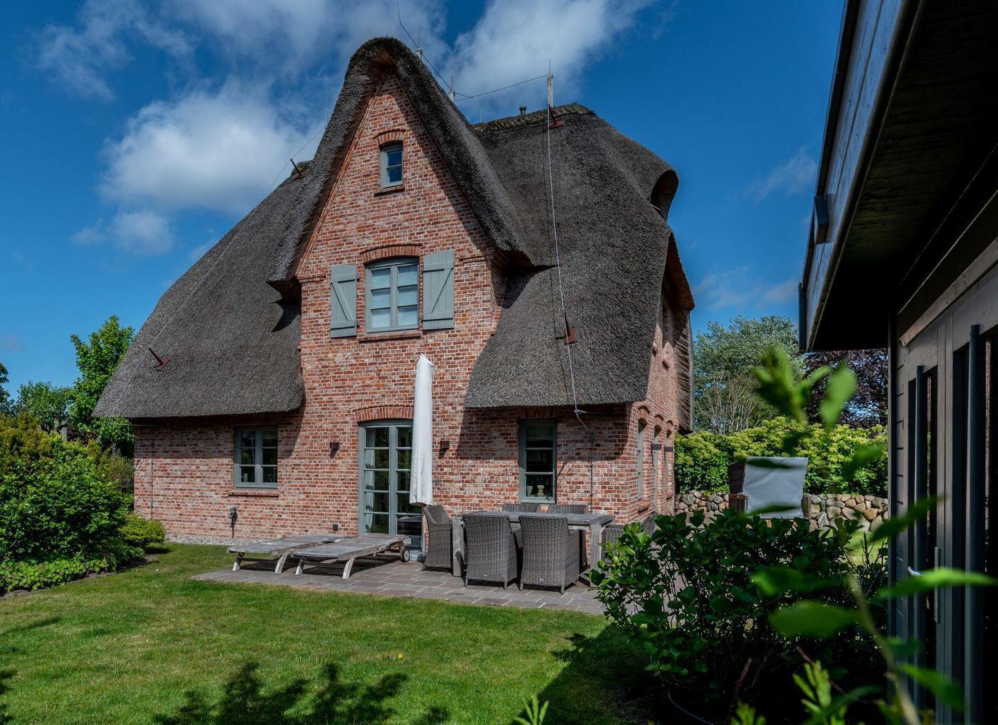 Diese traumhafte Doppelhaushälfte unter Reet bietet alles, was einen besonderen Sylt-Urlaub ausmacht. Die hellen Farben und die erlesene Materialauswahl und bezaubernde Antiquitäten im Schweden-Stil verleihen den Räumen ein warmes und behagliches Ambiente. Zahlreiche Tischlereinbauten begeistern in allen Räumen. Vor dem historischen Kachelofen können Sie es sich mit einem spannenden Buch oder einem romantischen Gläschen Wein gemütlich machen. Die gekonnt vom Tischler verbaute moderne BOSE 5.1-Soundanlage verwandelt den Wohnraum bei Bedarf in einen Konzertsaal. Im Obergeschoss erwarten Sie zwei Schlafzimmer und zwei hochwertige Bäder mit Bewegungsmeldern für Schummerlicht, Einbauradios, beheizten Handtuchhaltern und Regenduschen. Die großzügige Sauna schafft eine Wellness-Atmosphäre. Die große Südwest-Terrasse ist bestens geeignet für erholsame Sonnenstunden an der Sylter Luft.